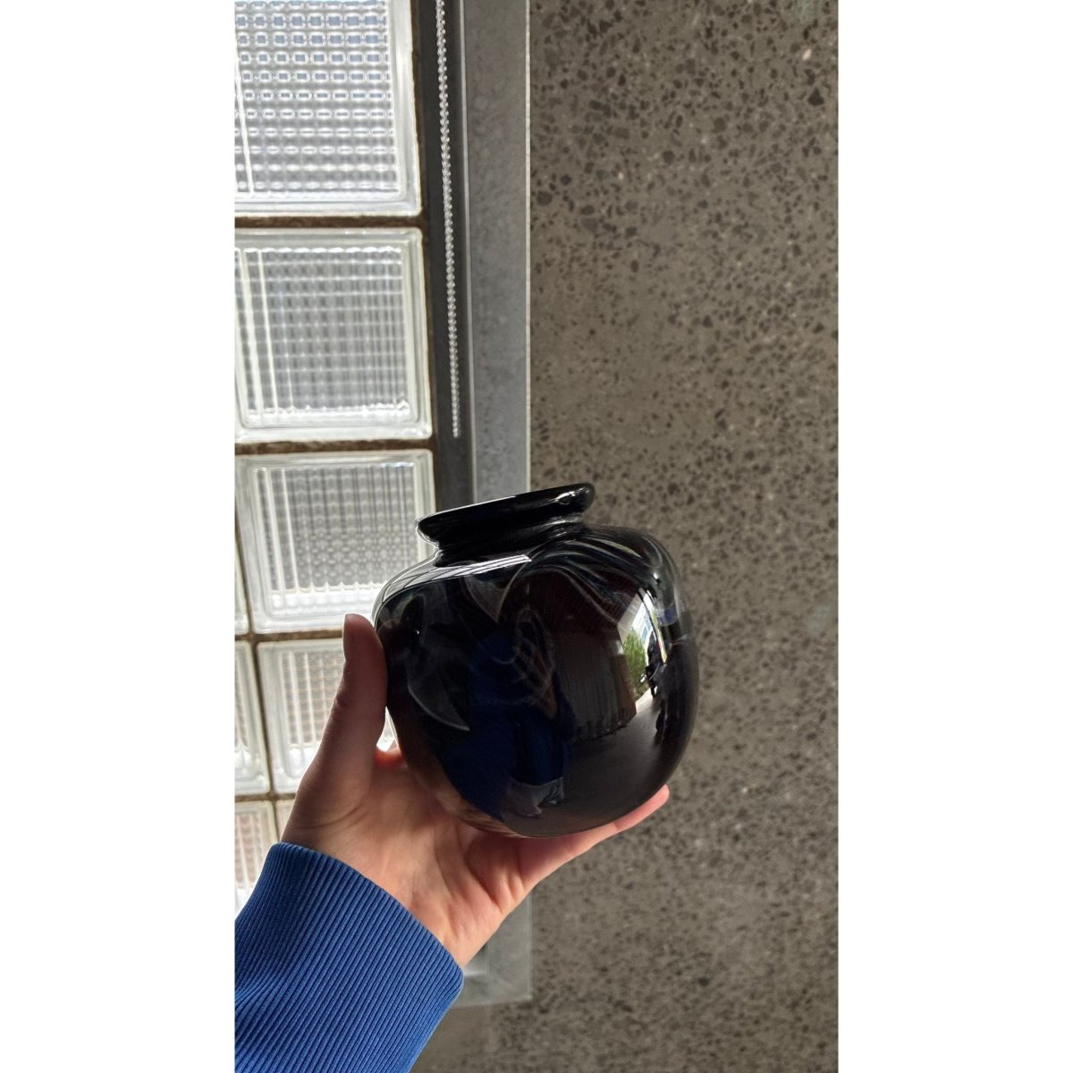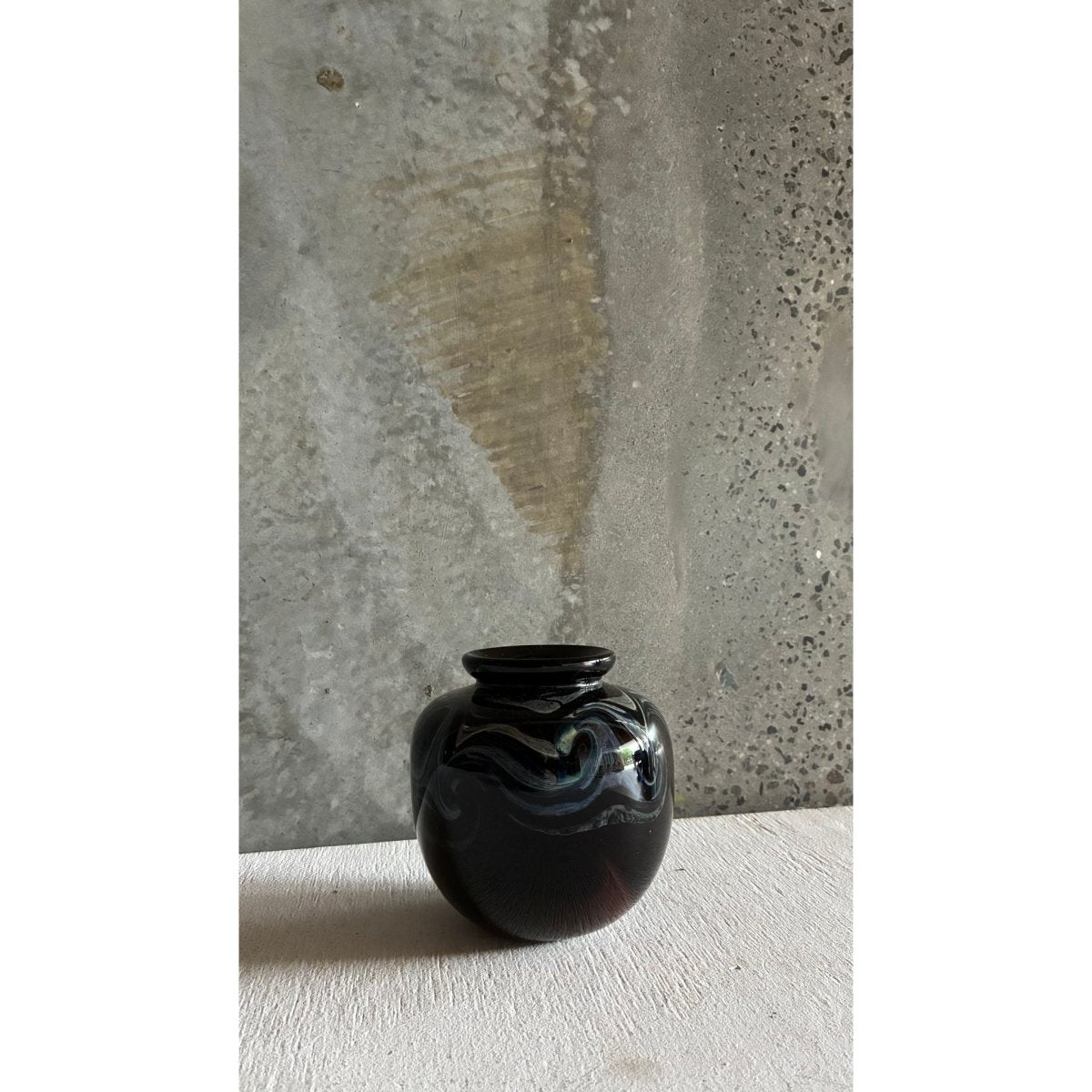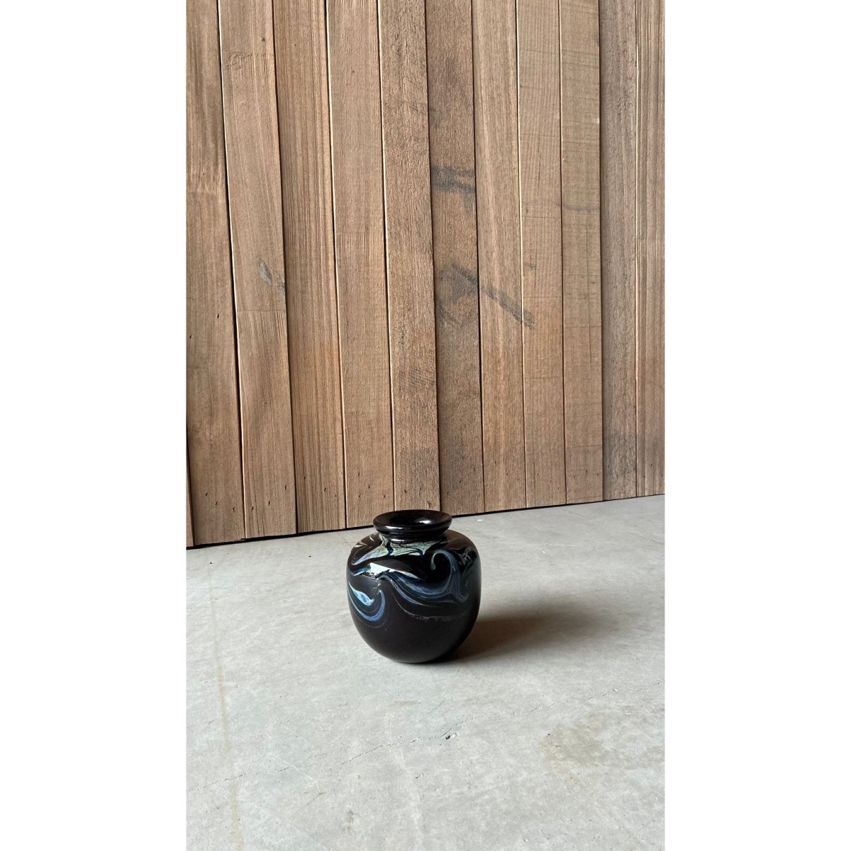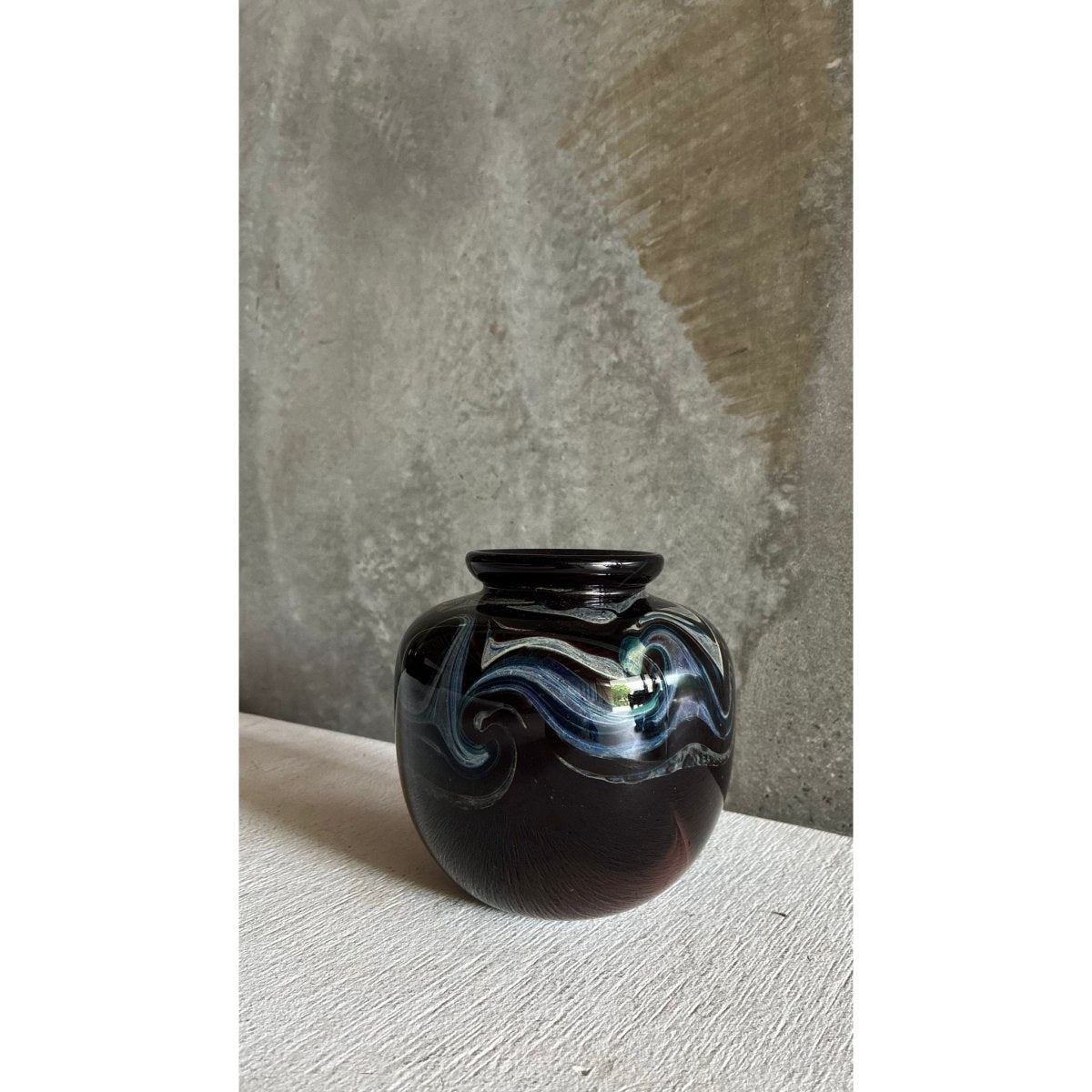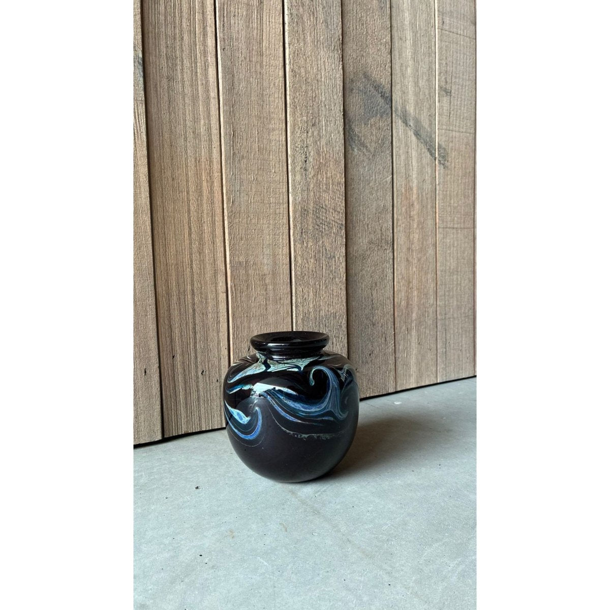 A sculptural studio-made glass vase with a deep inky base and soft hand pulled blue swirls. The feathered wave pattern is created by manipulating molten glass, giving the piece an expressive, fluid movement unique to handmade studio work.