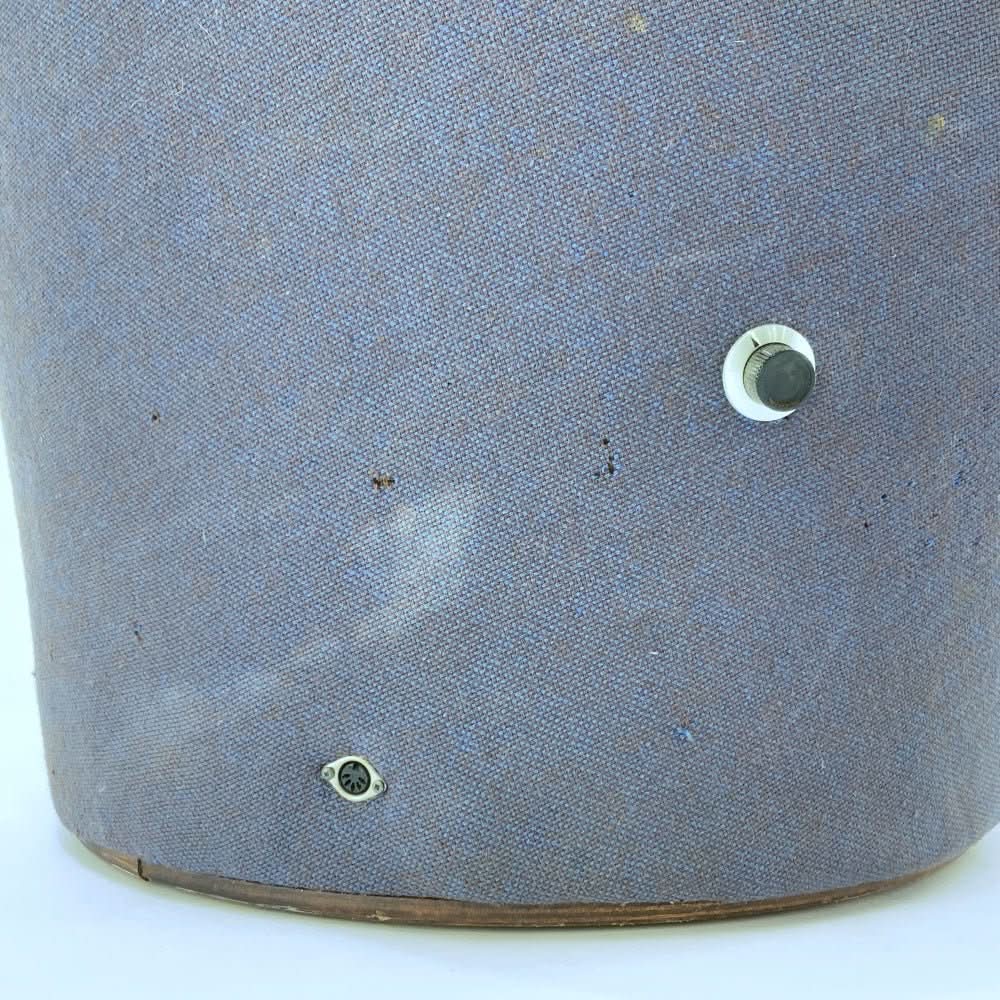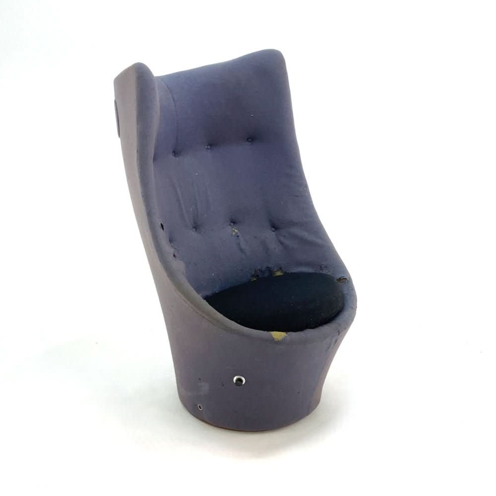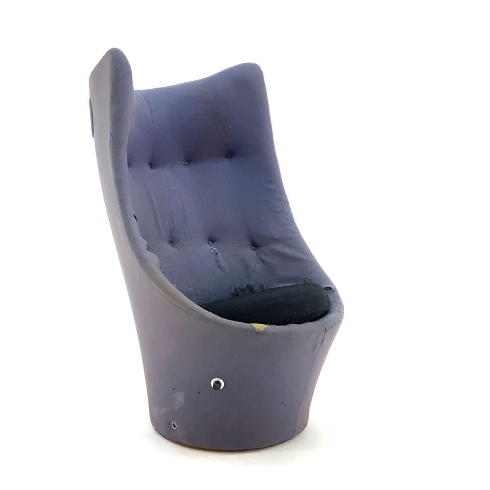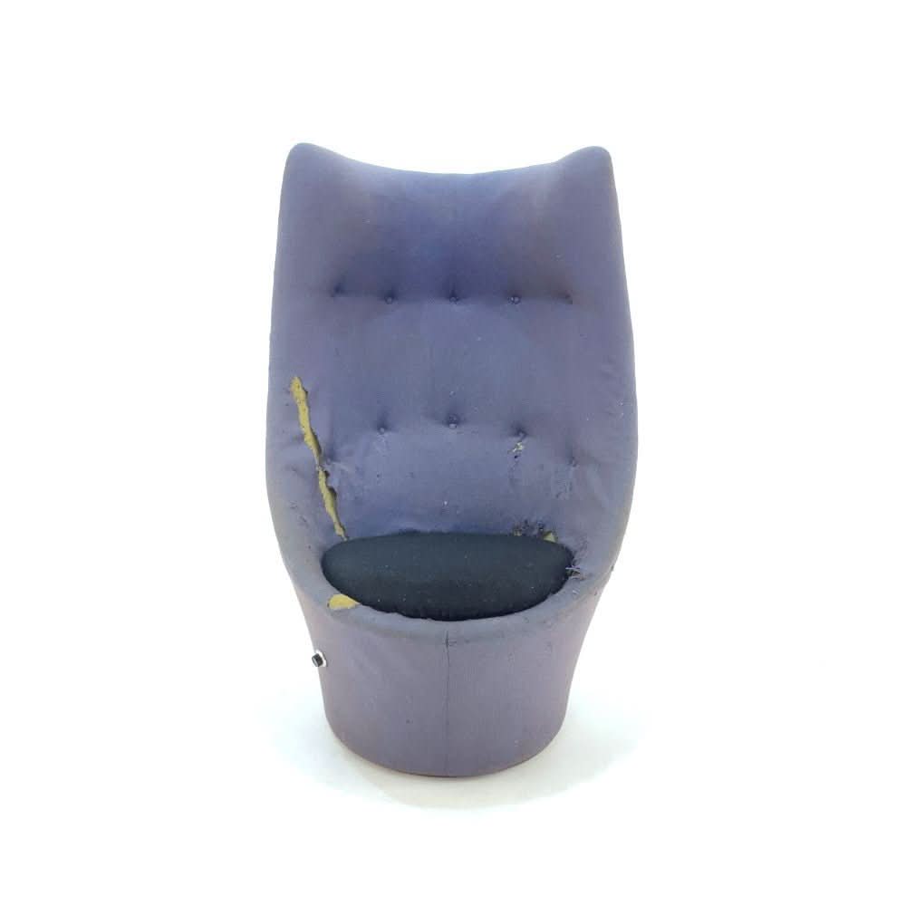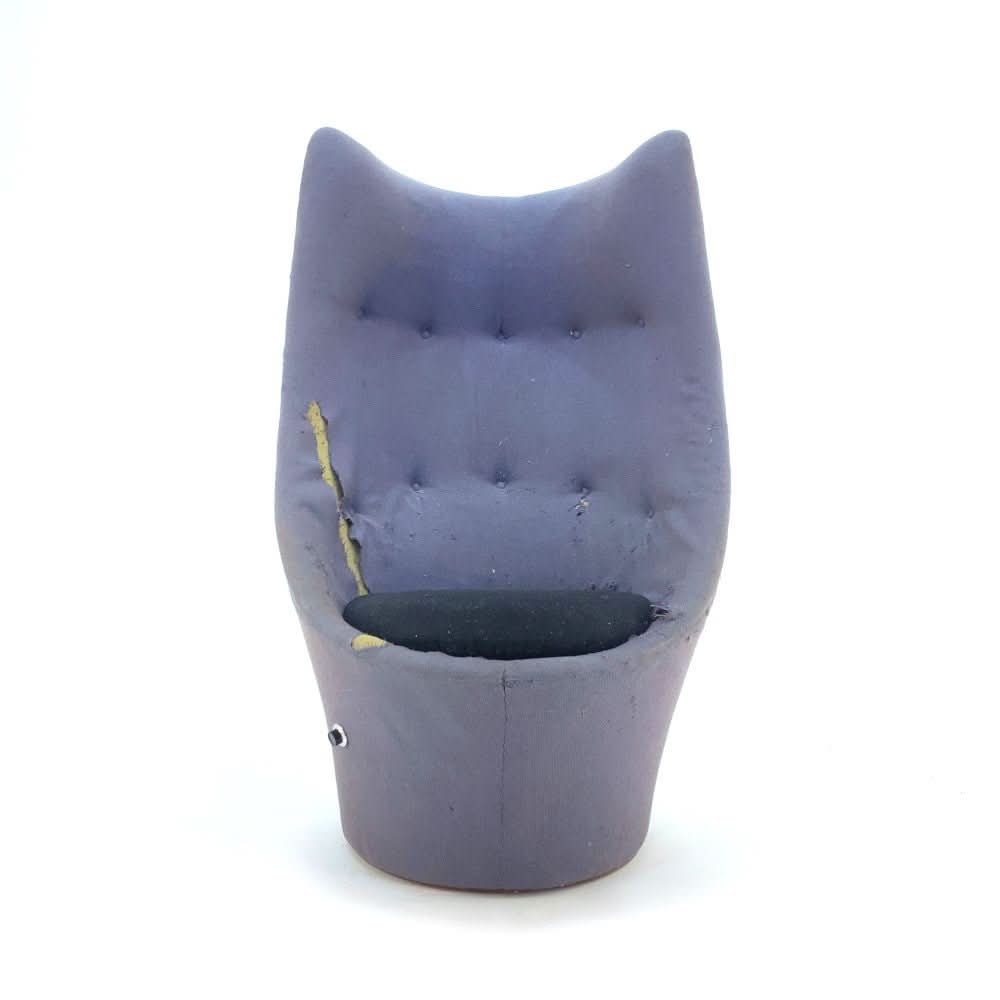 The sound chair was made by moulding the shell in expanded rigid polystyrene, which was then upholstered in polyurethane foam and wool. The headrest, back and base were constructed in one continuous circular form, with a winged back. A circular seat of polyurethane was set into the base of the frame and two speakers were fitted to the internal shell in the head bolster.