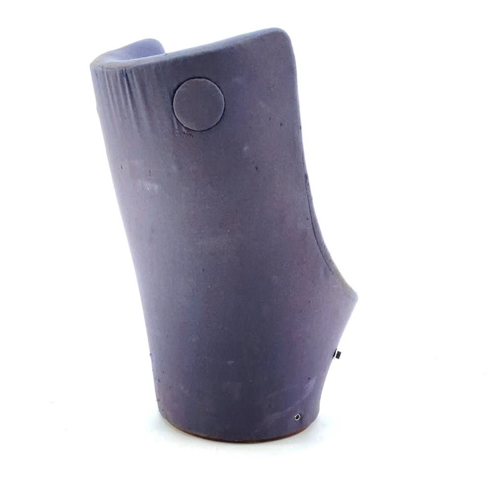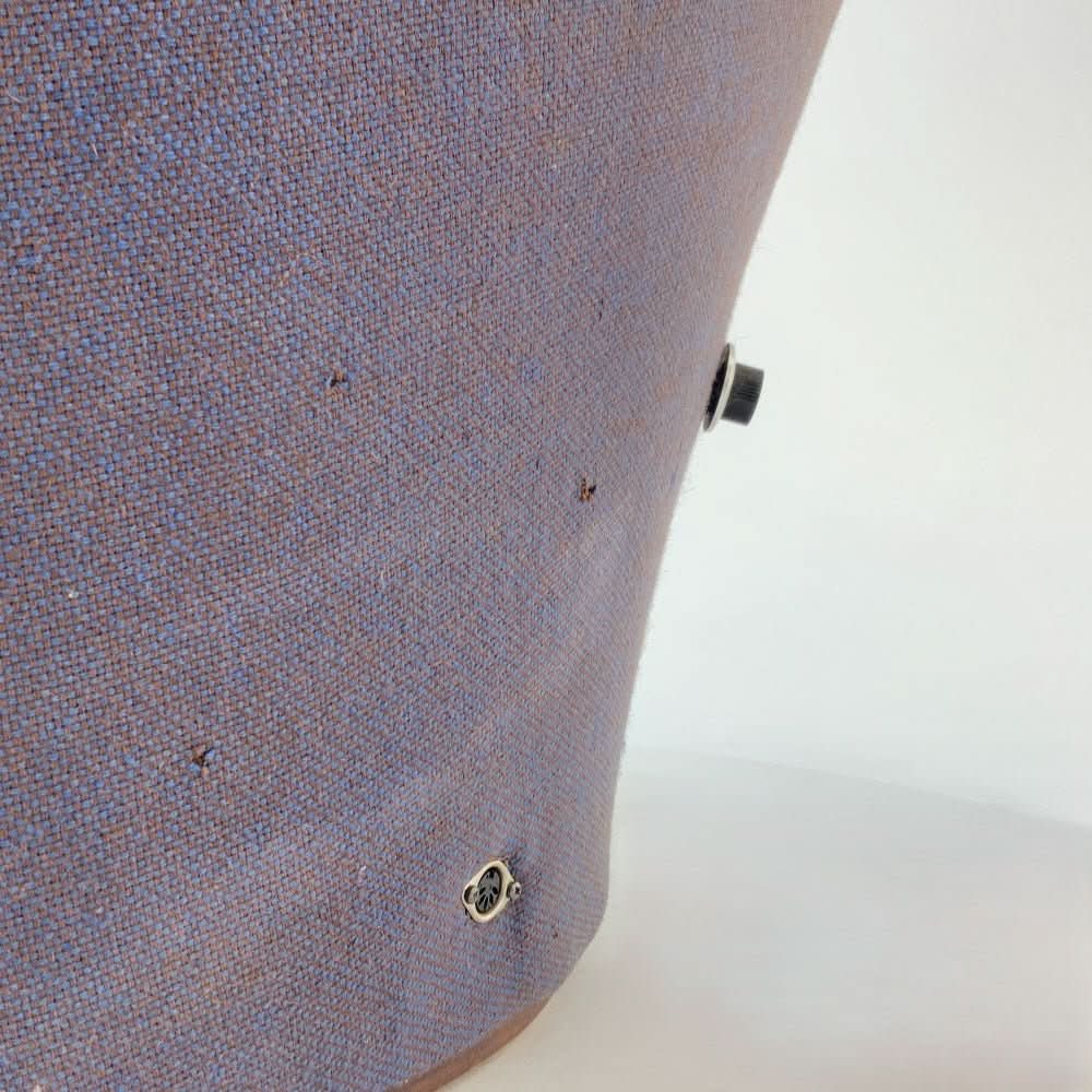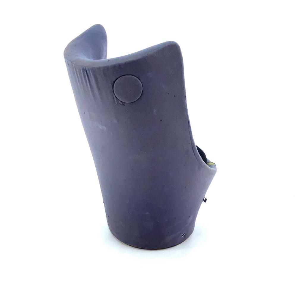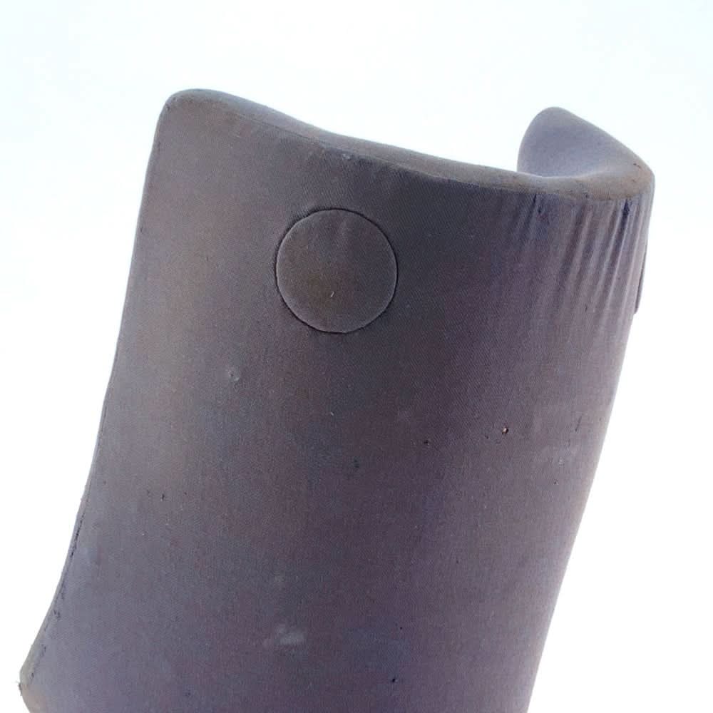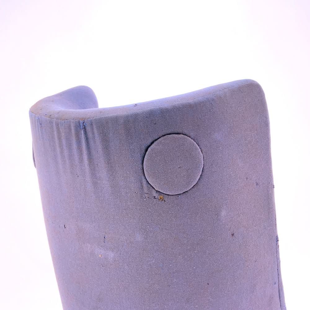 The sound chair was made by moulding the shell in expanded rigid polystyrene, which was then upholstered in polyurethane foam and wool. The headrest, back and base were constructed in one continuous circular form, with a winged back. A circular seat of polyurethane was set into the base of the frame and two speakers were fitted to the internal shell in the head bolster.