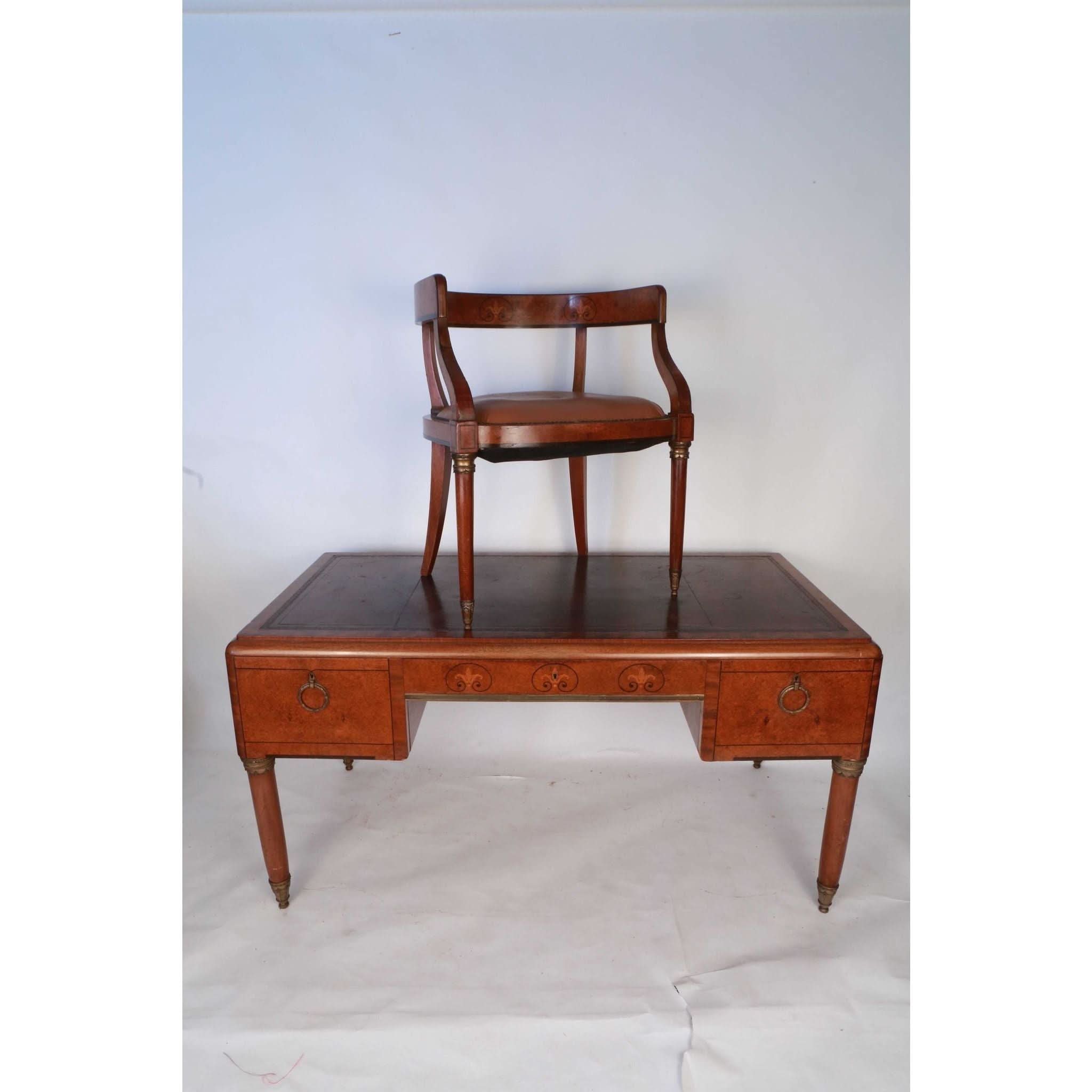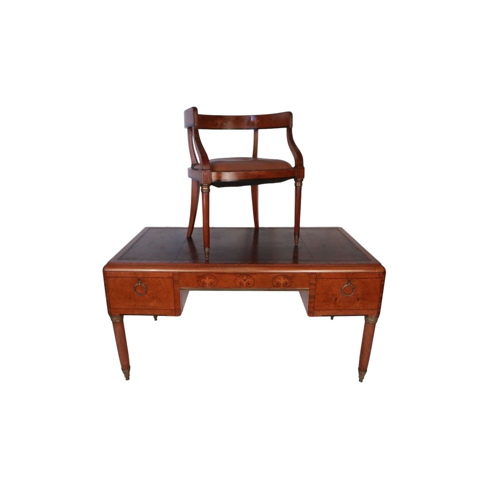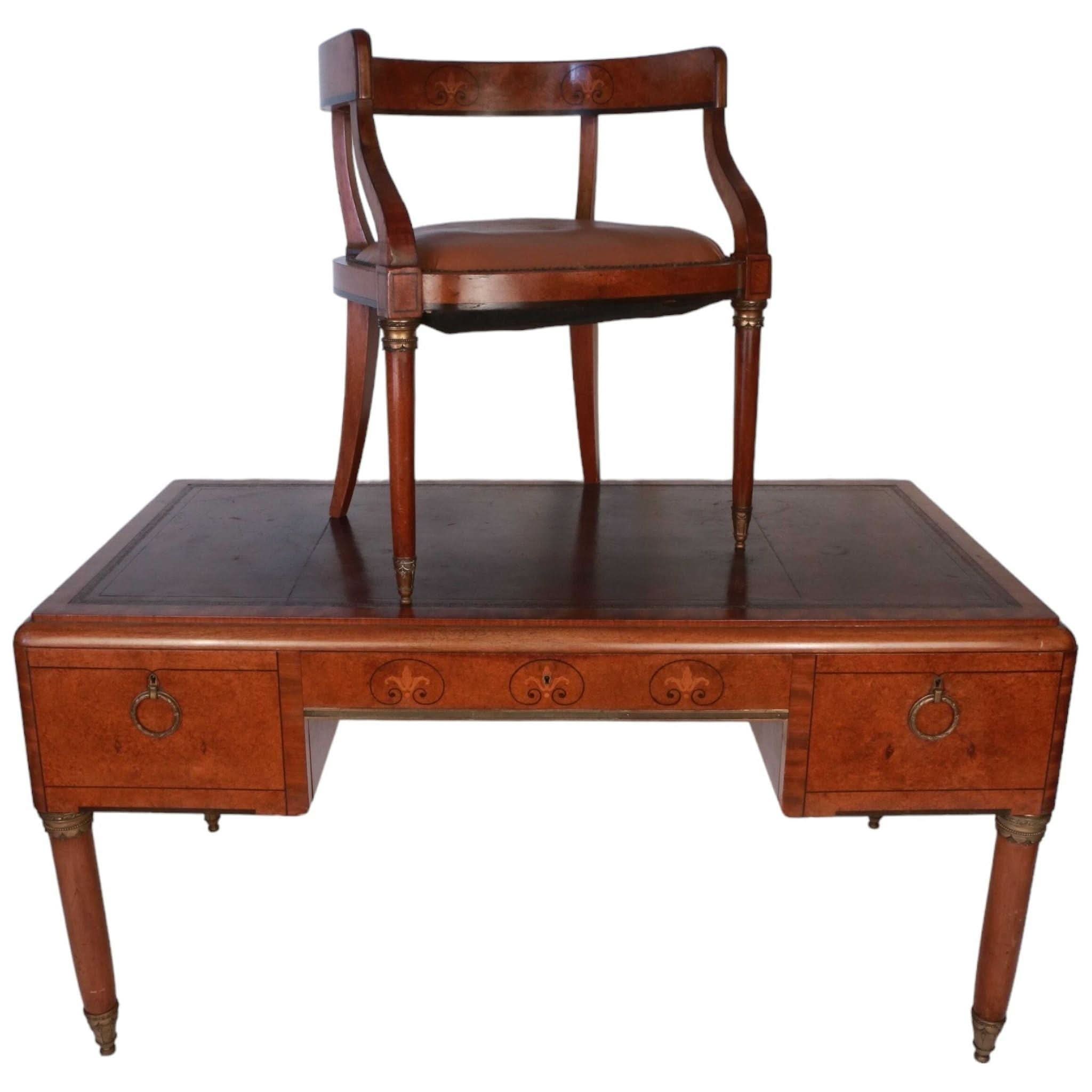 This is a most attractive and stylish, very practical, genuine and classic French, 1930s Art Deco period Writing Desk with a classic Empire stylistic influence and is complete with its original desk Chair. The desk is rectangular in form and is constructed from and lined with quality French Oak and is then finished in rare and exotic honey coloured Amboyna as is the Chair. The desk has a cross banded edge top with a recessed inset top tooled leather writing surface plus has a full width knee hole drawer and deep drawers on either side which form the semi pedestals, with one drawer having an internal well fitted lockable compartment within. The other side of the desk is an identical ‘mirror image’ visually except the drawers are ‘faux’. The desk does not necessarily have to be placed against a wall as being double sided it is finished on all sides and is embellished all round with brass strip inlay, cross bandings, Ebony line inlays brass drawer pull handles, geometric inlays to the drawer fronts and inlaid fruit wood swags to the side panels. The legs are corner positioned turned and tapered with cast brass mounts top and bottom.