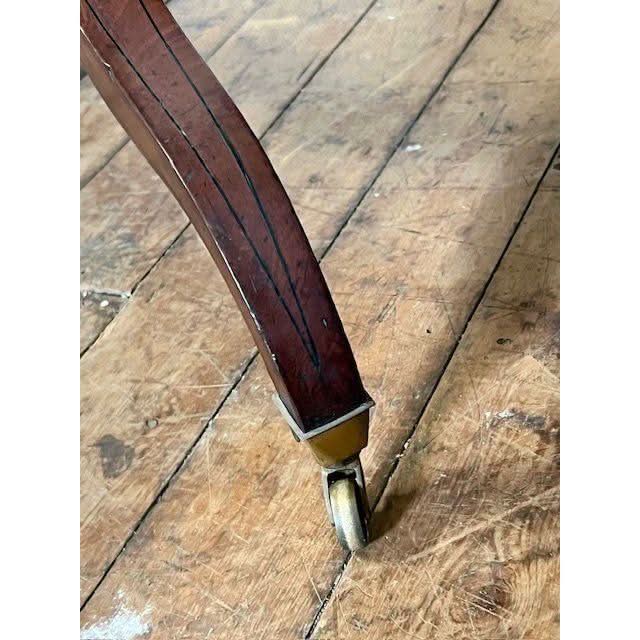 The whole is supported on two vertical end flat tressles connected by a turned stretcher. The end tressles diverge at the bottom into pairs of outward swept then downward swept tapering legs which terminate in original all brass castor assemblies. The legs feature Ebony line inlays possibly in respect to the passing of King George III.