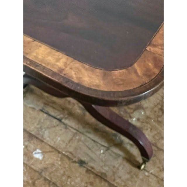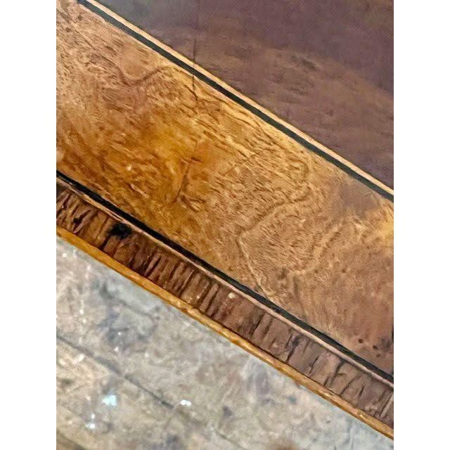 This table is finished in prestigious imported Central American Mahogany and is embellished by the inclusion of lighter outer broard banding of Satinwood and finer perimeter Rosewood cross banding along with Satinwood / Fruitwood and Ebony fine line inlays.