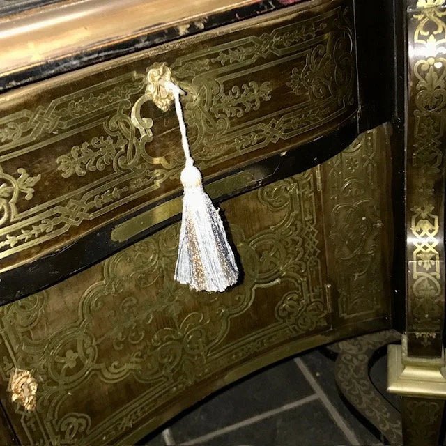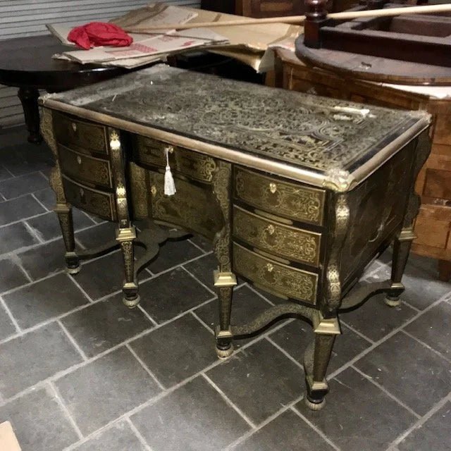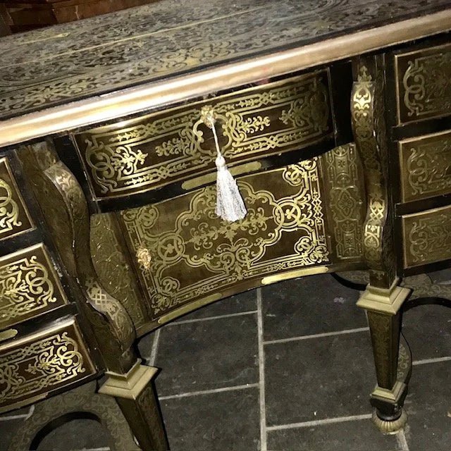 This is a very rare find. It is a genuine antique 19th century French Desk in the famous Andre Boulle manner. This style of desk was originally designed and made for the Cardinal Mazarin who was the Chief Minister of France in the mid 1600s.