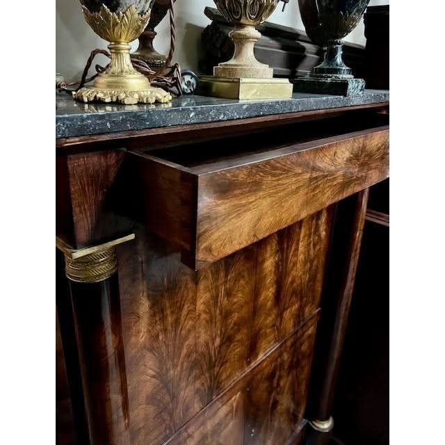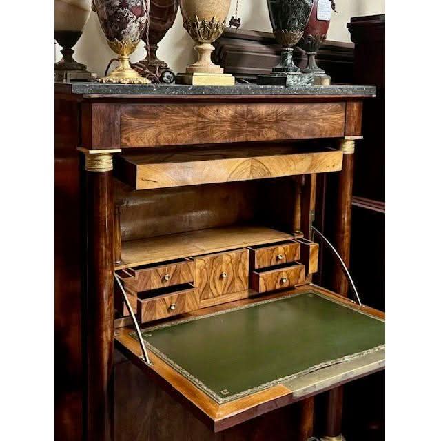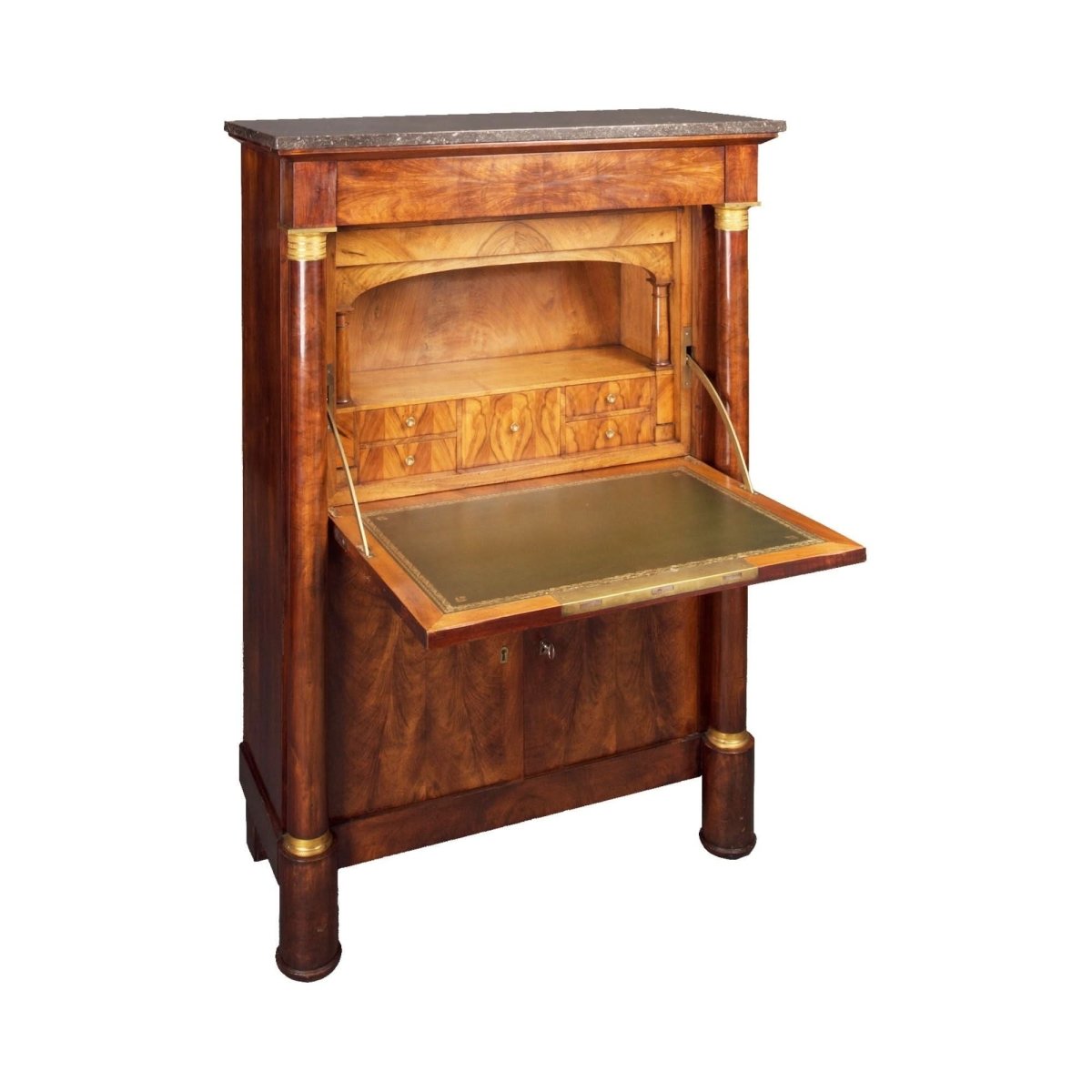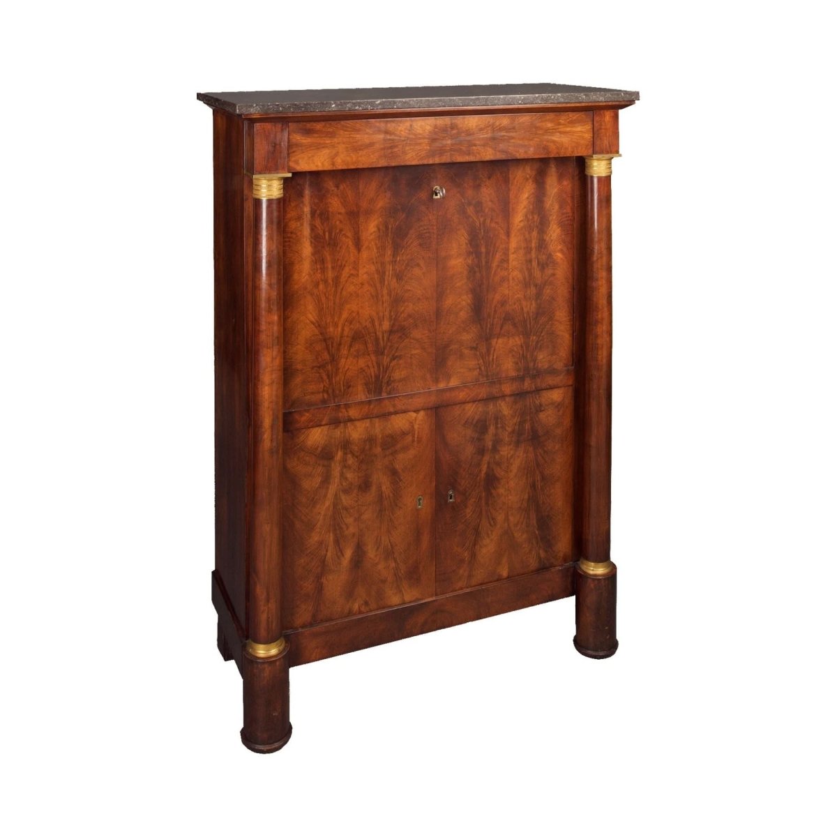 This is a very fine quality example of an excellent quality genuine antique French 19th century Secretaire a Abattant in the Ist Empire early 1800 manner and beautifully finished in book leaf matched ‘feathered’ Mahogany. Externally the cabinet features a grey marble top beautifully figured book leaf matched upper and lower front panels and full height turned free standing columns with classical gilt bronze capitols and complimentary gilt bronze rings at their bases and above the cylindrical feet.