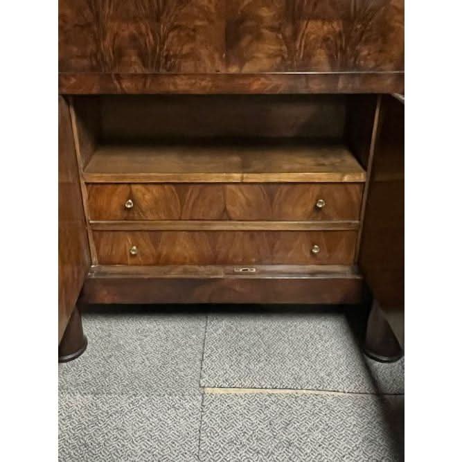 The interior of the desk section is contrasting being in pale ‘book leaf’ matched figured Walnut and the whole interior is very well fitted and finished. There is a full width secret top drawer with an open area beneath. Below again are a bank of drawers with a double depth centre drawer and two stacked drawers on either side. On the outer sides of the stacked drawers are two secret spring loaded compartments accessed by pressing lower timber panels thus creating eight drawers and compartments in all. When the drop front is lowered it reveals the rectangular writing surface with inset gold tooled green leather.