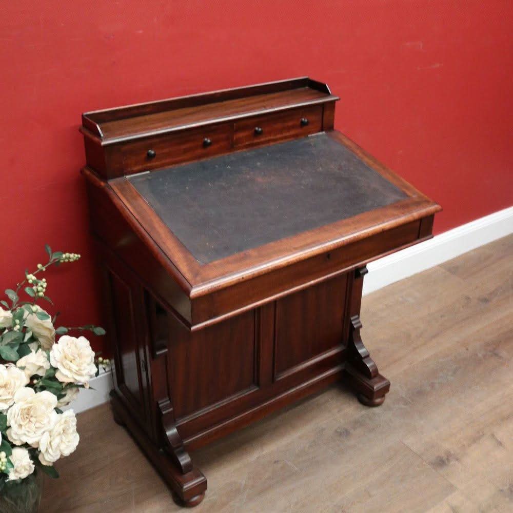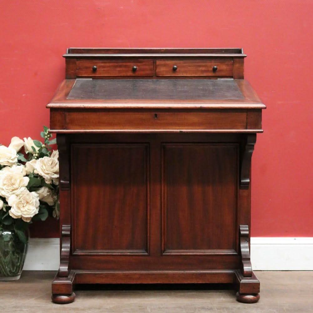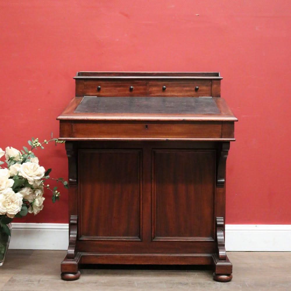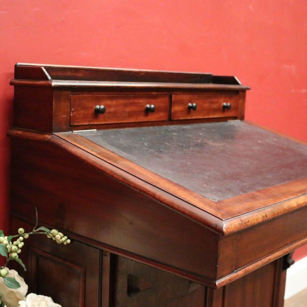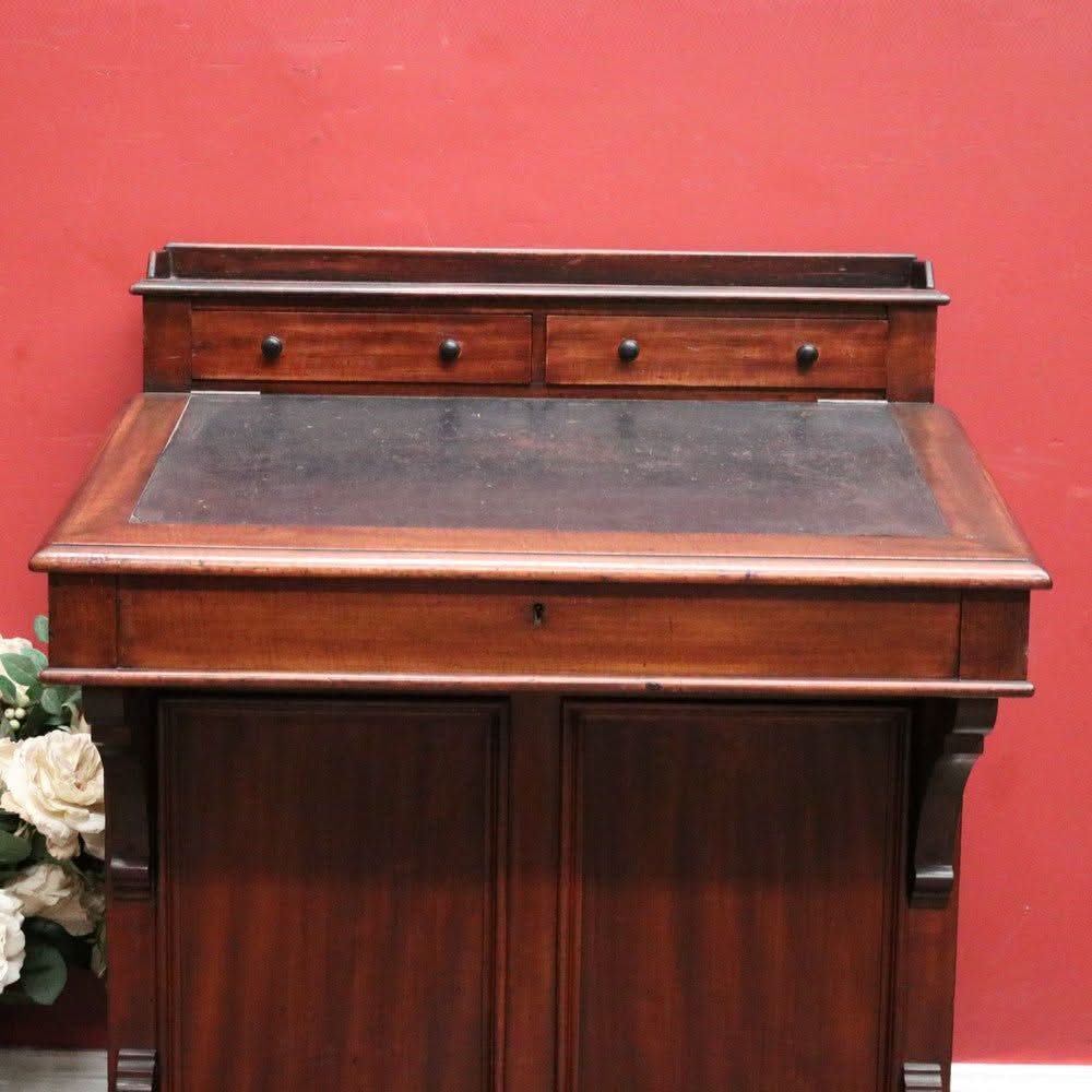 Description: Antique mahogany Davenport desk with a black leather writing slope. Each side opens with its key, revealing a shelf inside. The desk features two external drawers and eight internal pigeonholes beneath the liftable writing slope. Offering ample leg room, the desk sits comfortably at 64 cm from the floor to the underside.
