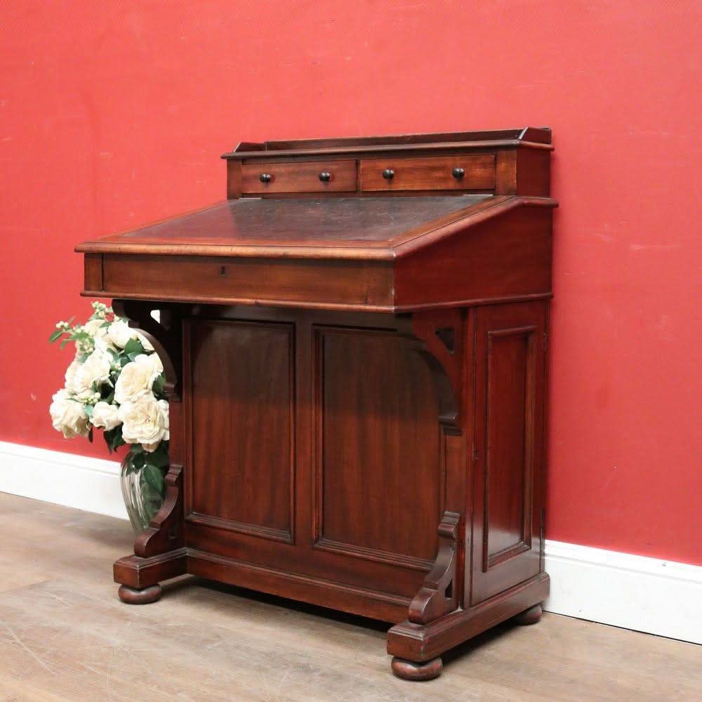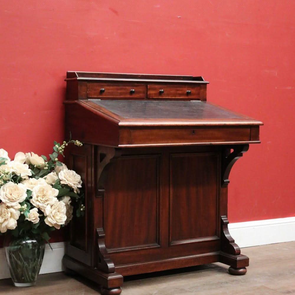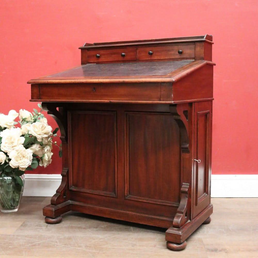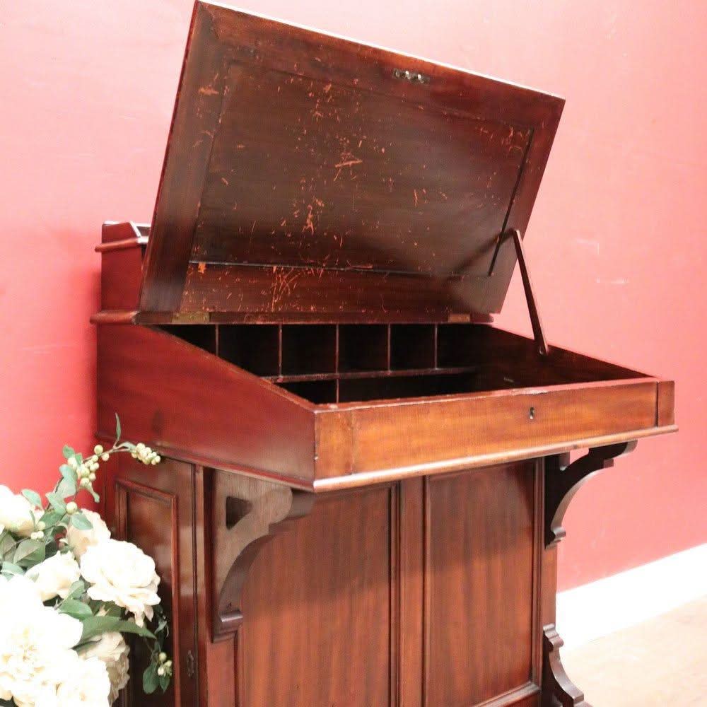 Description: Antique mahogany Davenport desk with a black leather writing slope. Each side opens with its key, revealing a shelf inside. The desk features two external drawers and eight internal pigeonholes beneath the liftable writing slope. Offering ample leg room, the desk sits comfortably at 64 cm from the floor to the underside.