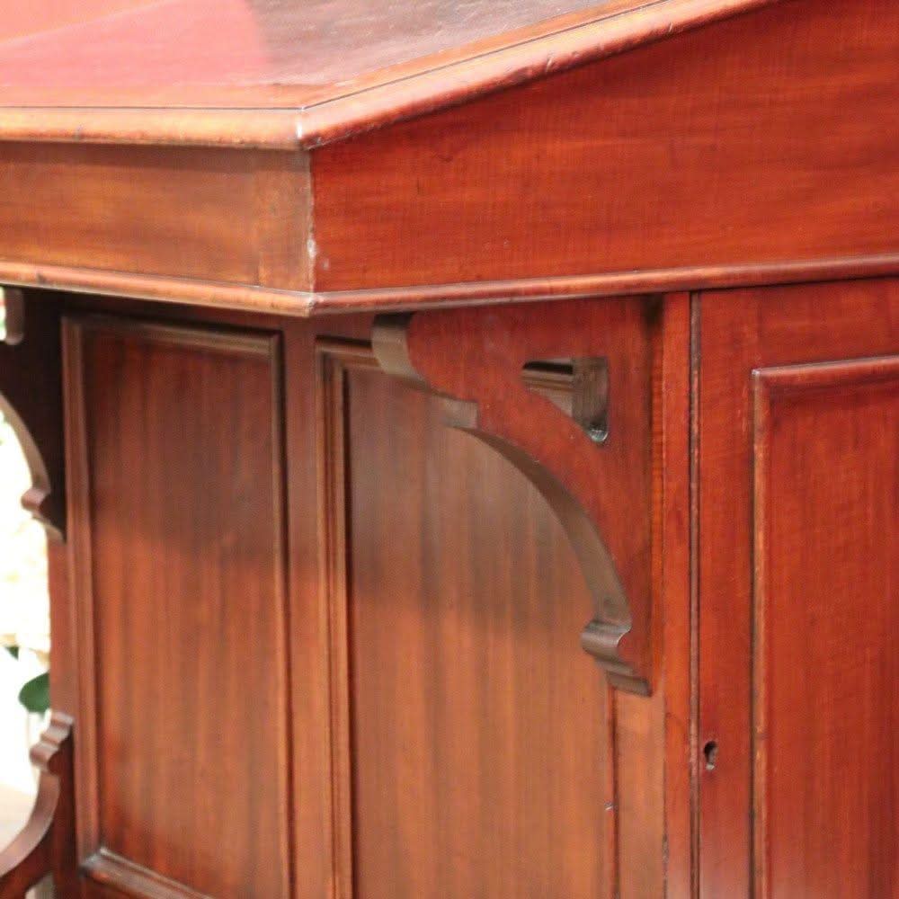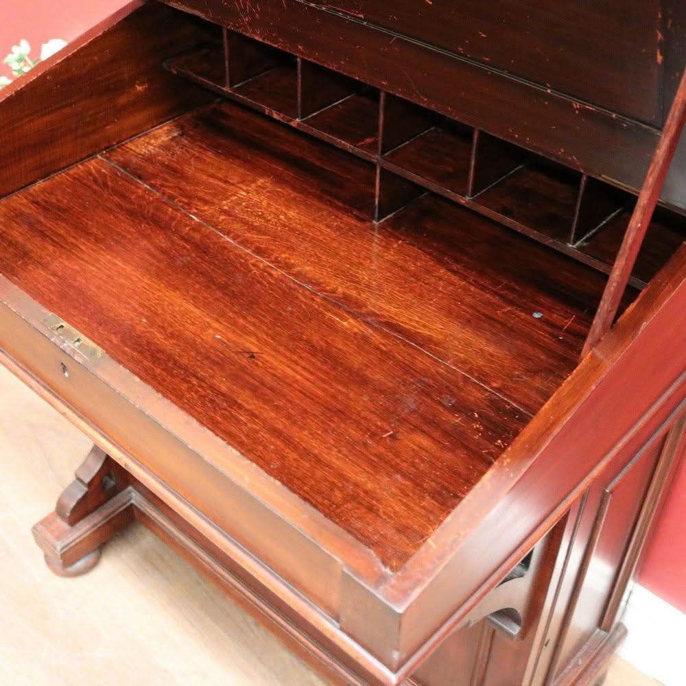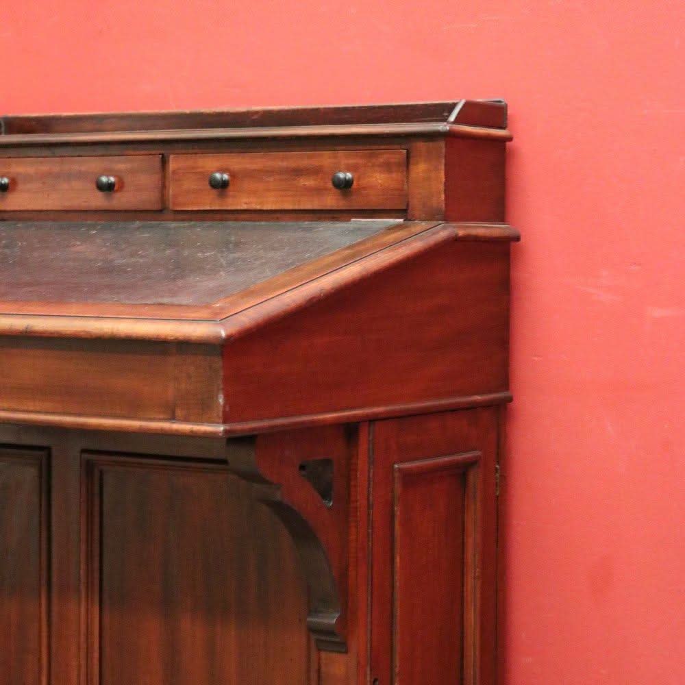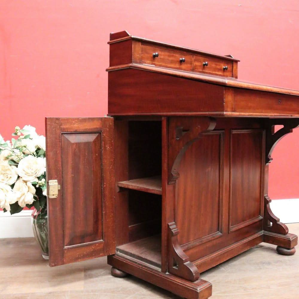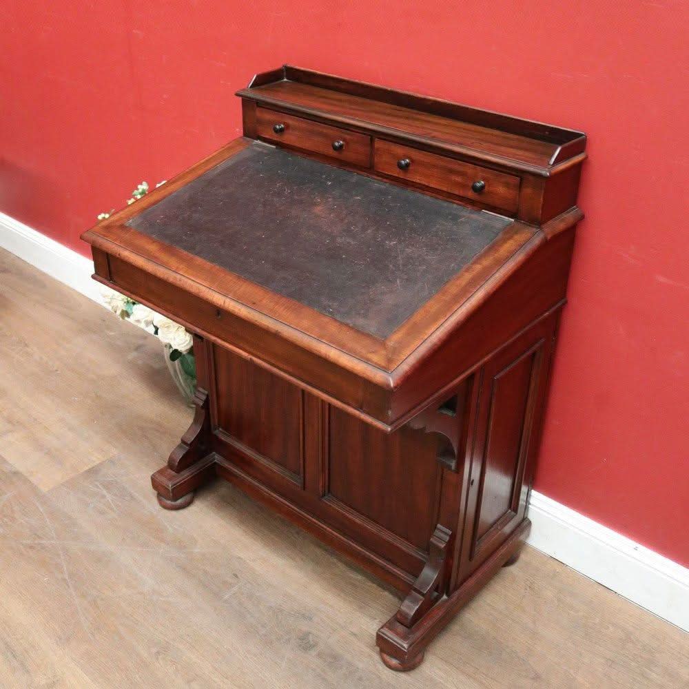 Description: Antique mahogany Davenport desk with a black leather writing slope. Each side opens with its key, revealing a shelf inside. The desk features two external drawers and eight internal pigeonholes beneath the liftable writing slope. Offering ample leg room, the desk sits comfortably at 64 cm from the floor to the underside.