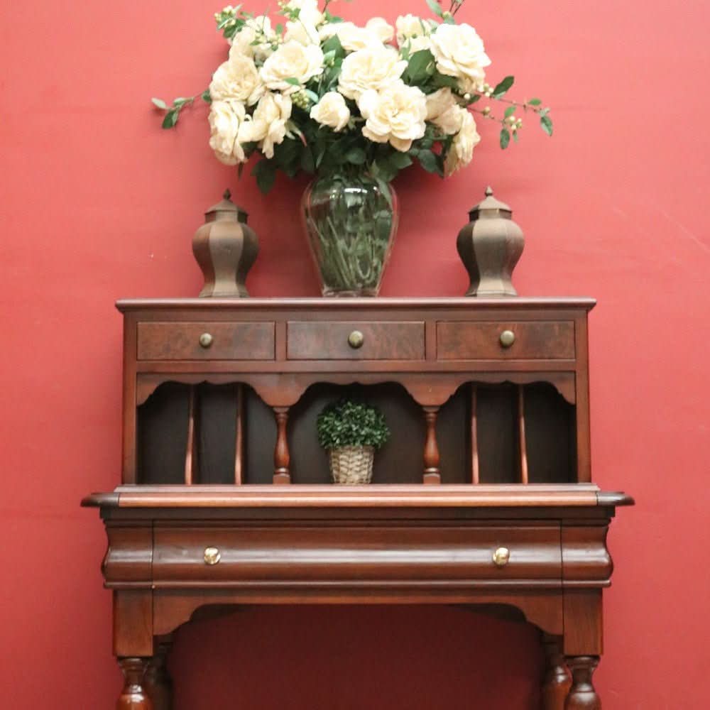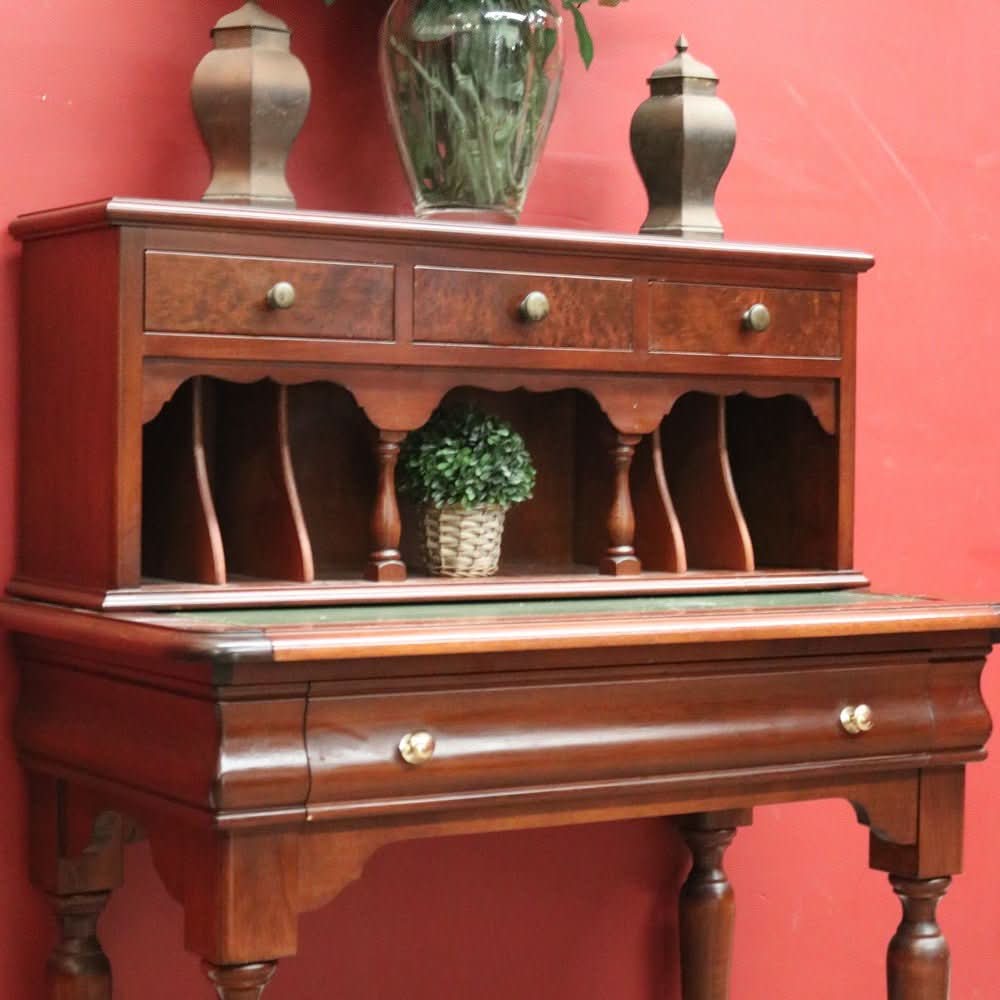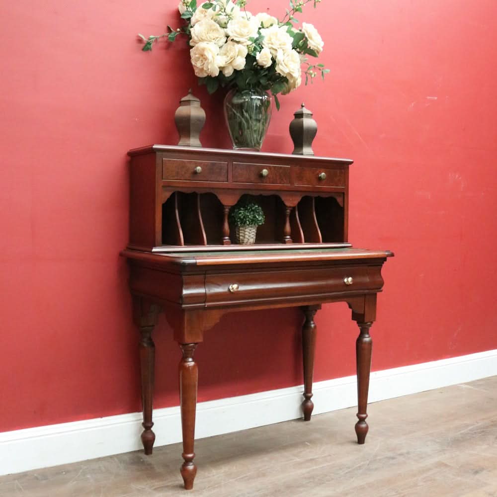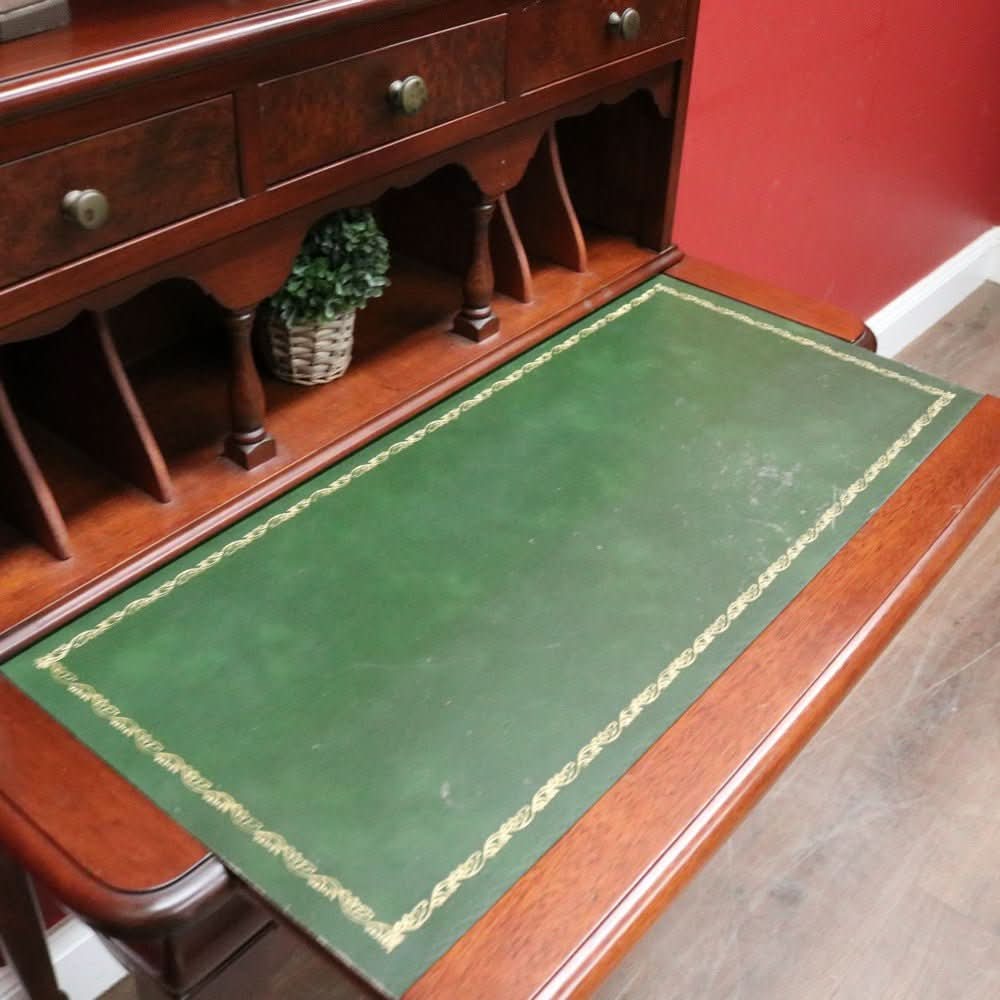 Description:A refined and practical piece, this antique to mid-century mahogany writing desk features gilt-tooled leather inlay, classic brass hardware, and elegant turned legs, blending traditional style with functional design.