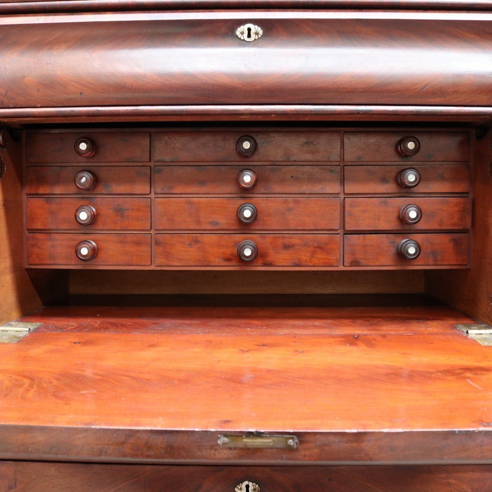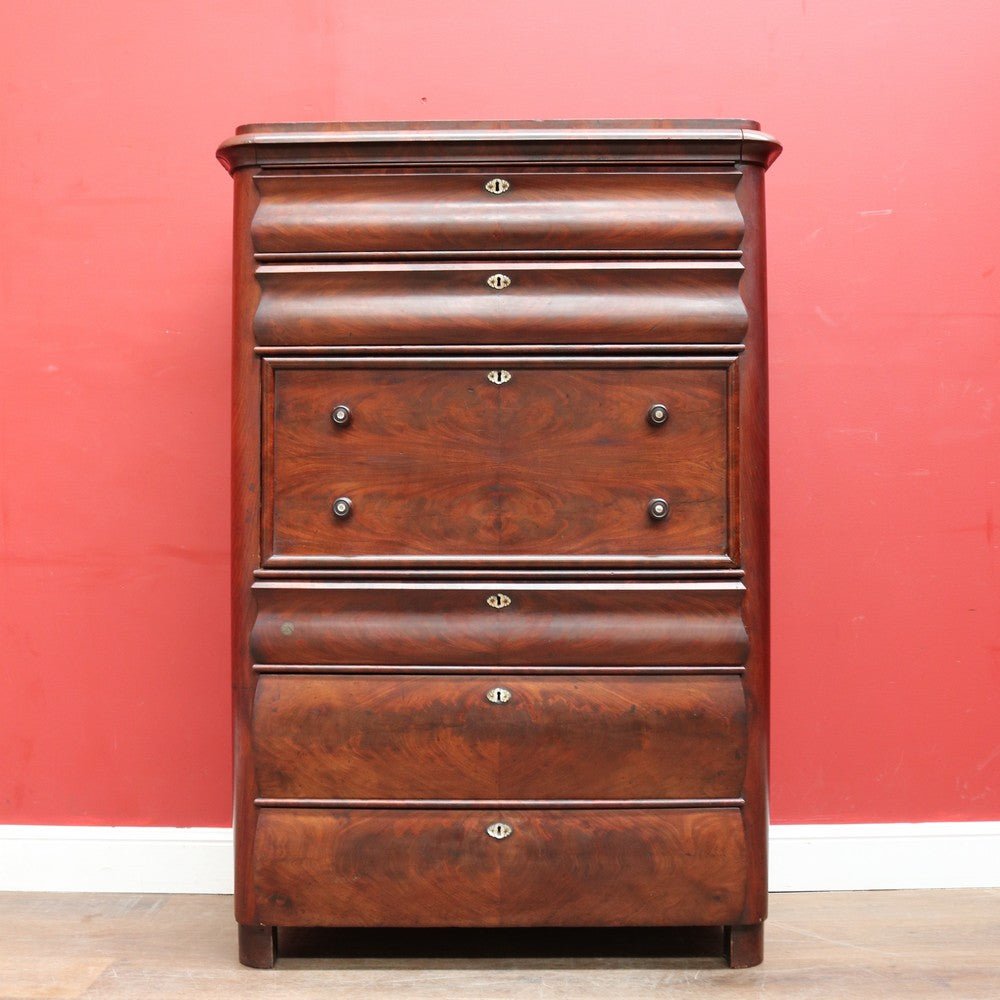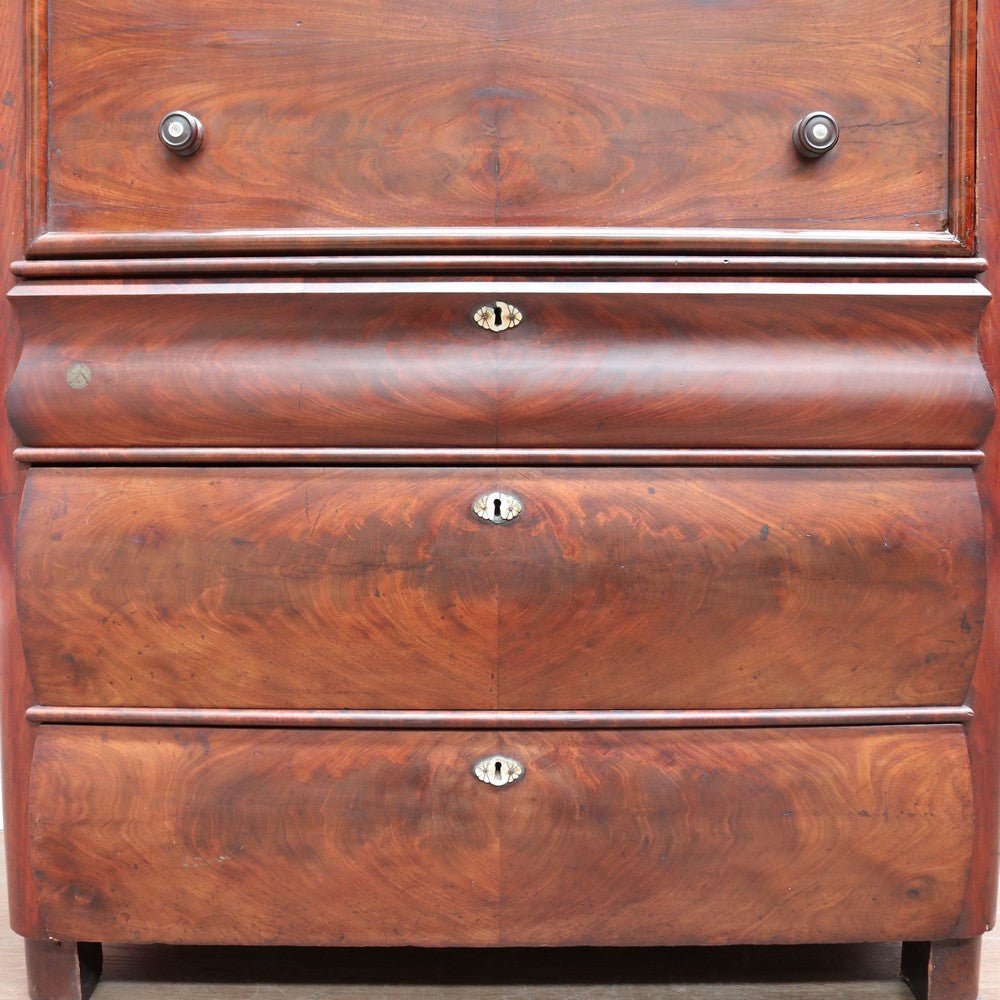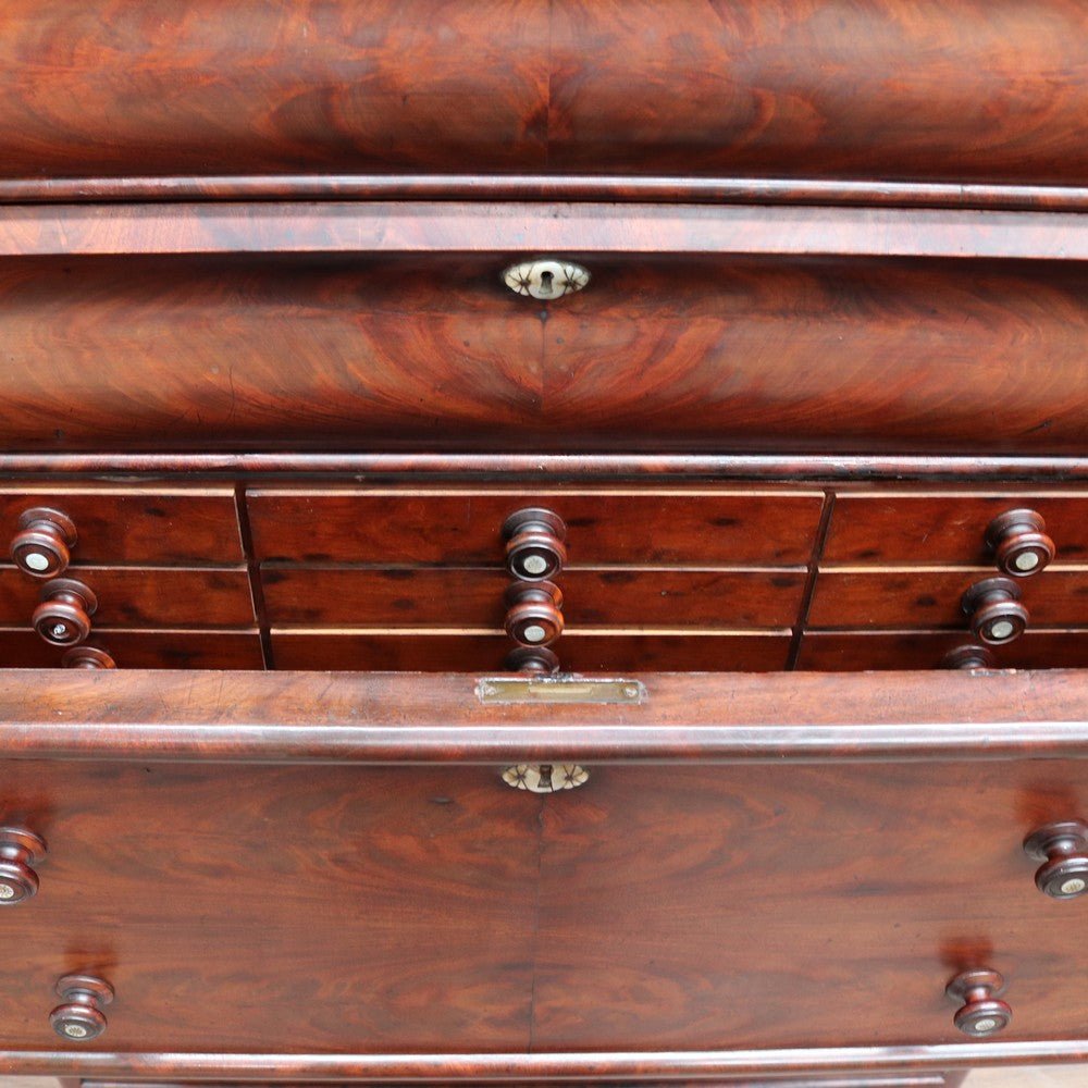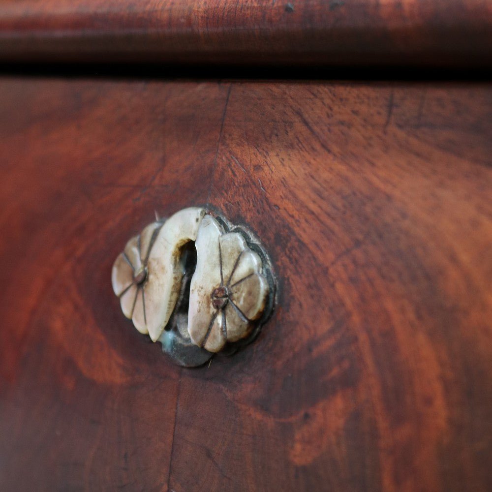Description: An English Biedermeier secretaire chest crafted in mahogany with elegant Mother-of-Pearl escutcheons. This beautifully proportioned piece has aged gracefully, showing the rich patina and character that only time can bring.