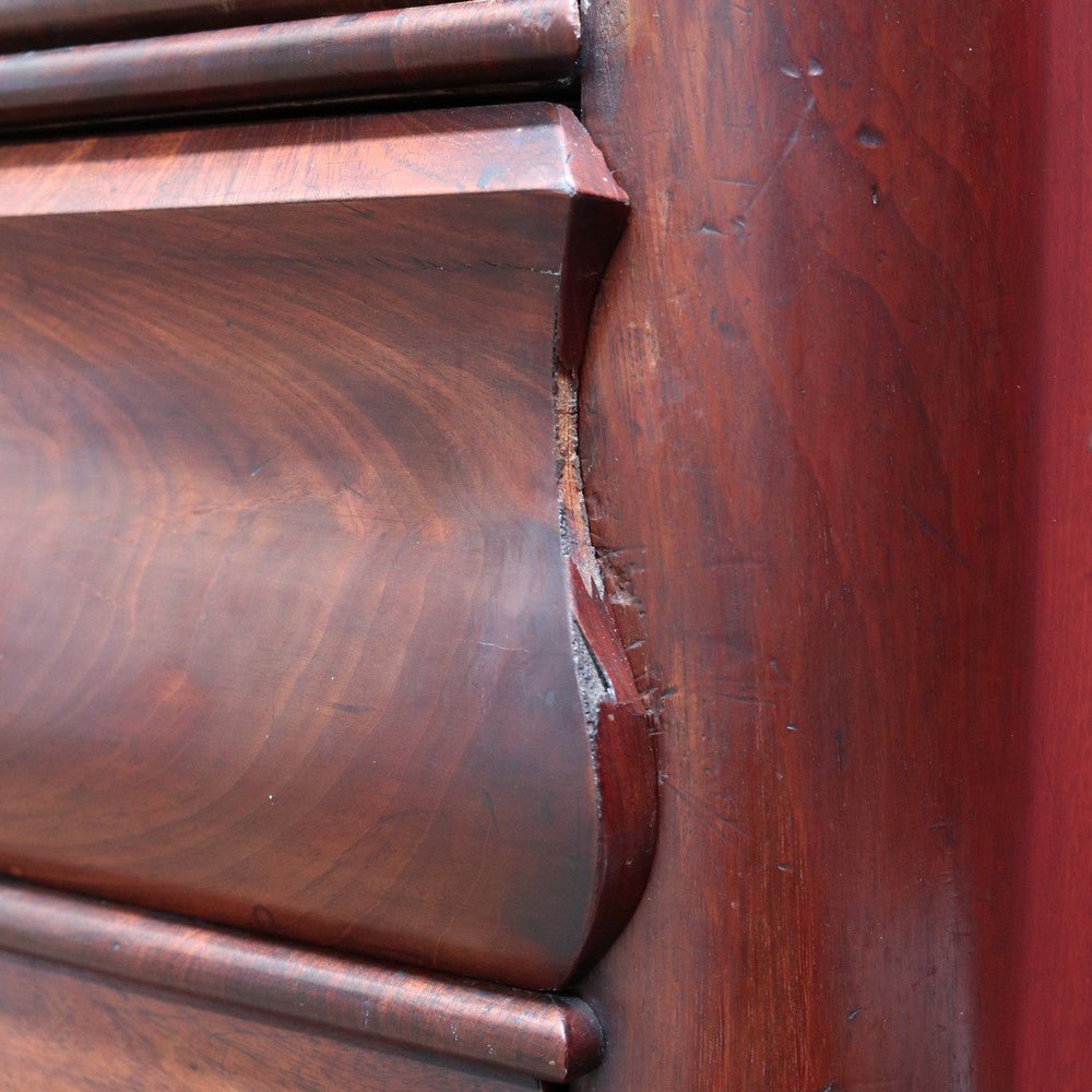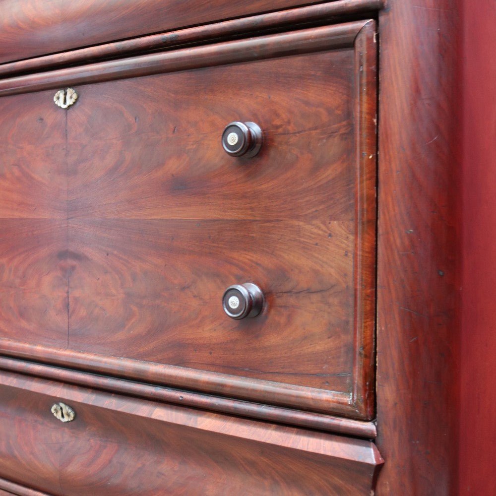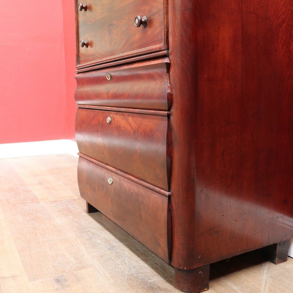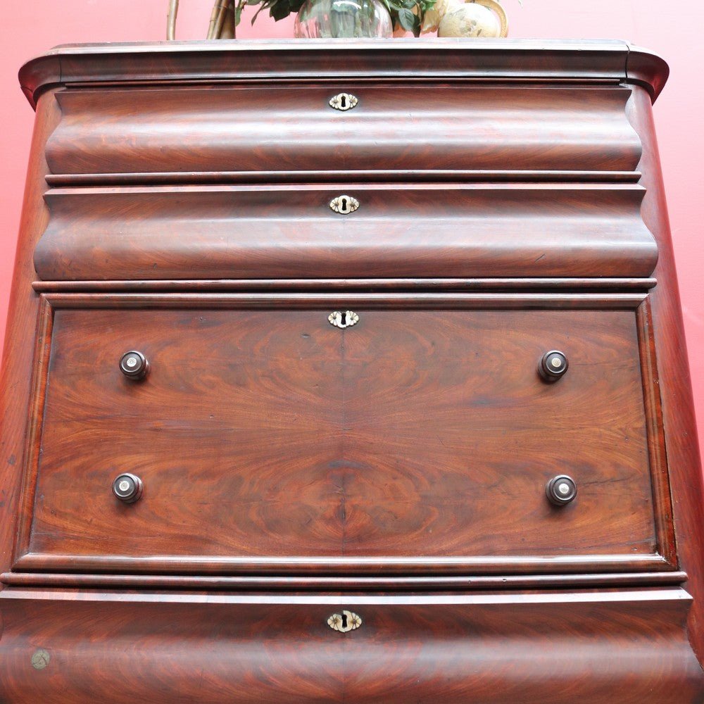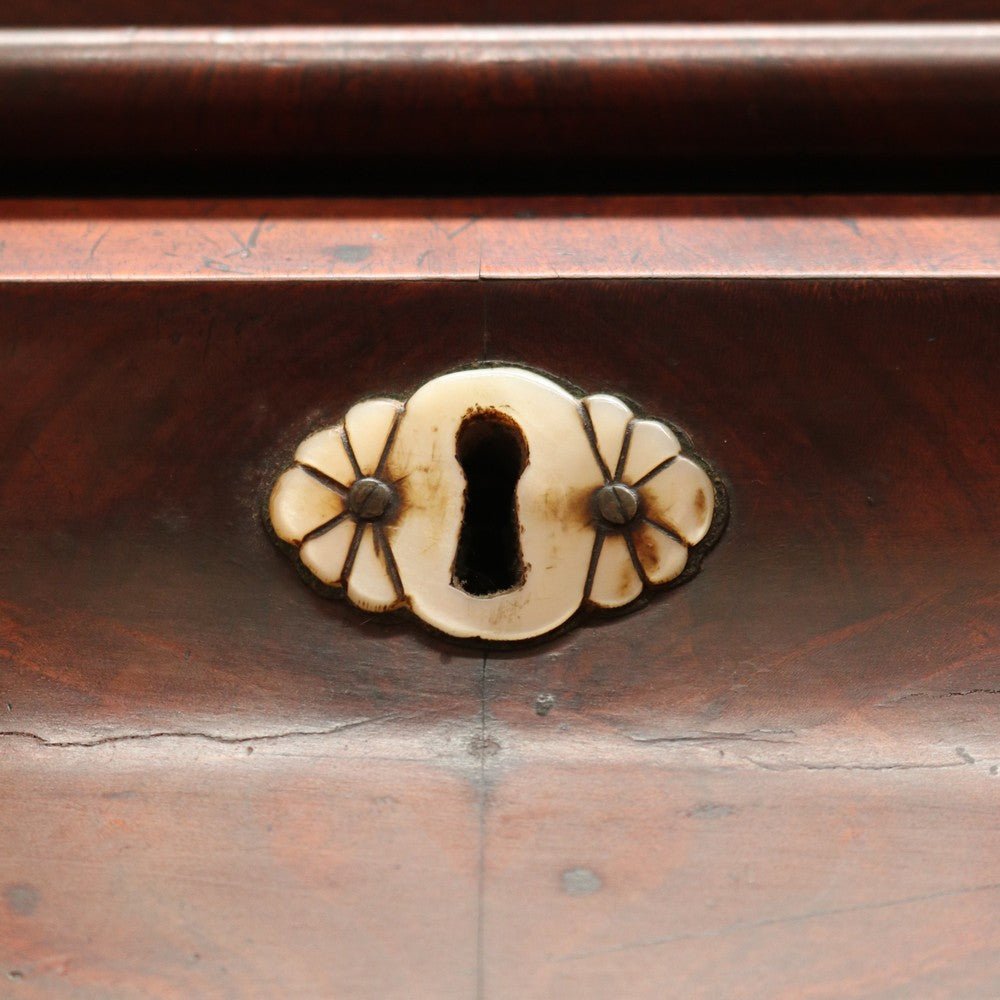 Description: An English Biedermeier secretaire chest crafted in mahogany with elegant Mother-of-Pearl escutcheons. This beautifully proportioned piece has aged gracefully, showing the rich patina and character that only time can bring.