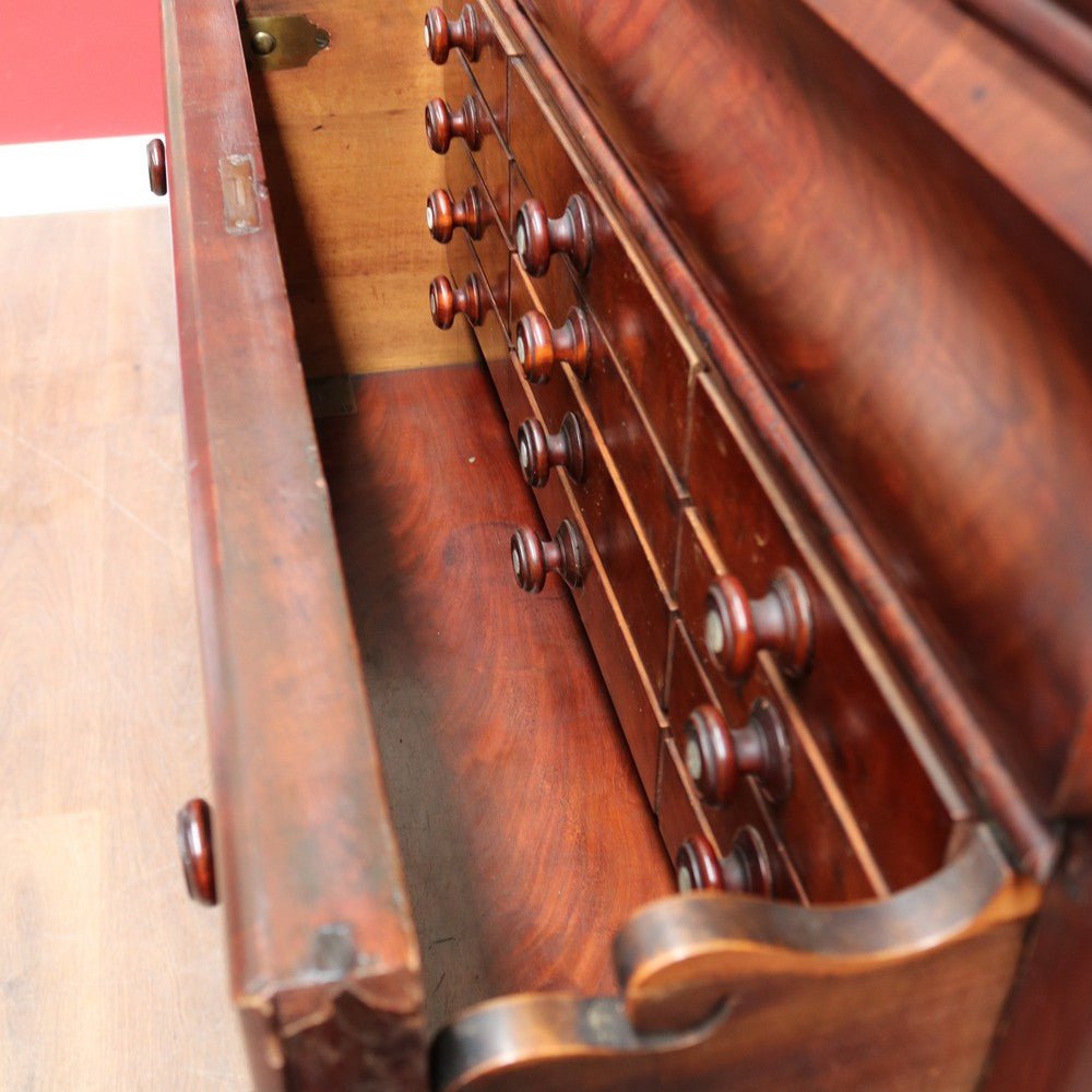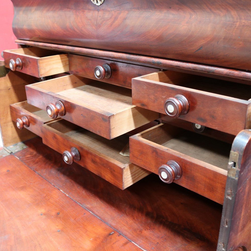 The drop-front desk opens to reveal a practical interior fitted with twelve stationery drawers, offering excellent organisation for writing materials or personal items.
