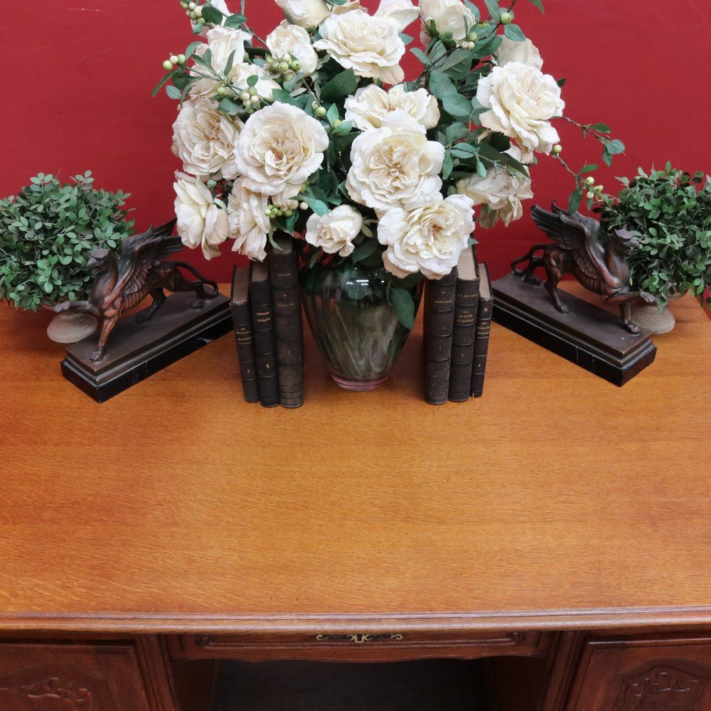 Brass escutcheons complement the oak, and the knee area measures 62 cm high and 49 cm wide, providing comfortable working space. A versatile and well-proportioned desk with classic French styling suitable for a study, office or living room.