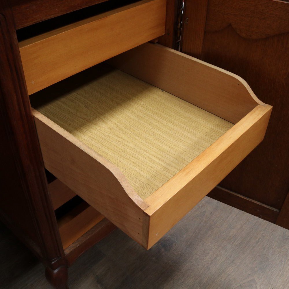 Description:A French oak office or study desk with a practical layout and attractive detail. The desk features a single drawer and two cupboards, one on each side of the user, offering convenient enclosed storage. The panelled sides and back allow the desk to be placed in the centre of a room, and the scalloped apron continues all the way around, adding elegance from every angle.