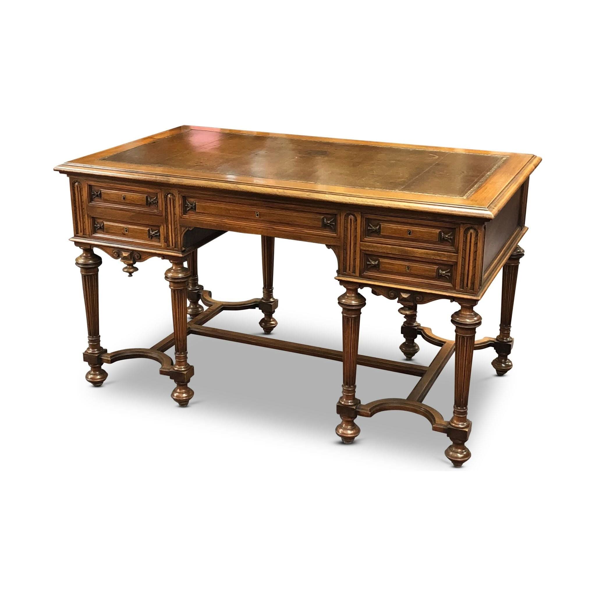 Antique late 19th-century French walnut desk, with drawers and original hand-tooled leather insert and elaborate base, c. 1890