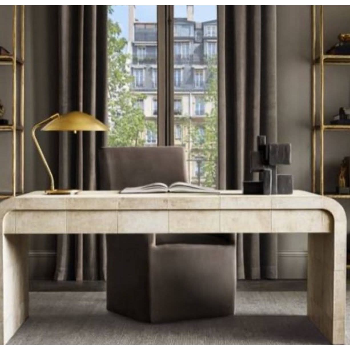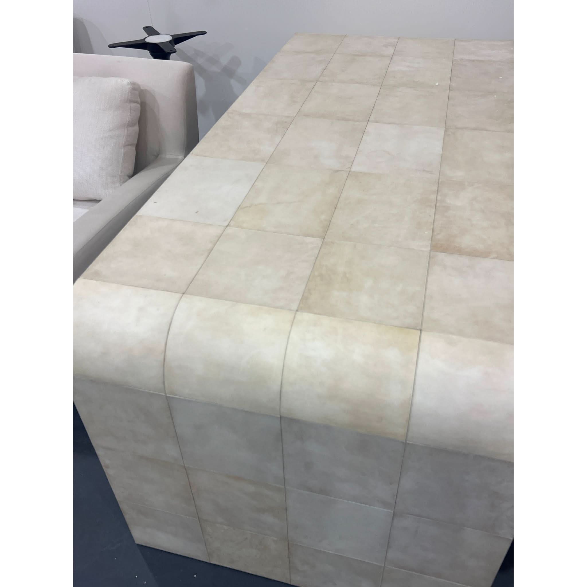 Recalling the distinctive 1930s style of celebrated French designer Jean-Michel Frank, this collection marries minimalist silhouettes and luxurious materials. The flowing lines and graceful curves of the waterfall forms are sheathed in hand-pieced parchment, a study in elegant refinement.