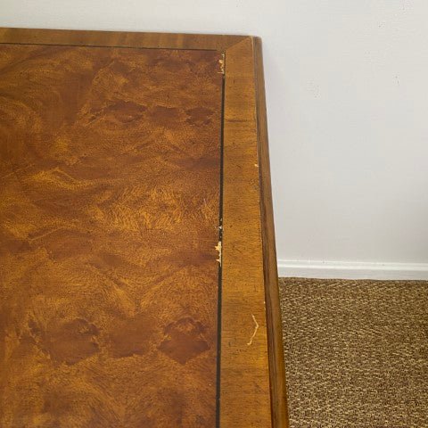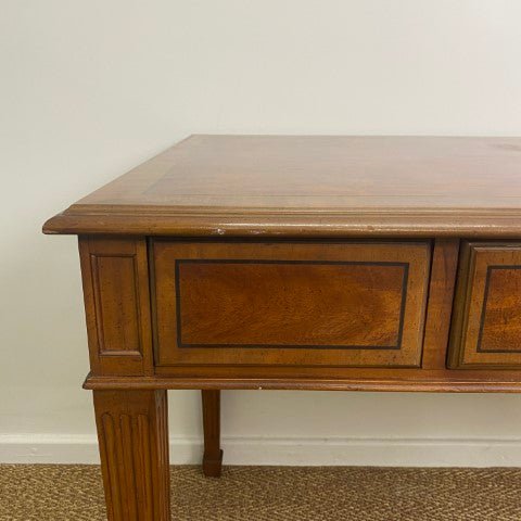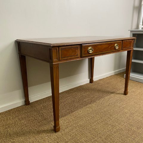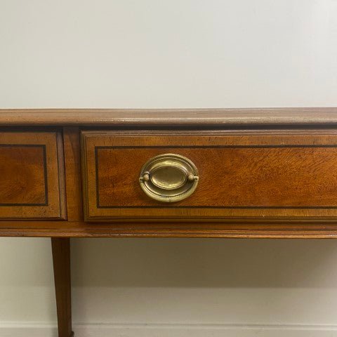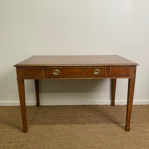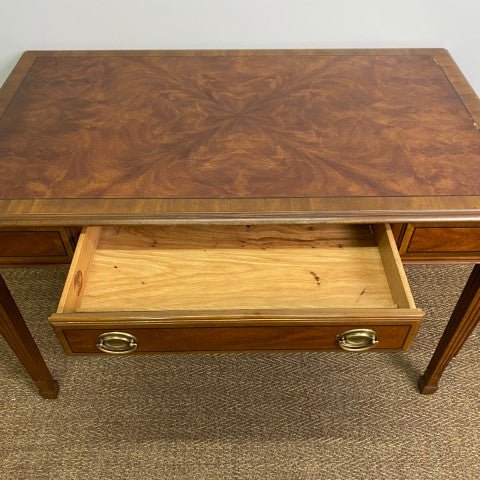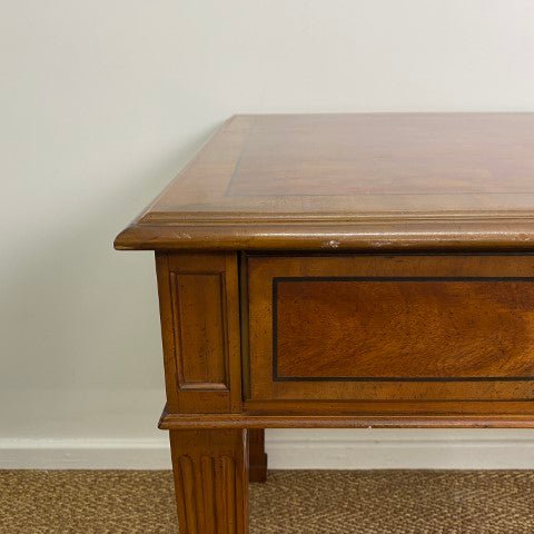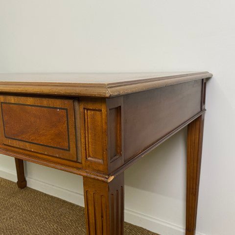 This vintage Drexel Heritage executive desk is crafted in Georgian Chippendale style with beautiful veneer, and a single long central drawer. Brass ring pull handles and elegant tapered legs highlight its classic proportions and refined detailing. Sourced from the decommissioned Sir Stamford Hotel in Circular Quay, it offers a stylish and sophisticated decorative presence for home offices or living spaces.