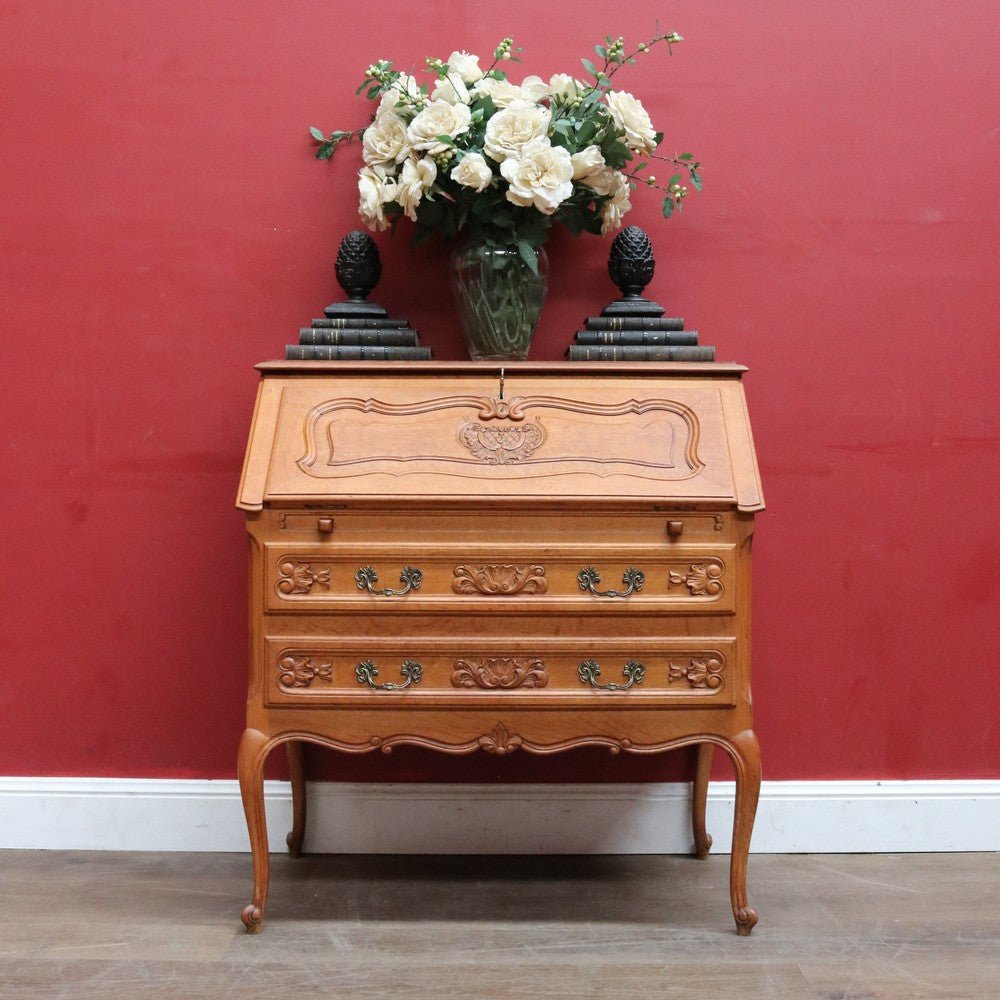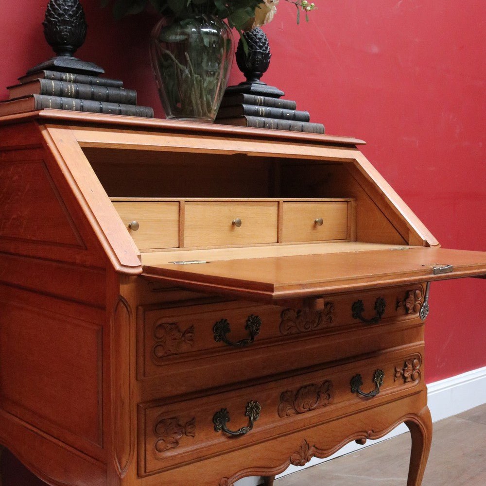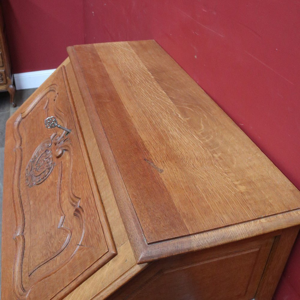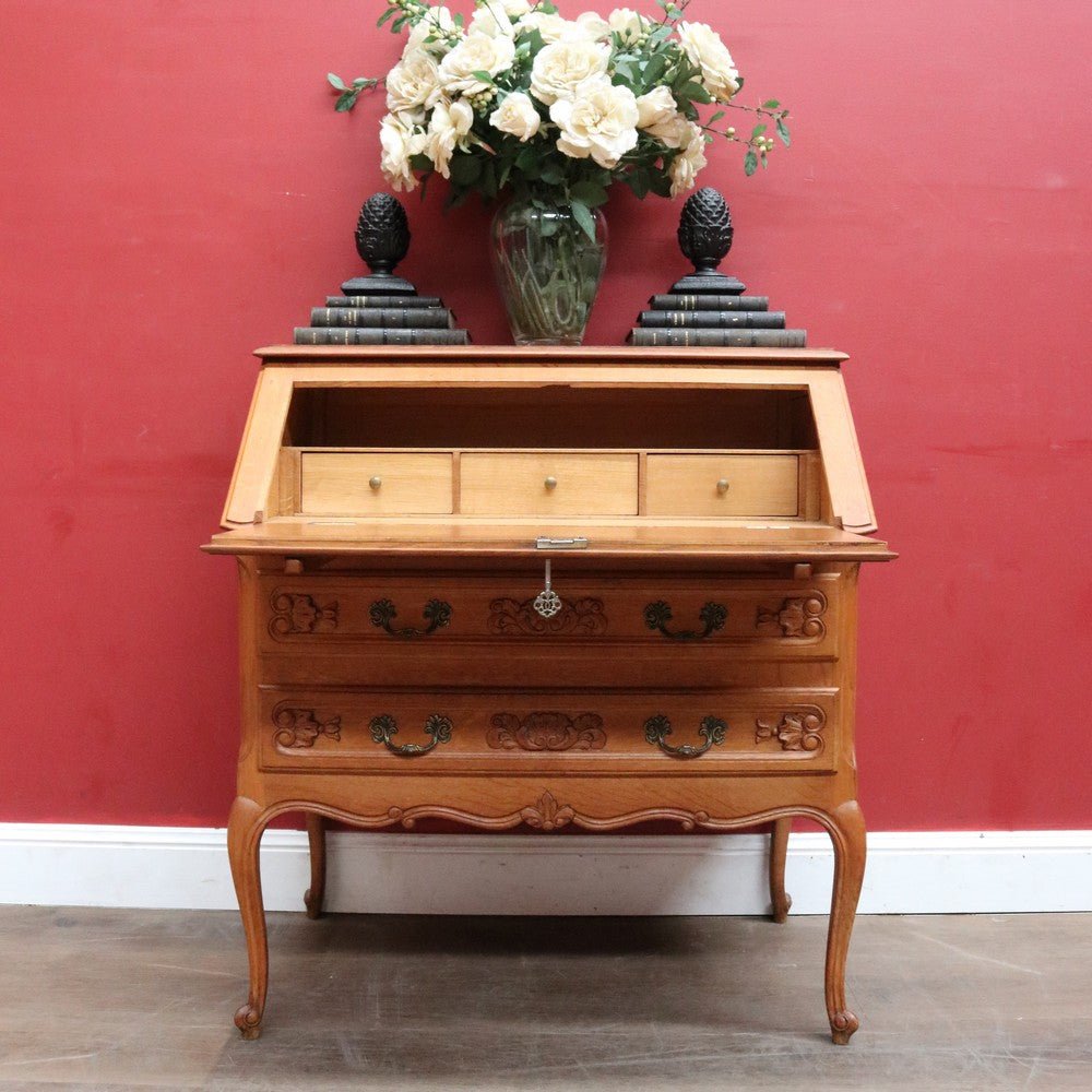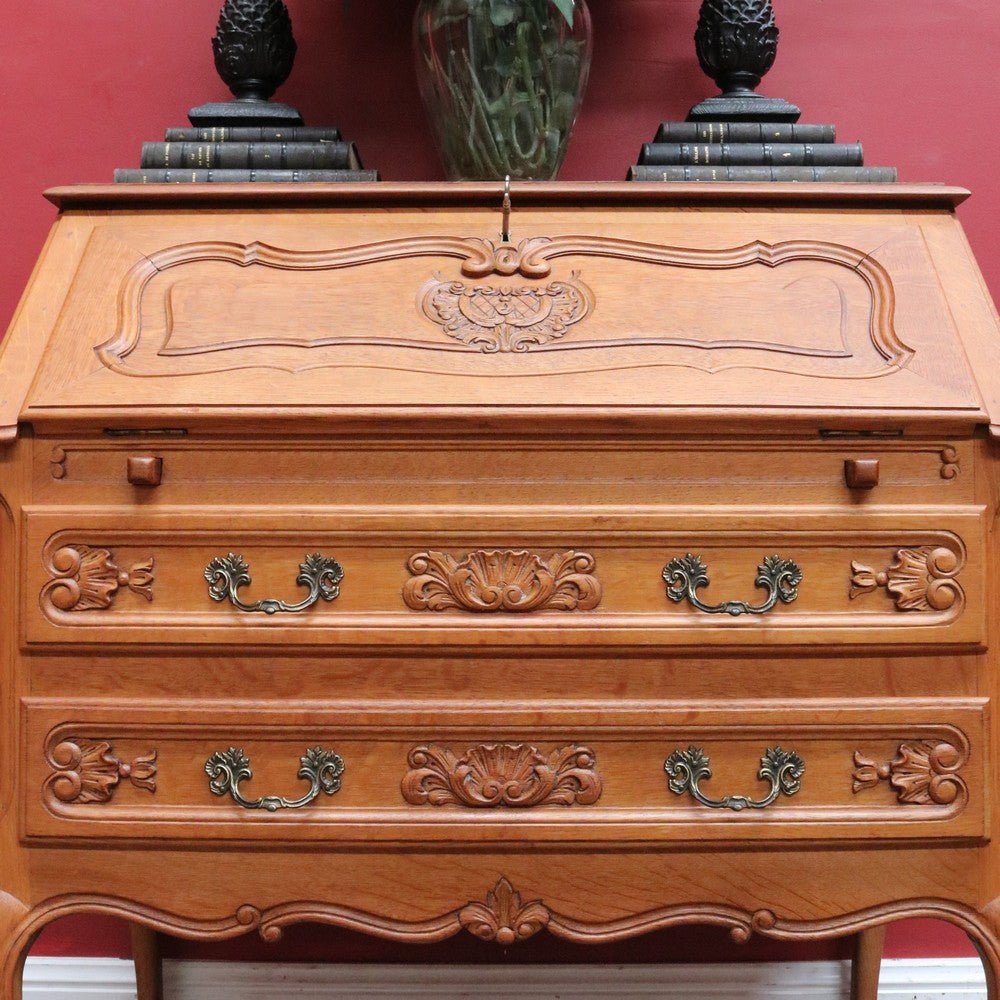 Description: Vintage French oak writing bureau with drop front writing desk above two drawers. Brass handles and a key. The interior contains three small stationery or trinket drawers. Carved detail to the drop front, the drawer fronts and the French scroll feet.