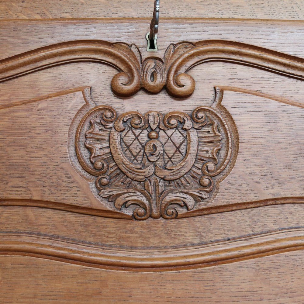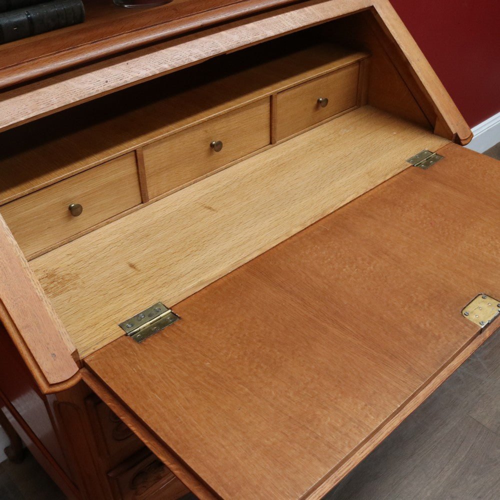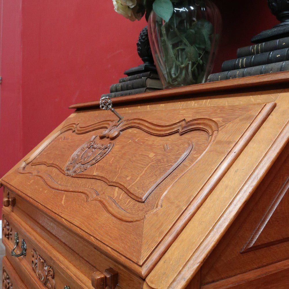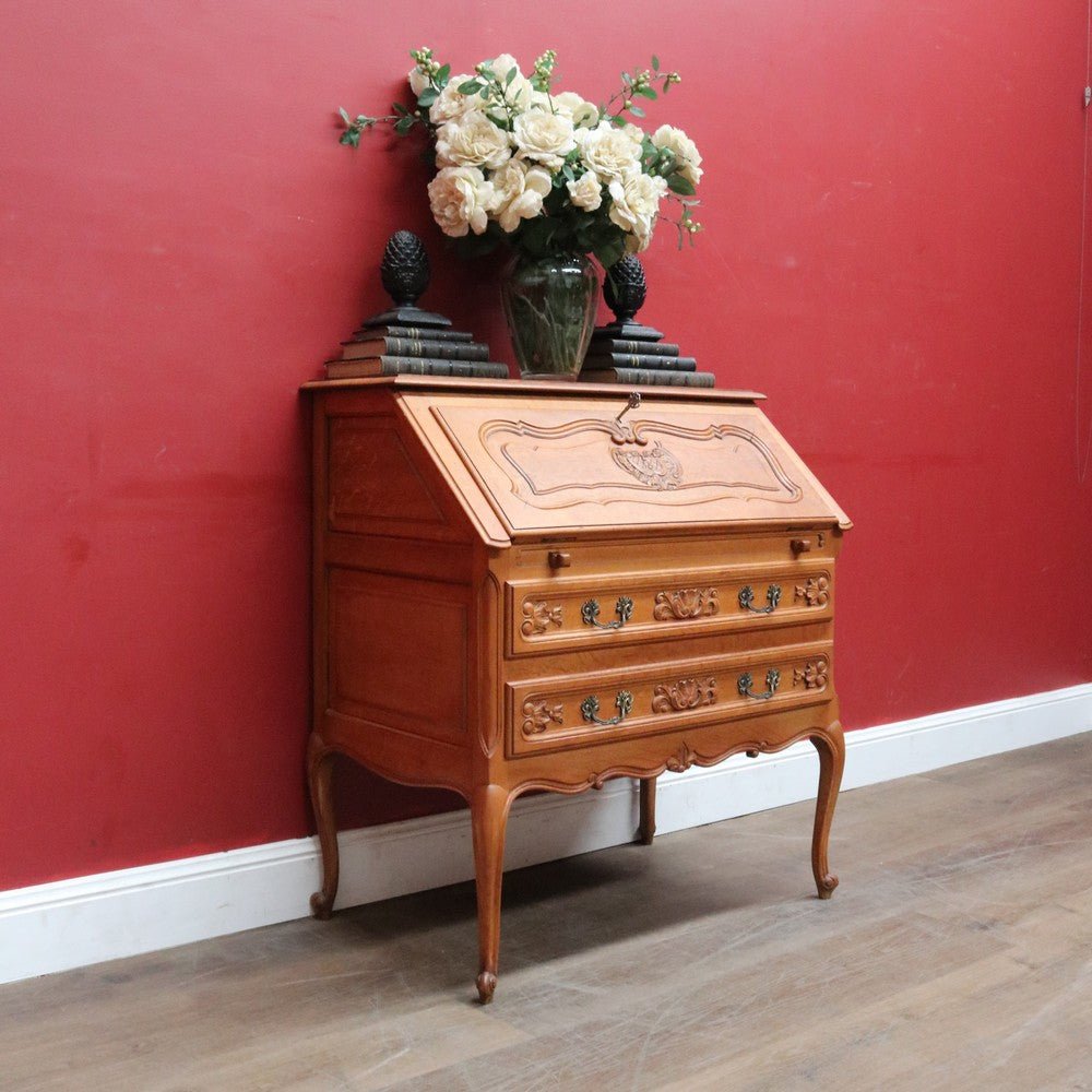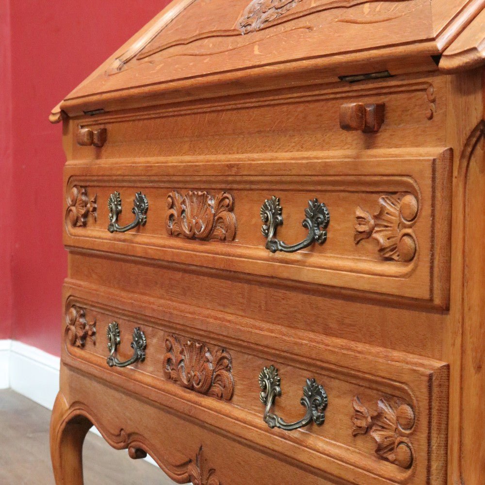 Description: Vintage French oak writing bureau with drop front writing desk above two drawers. Brass handles and a key. The interior contains three small stationery or trinket drawers. Carved detail to the drop front, the drawer fronts and the French scroll feet.