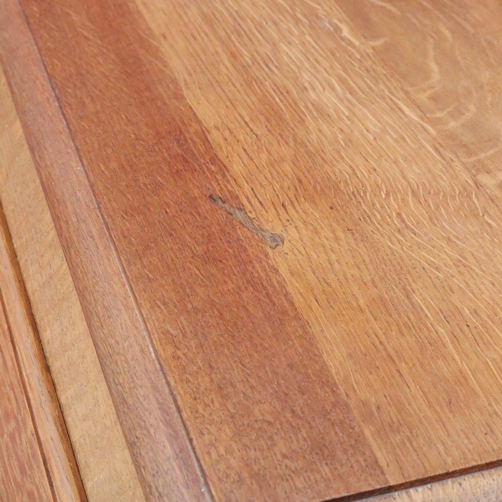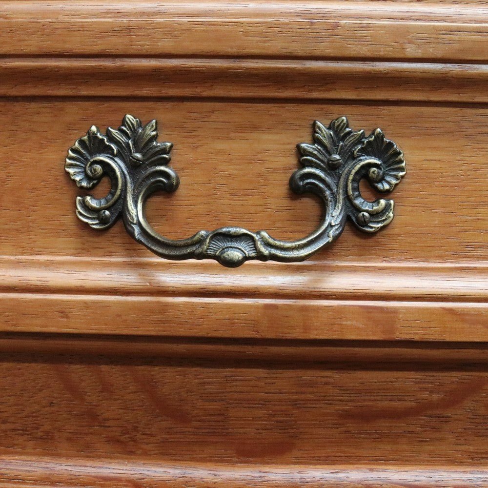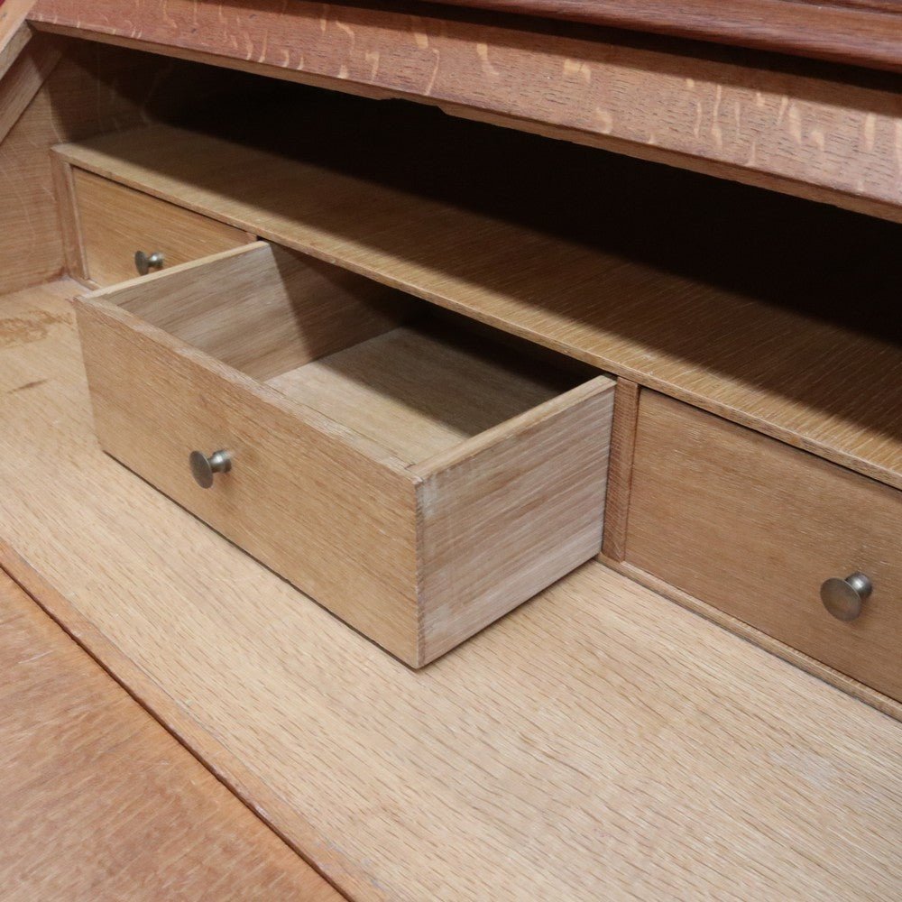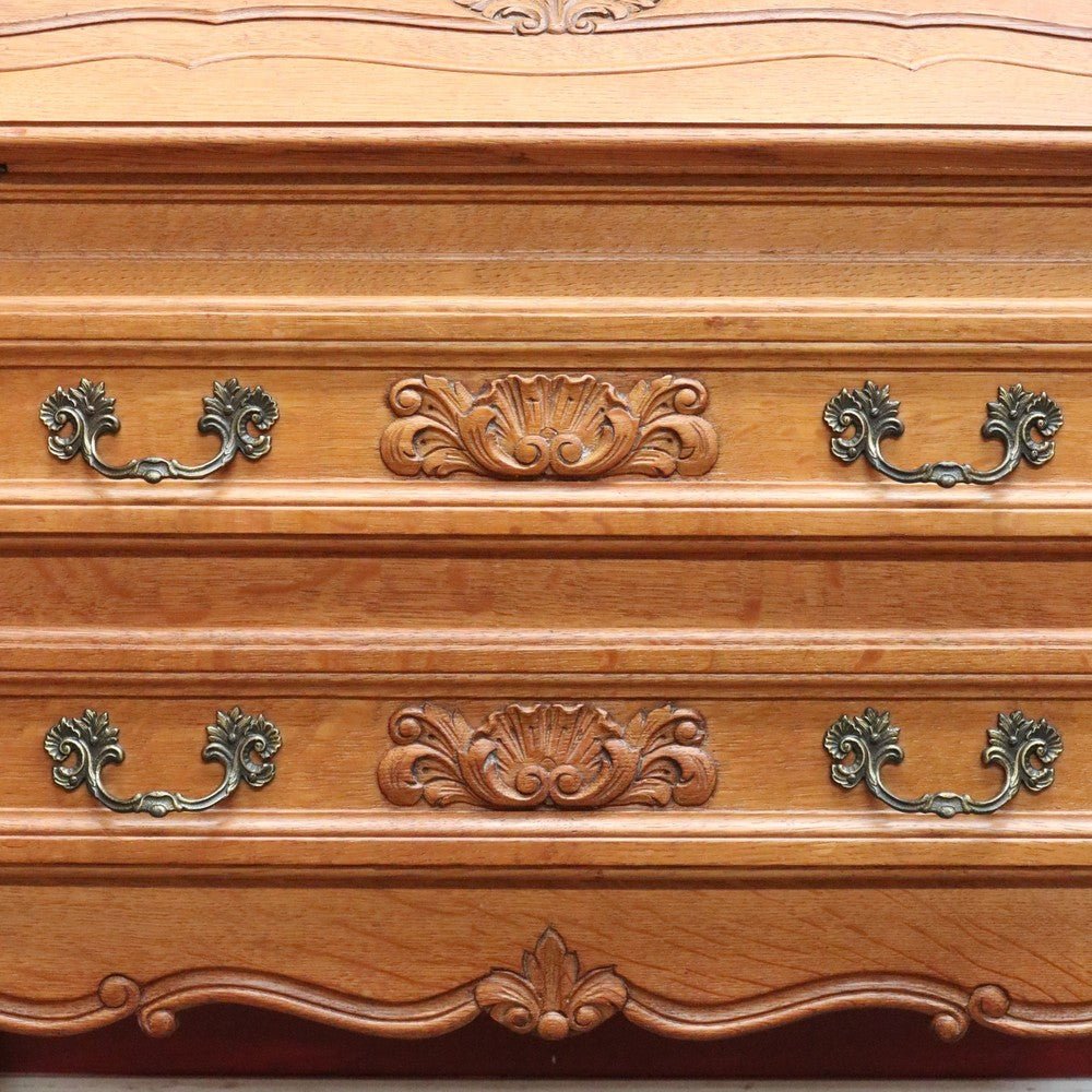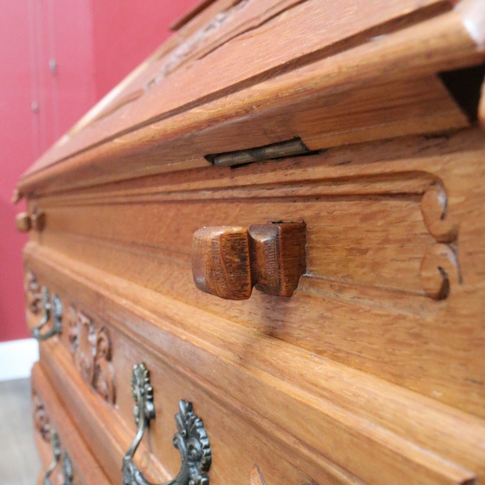 Description: Vintage French oak writing bureau with drop front writing desk above two drawers. Brass handles and a key. The interior contains three small stationery or trinket drawers. Carved detail to the drop front, the drawer fronts and the French scroll feet.