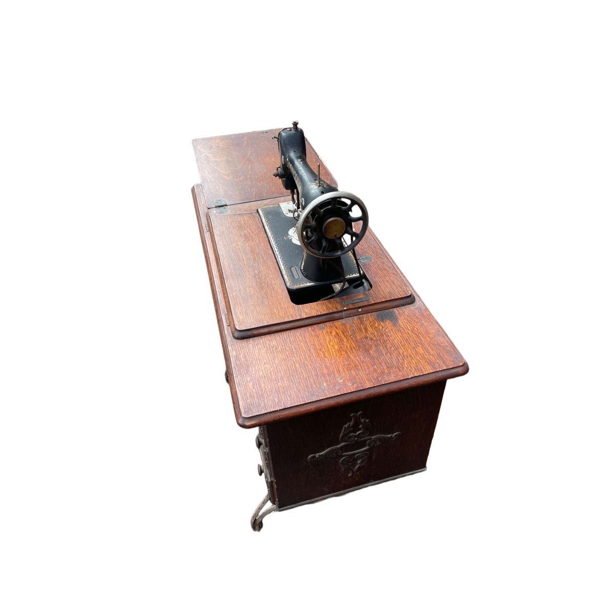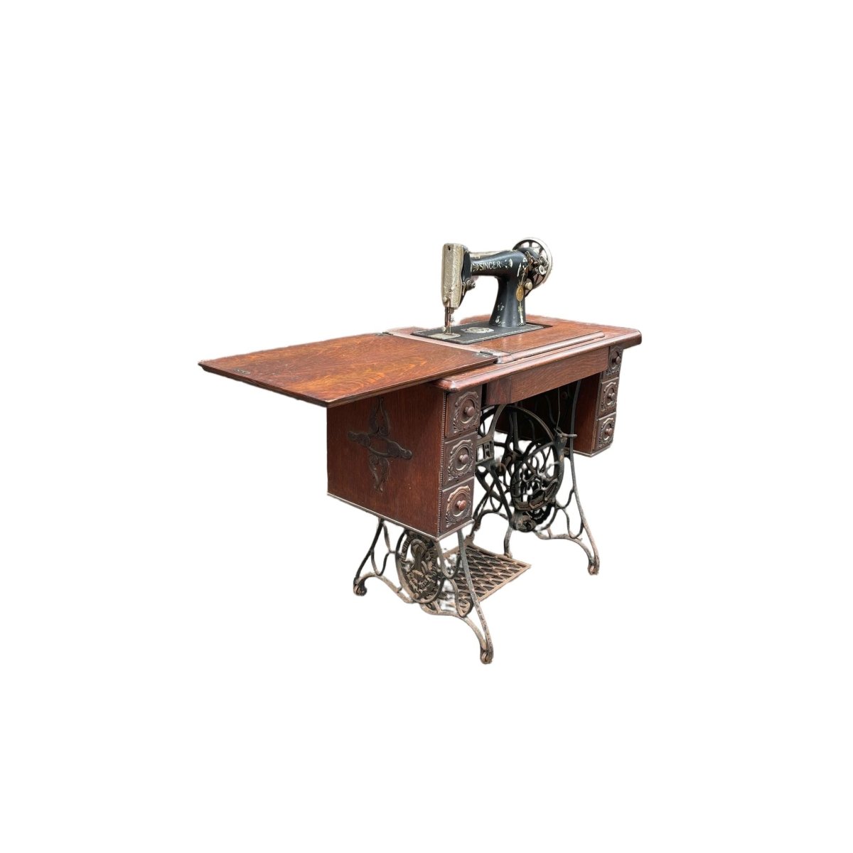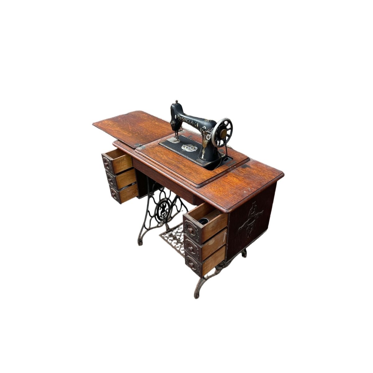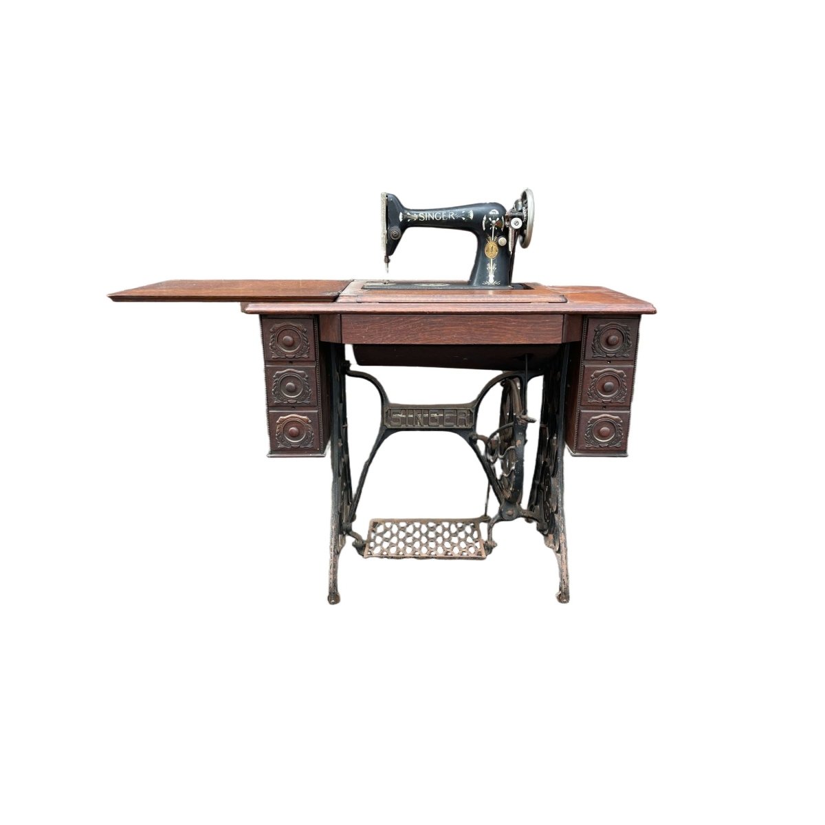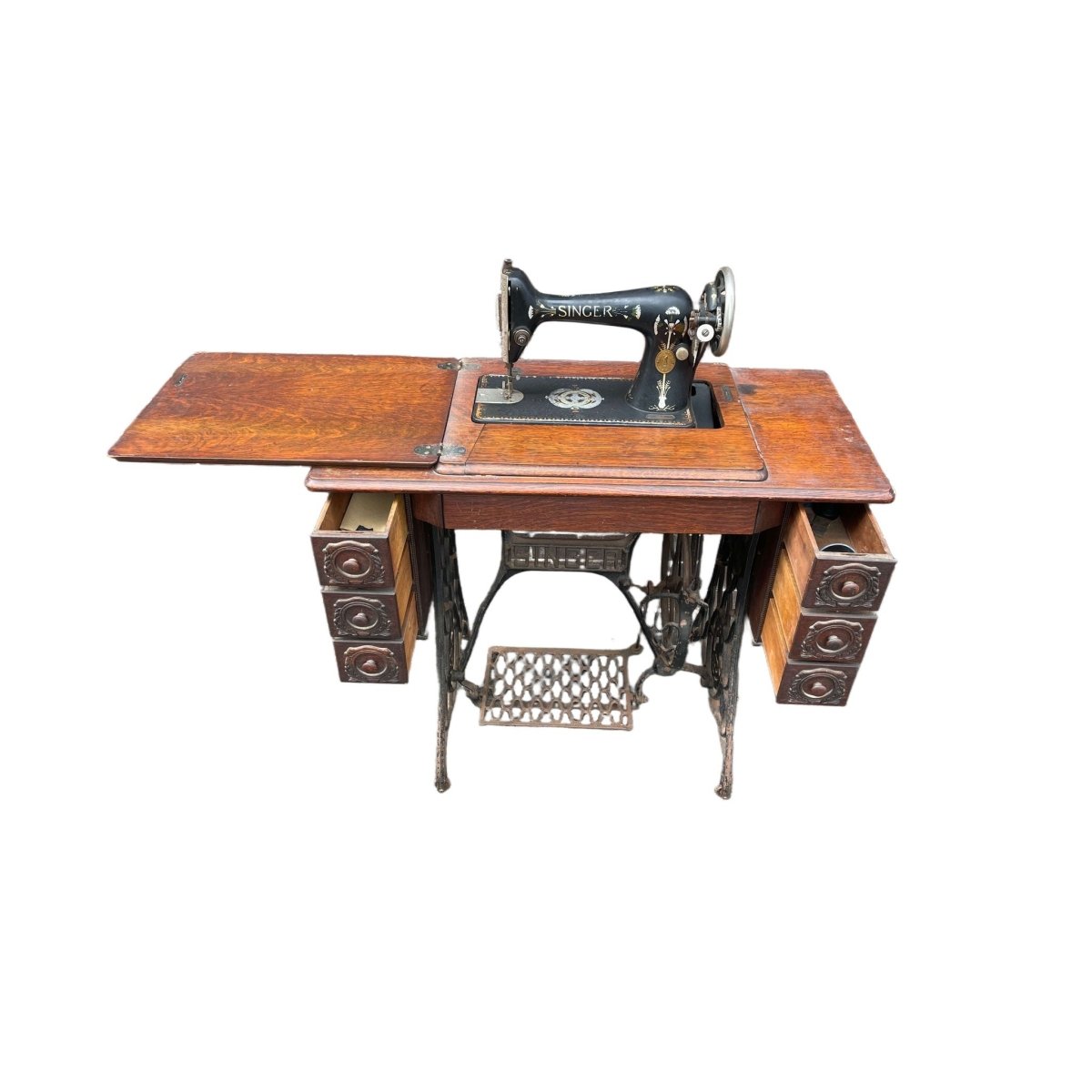 This Vintage Singer Sewing Machine Table is a stunning piece that combines functionality with classic design. Featuring a beautifully crafted wooden top and a sturdy cast iron base, this table is perfect for sewing enthusiasts or as a unique accent piece in your home. The table is in good condition, showcasing the timeless craftsmanship of Singer. Its dimensions of 120 cm width, 45 cm depth, and 90 cm height make it a versatile addition to any space. Don't miss the chance to own this piece of history!