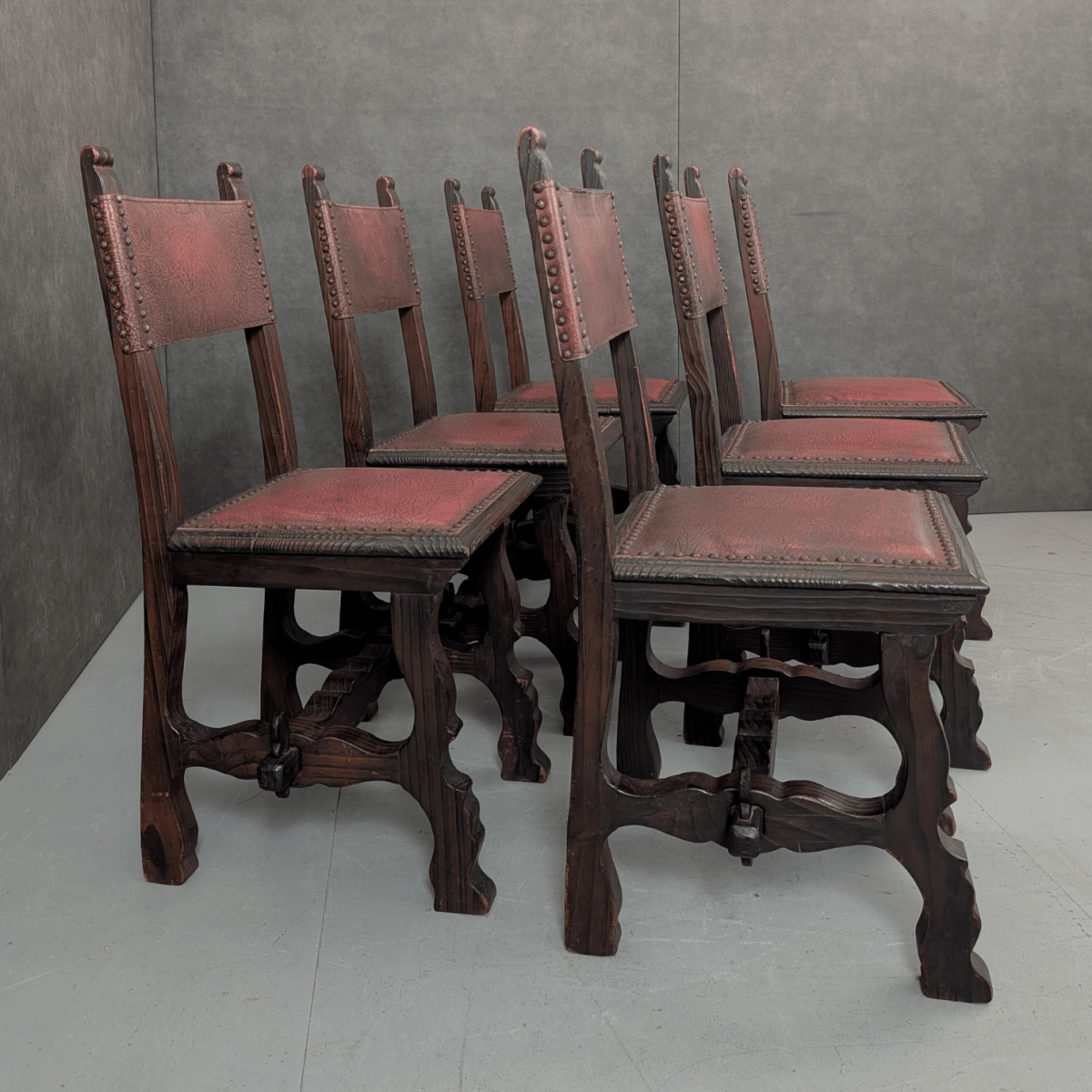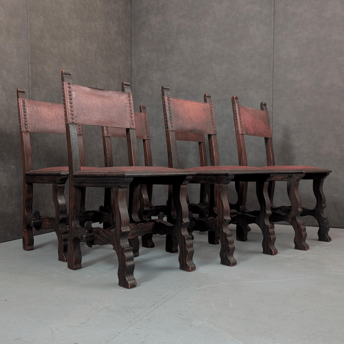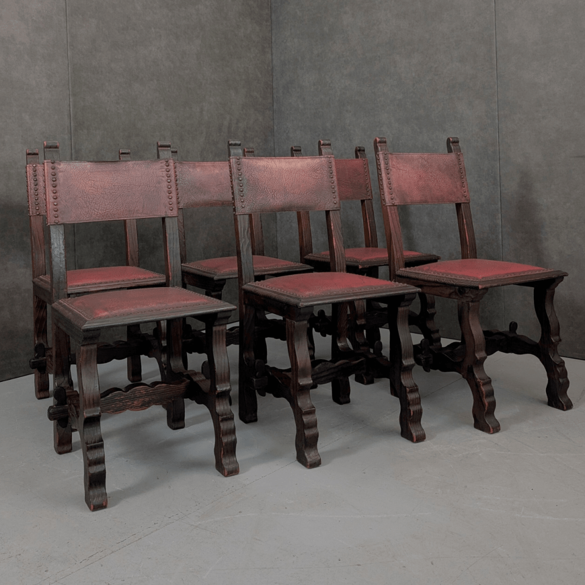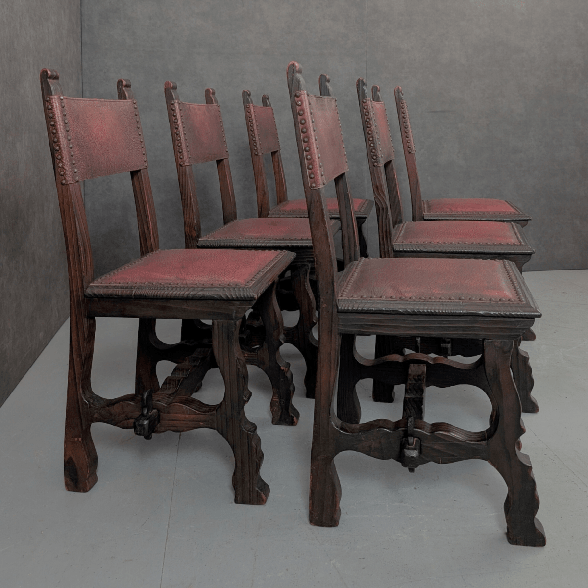 Produced in Spain during the twentieth century, these dining chairs follow the heavy timber construction associated with Spanish monastic and refectory furniture. Solid timber frames carry carved legs, stretcher supports and thick seat rails, while the seats and backs are upholstered in oxblood leather secured with traditional studwork. The grain pattern and visible knots suggest a timber such as chestnut, a material often used in Iberian furniture where durability and expressive grain were valued over refined finishing.