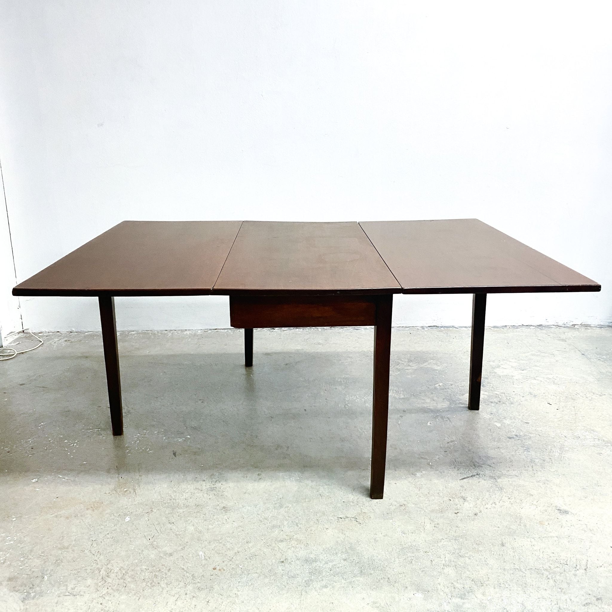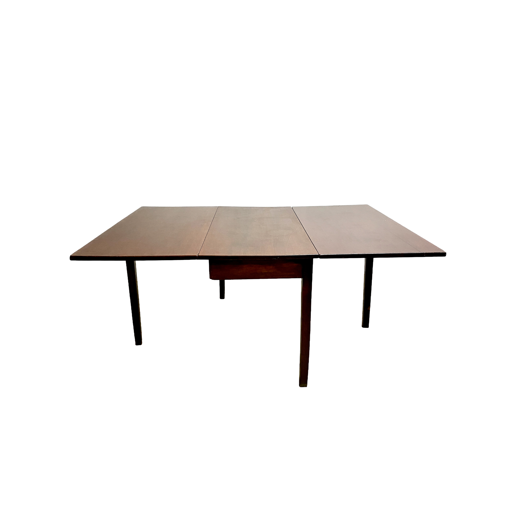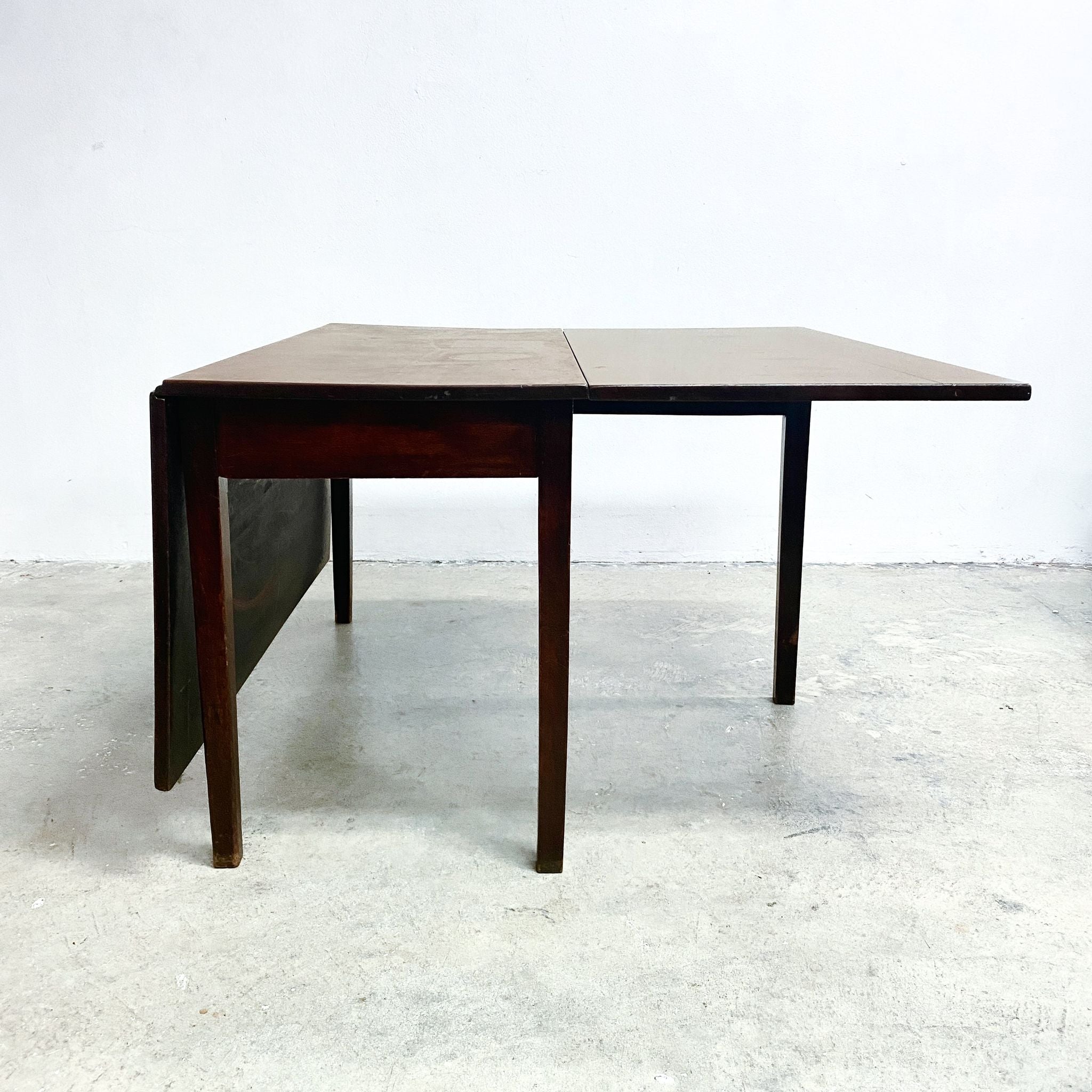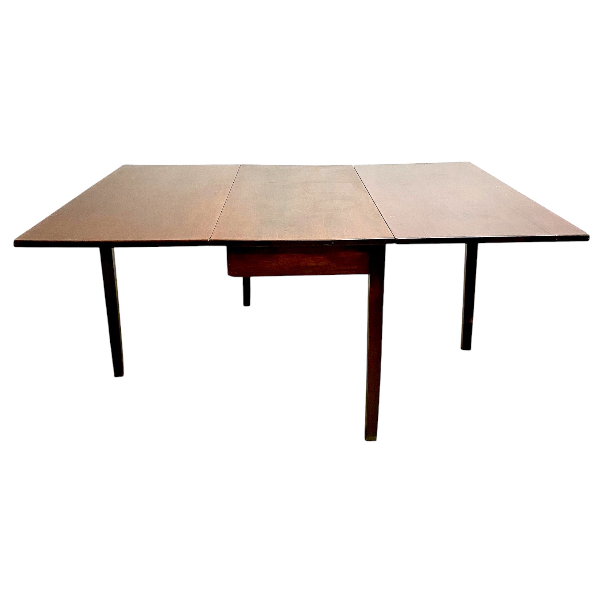 Antique mid to late 1800's drop-leaf table. The rectangular top features two hinged side leaves that allow the table to be used in three configurations: fully closed for a compact footprint, partially opened with one leaf raised, or fully extended when both leaves are in use. Ideal as a slim console when closed and a practical dining table when opened.