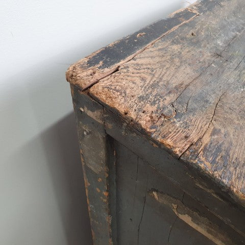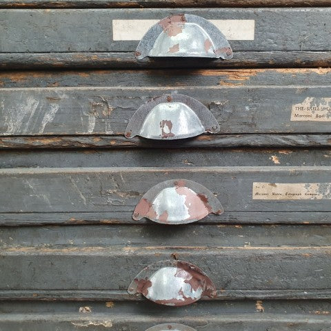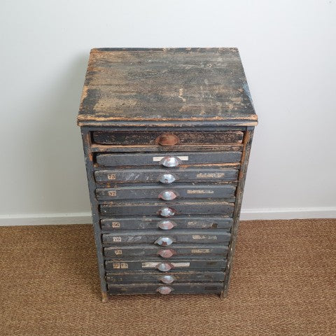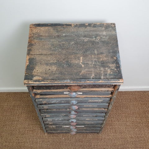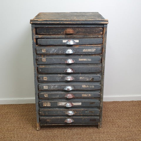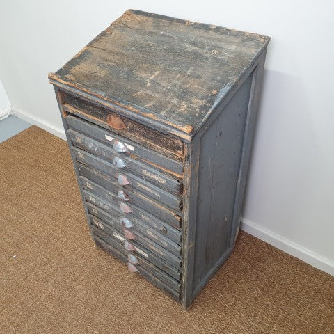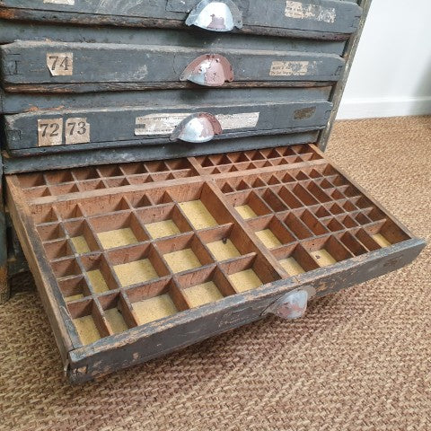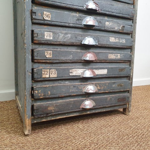 This antique storage cabinet is a classic example of a printer’s type case, originally designed for use in workshops, factories, or printing houses. Its numerous drawers are extensively compartmentalised with small, square wooden dividers, ideal for separating individual pieces of lead or wood type when setting text by hand. The drawers feature original metal cup pull handles, complete with slots for labels, reflecting the functional industrial hardware of the era. Today, these cabinets are sought after as decorative storage for craft supplies, jewellery, or collectibles, while remaining highly collectible for vintage and industrial furniture enthusiasts. Its worn patina and robust construction highlight the authenticity and character of this piece, making it a striking addition to both industrial and eclectic interiors.