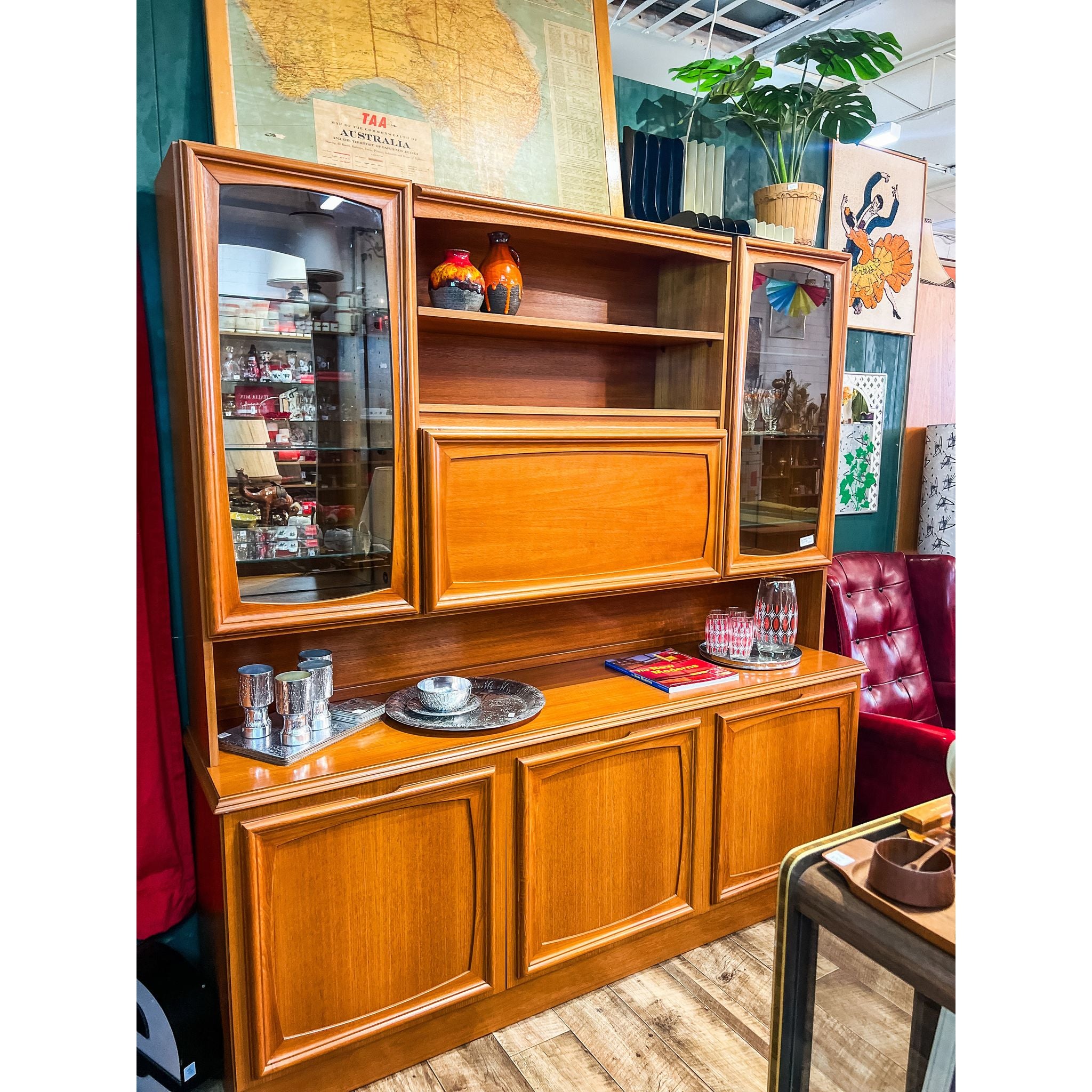 Elevate your space with this beautiful vintage Burgess pull-down bar cabinet, a classic mid-century Australian design. Made from warm honey-toned timber with a smooth satin finish, this piece offers loads of storage and a stunning retro look.