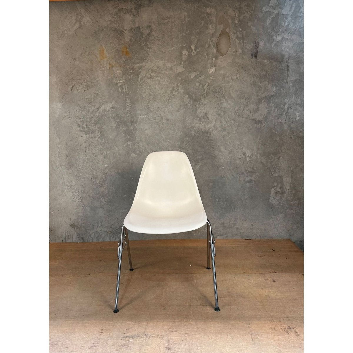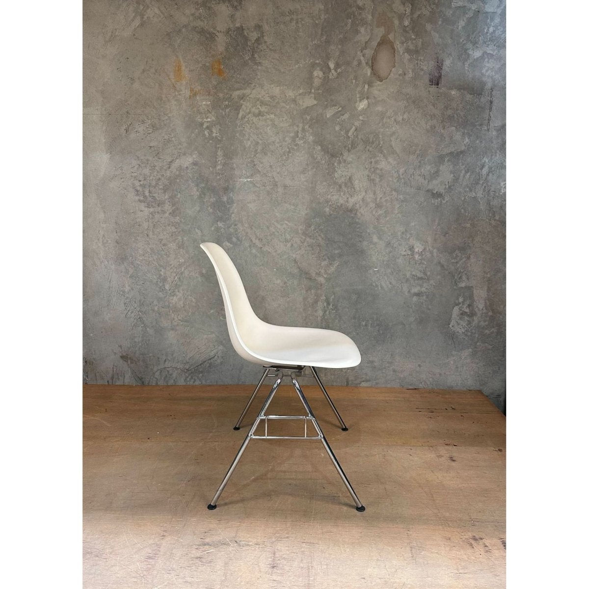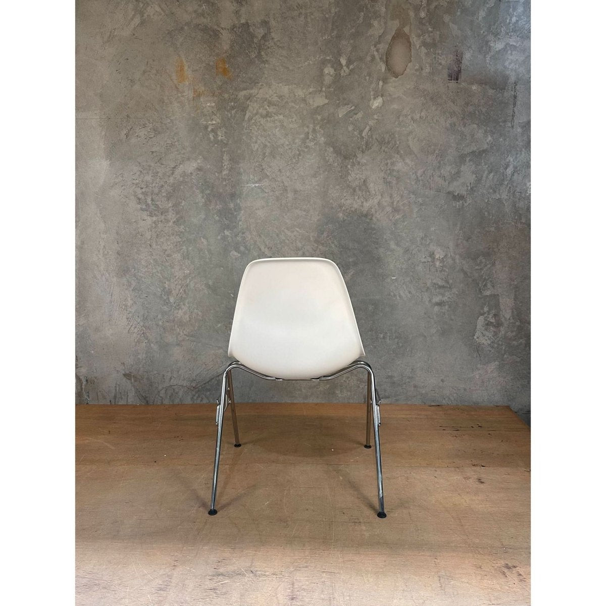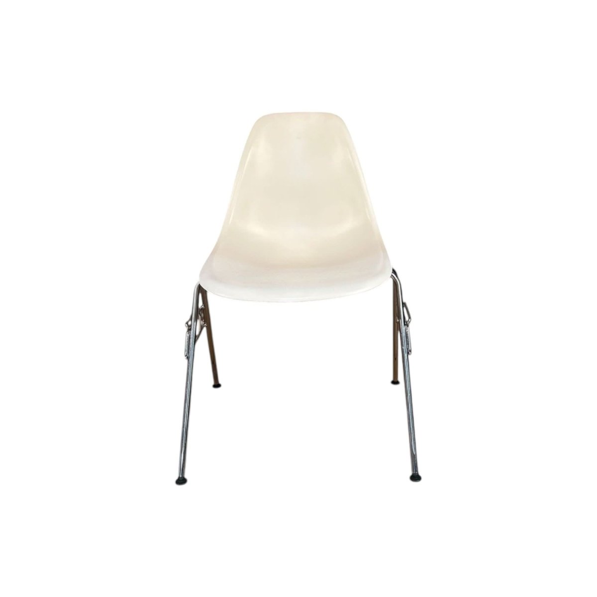 Pre loved Designer White Stacking Chair – Style, functionality and innovation, Charles and Ray Eames where certainly ahead of their time when it came to seating and is still iconic today. DSS, which stands for “dining side stacking,” encapsulates the essence of versatile seating. Its sleek chrome frame base combined with a seat in fibreglass not only adds a touch of modern elegance but also provides robust support that ensures lasting durability.