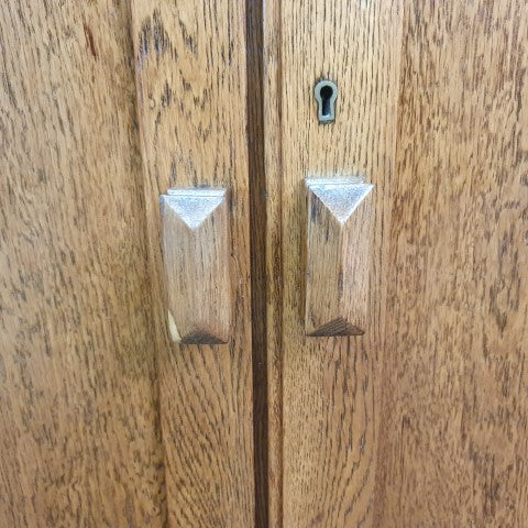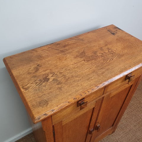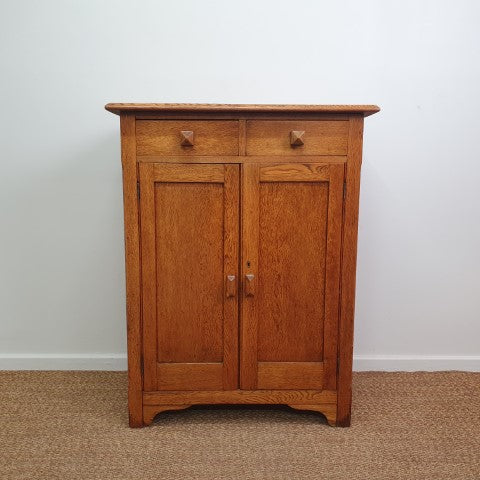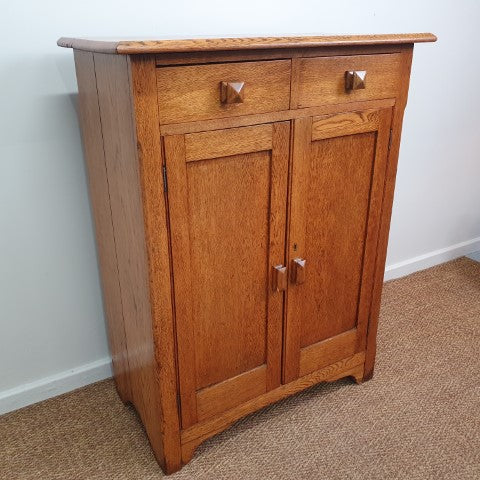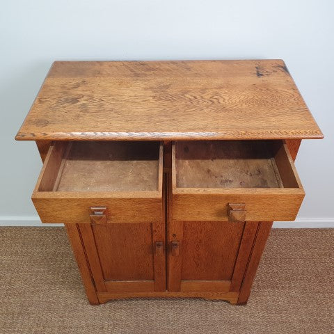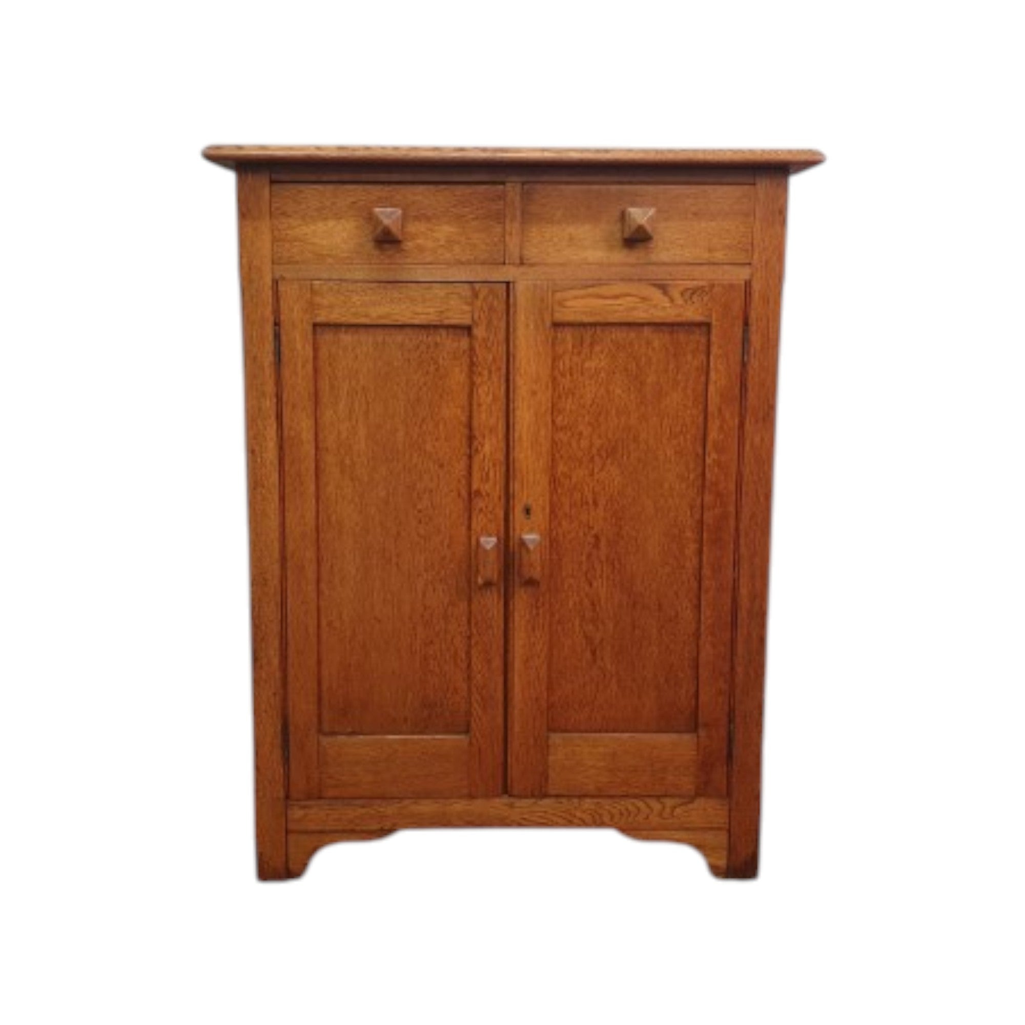 This English Arts & Crafts Movement oak cabinet features two doors and two drawers, highlighting the timber’s rich grain and the movement’s characteristic emphasis on craftsmanship and simplicity. Its classic proportions and timeless design make it a decorative piece for living areas, hallways, or dining rooms, blending effortlessly with traditional or eclectic interiors.
