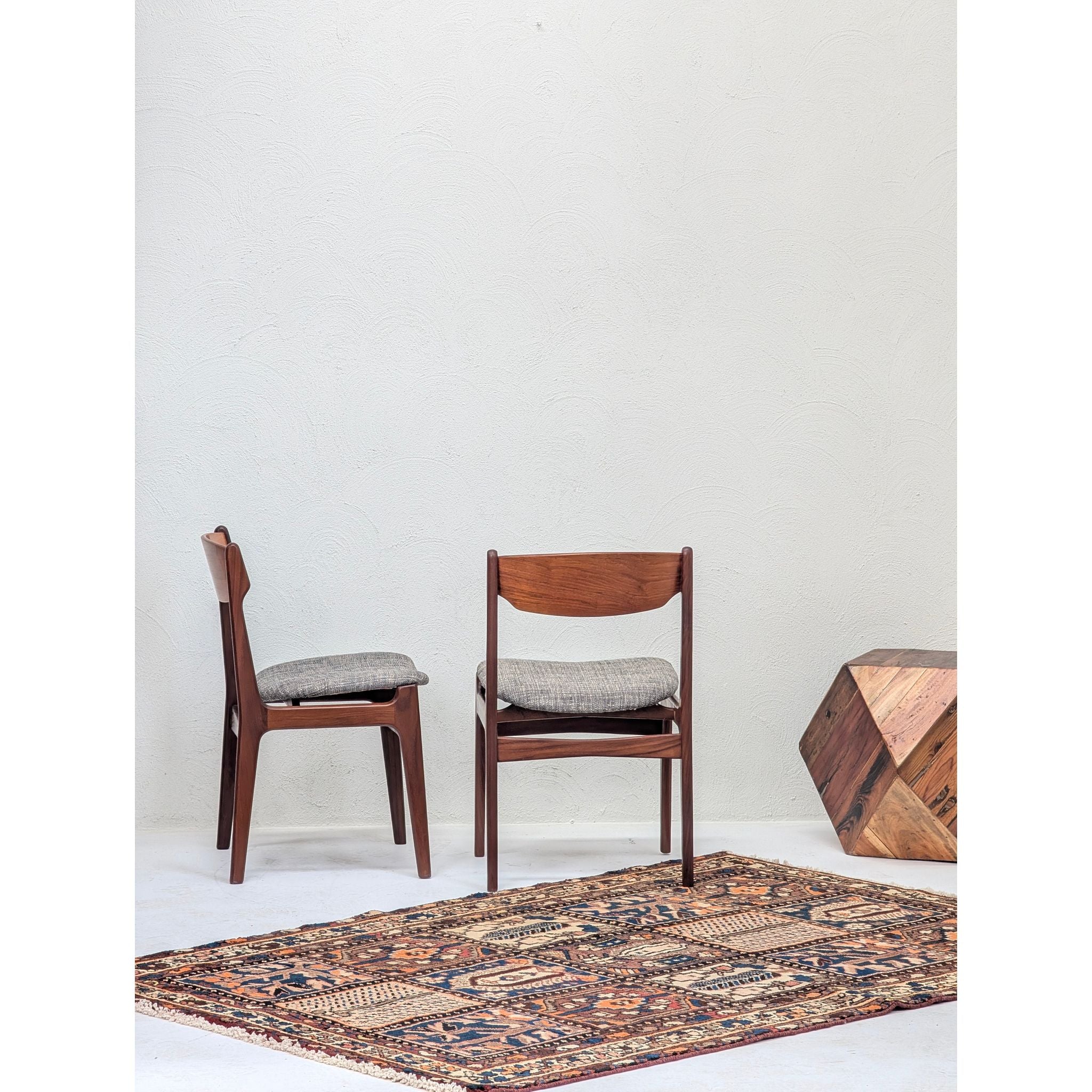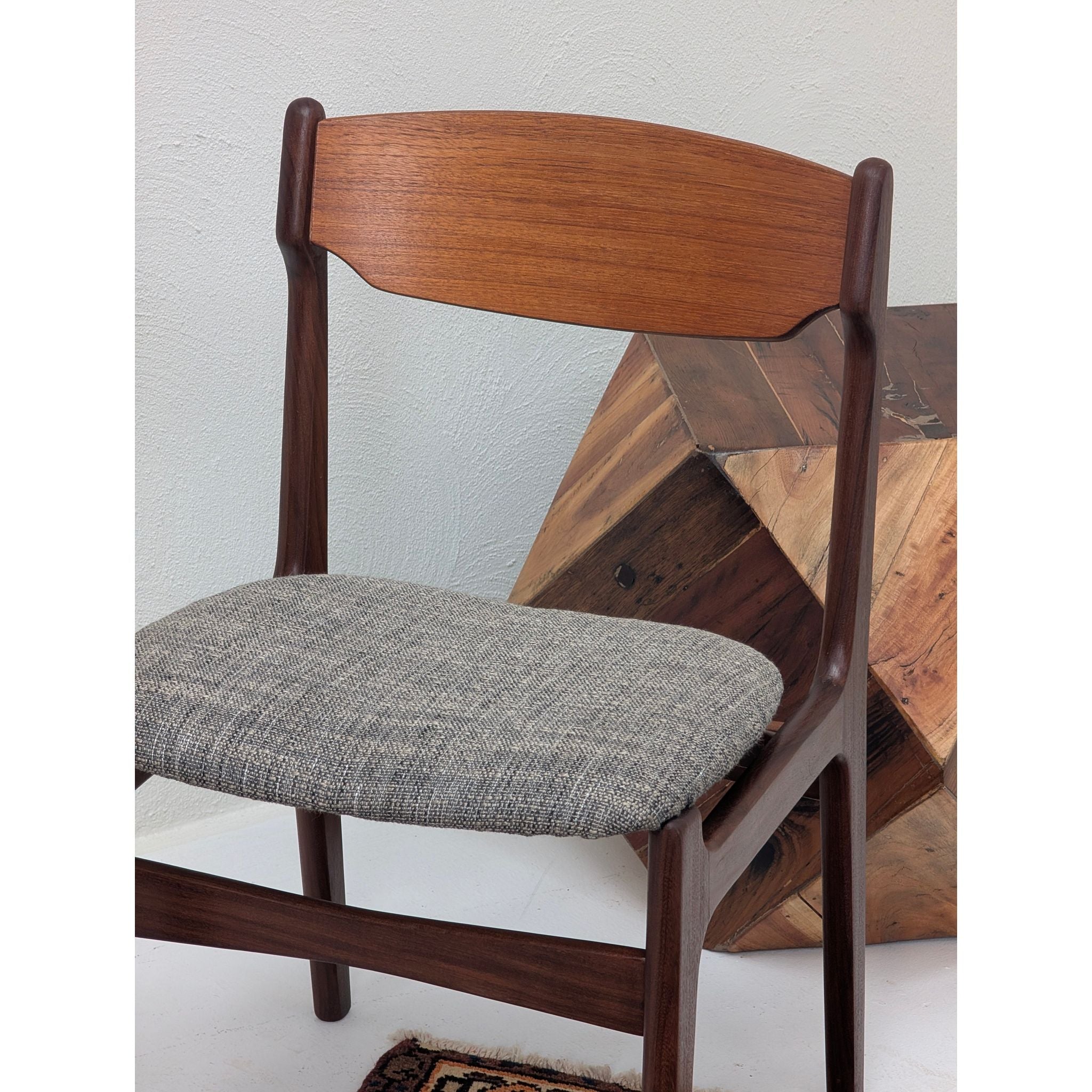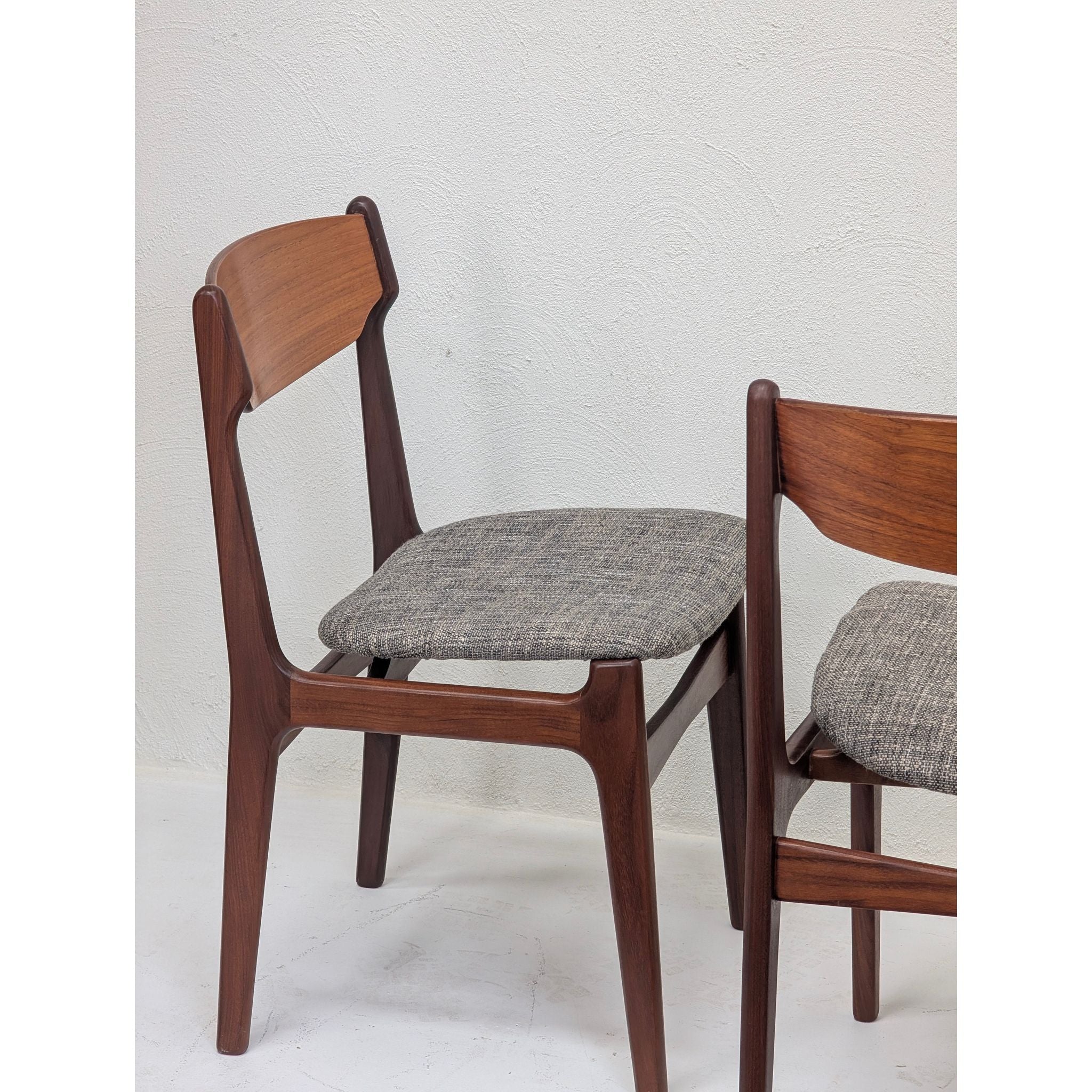 Both chairs have been professionally reupholstered in a high-quality textured grey fabric, modernising the aesthetic while respecting the original lines.