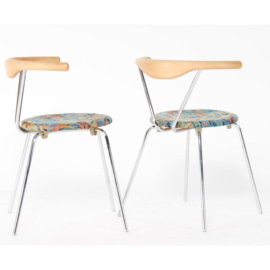 Set of six dining chairs in beech, chrome plated steel and original fabric. In good vintage condition.