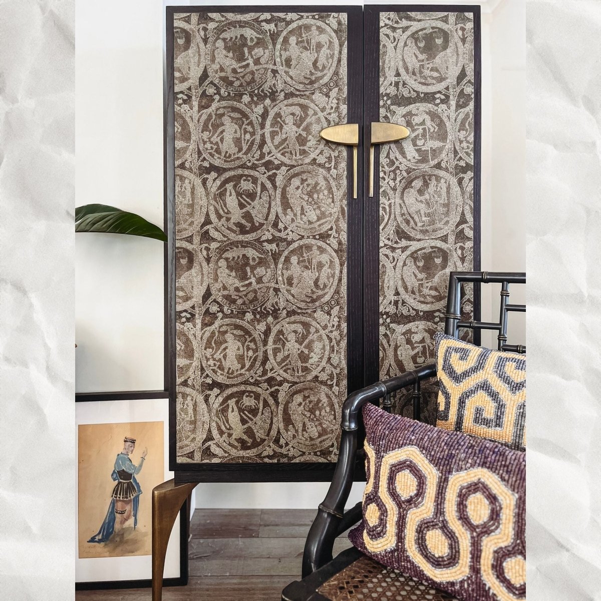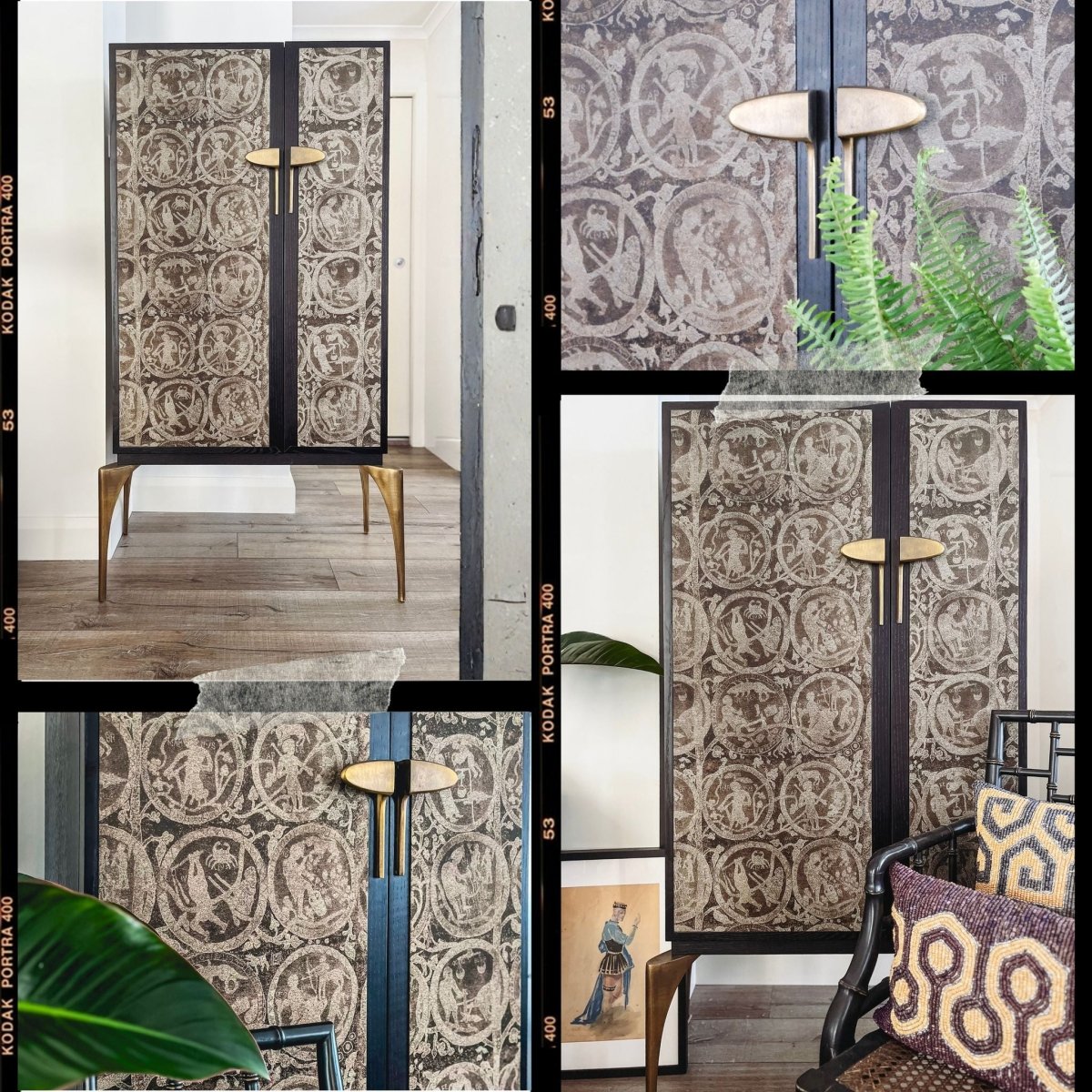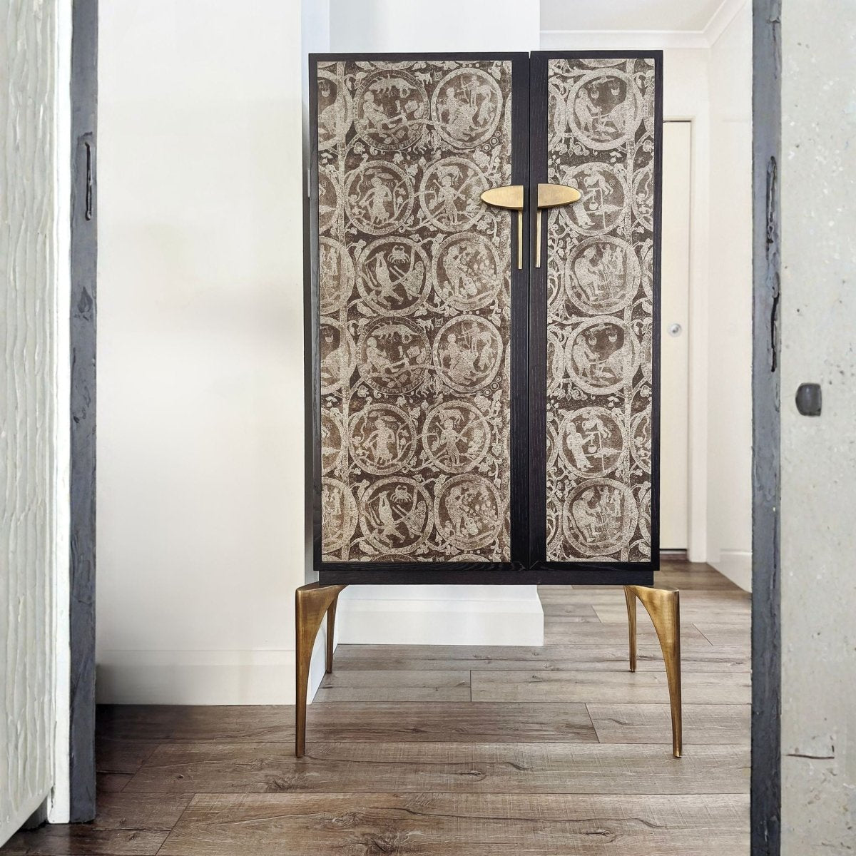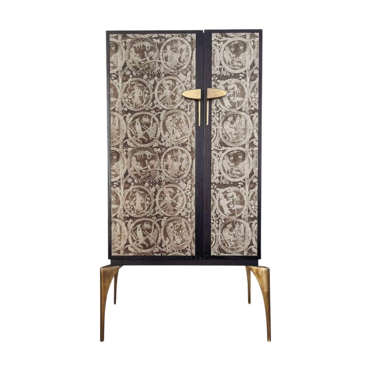 The design celebrates Art Deco influence with a contemporary French twist — ornate grey-taupe fabric panels with classical motifs framed in dark espresso oak. The sculptural brass legs (which give the cabinet its "Manolo" moniker as a playful homage to legendary Manolo Blahnik stiletto heels) create striking presence and sophisticated charm.