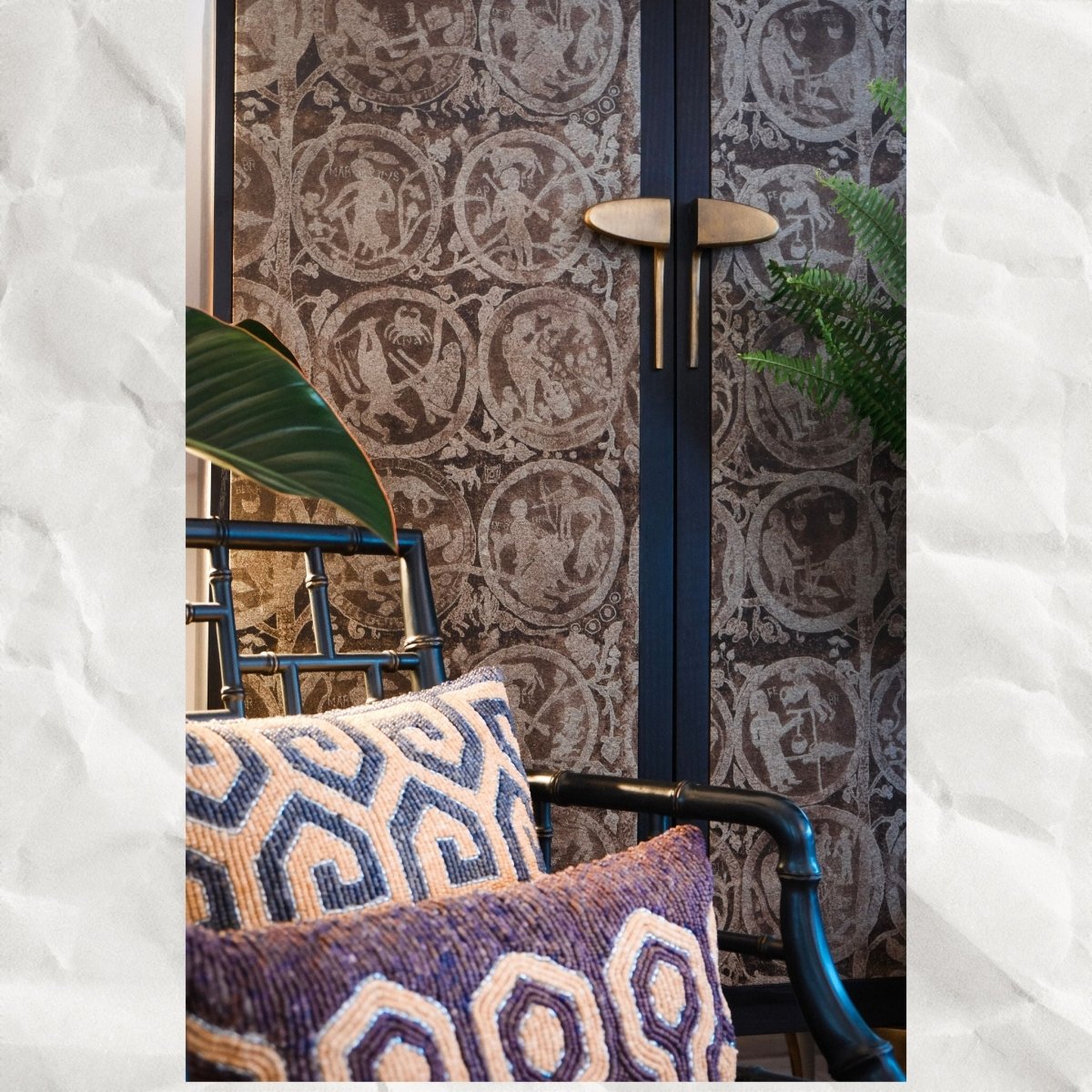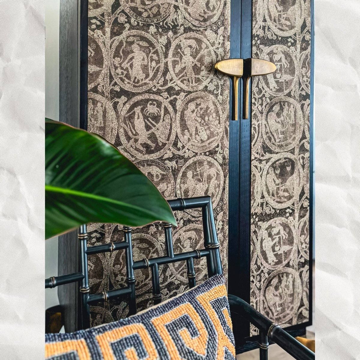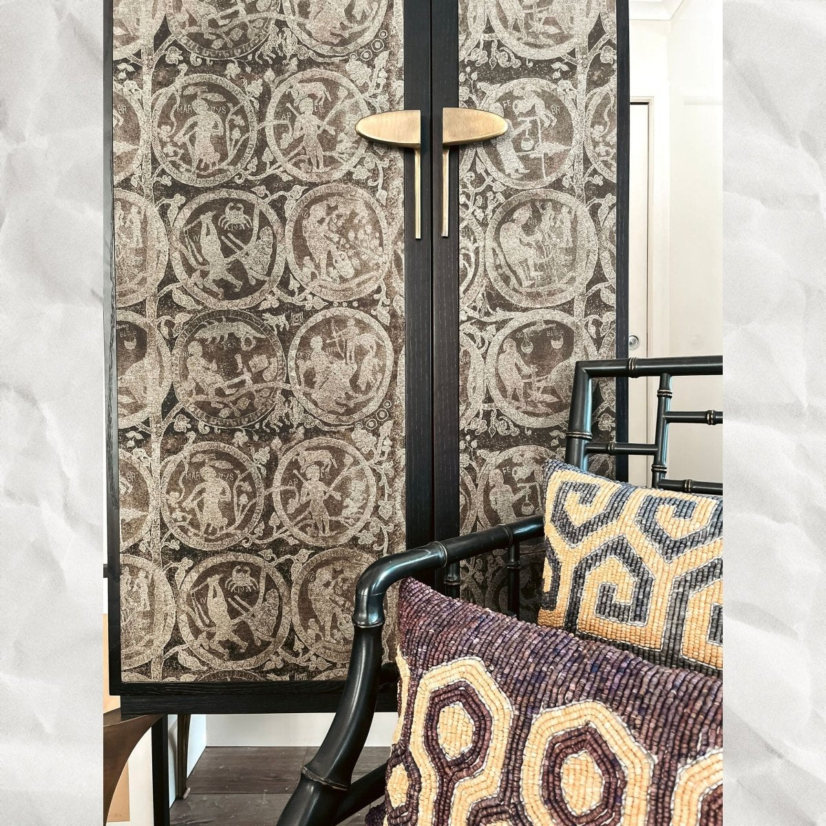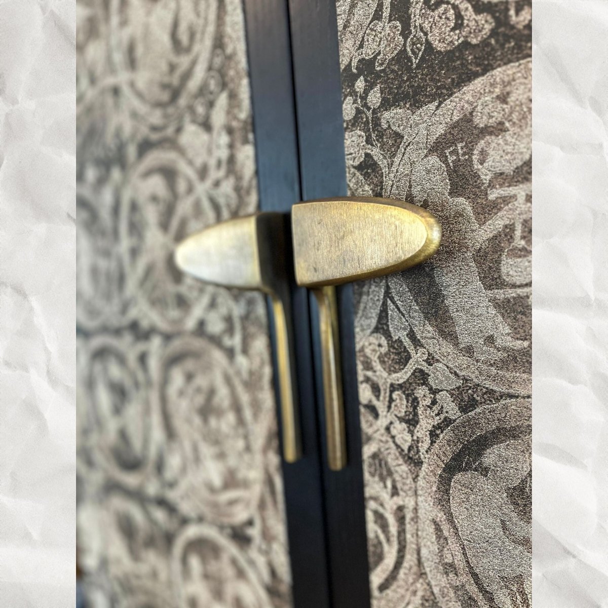 The design celebrates Art Deco influence with a contemporary French twist — ornate grey-taupe fabric panels with classical motifs framed in dark espresso oak. The sculptural brass legs (which give the cabinet its "Manolo" moniker as a playful homage to legendary Manolo Blahnik stiletto heels) create striking presence and sophisticated charm.