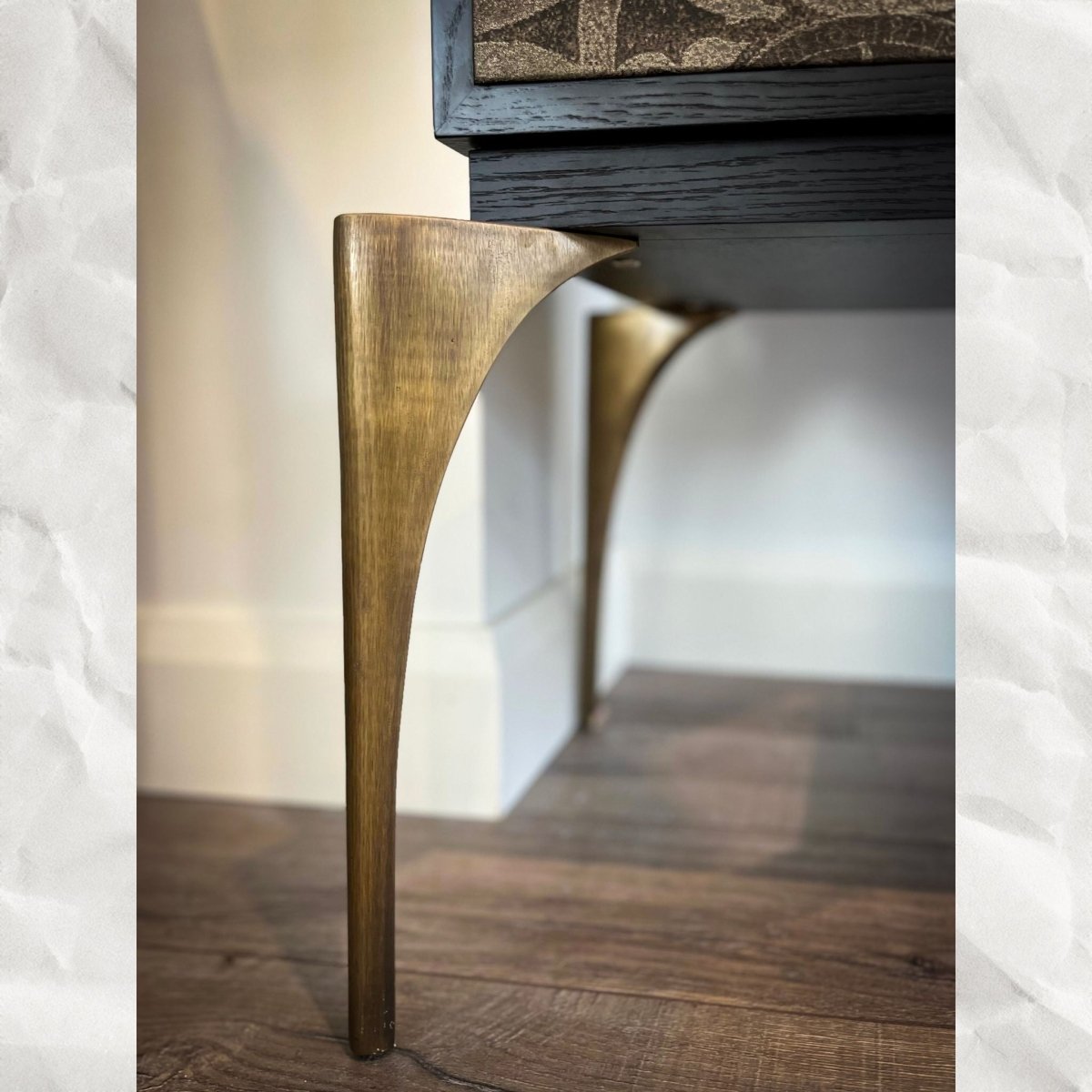 - Legs/Handles: Hand-cast tapered brass in signature "high heel" form