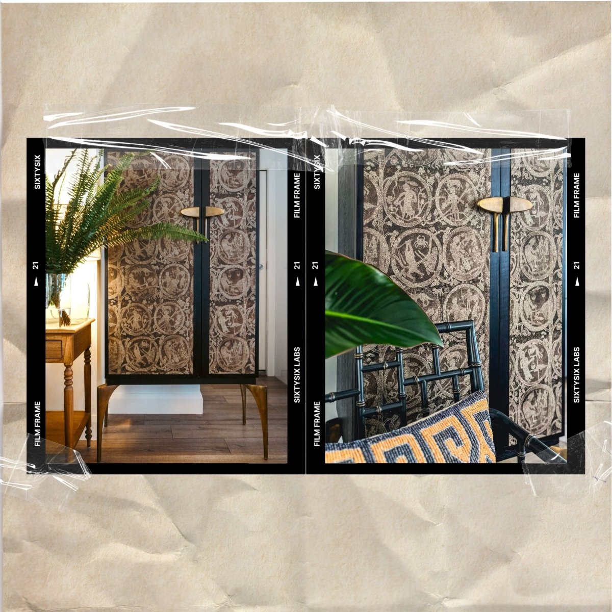 - Doors: Two fabric-upholstered facades (grey-taupe classical motif)