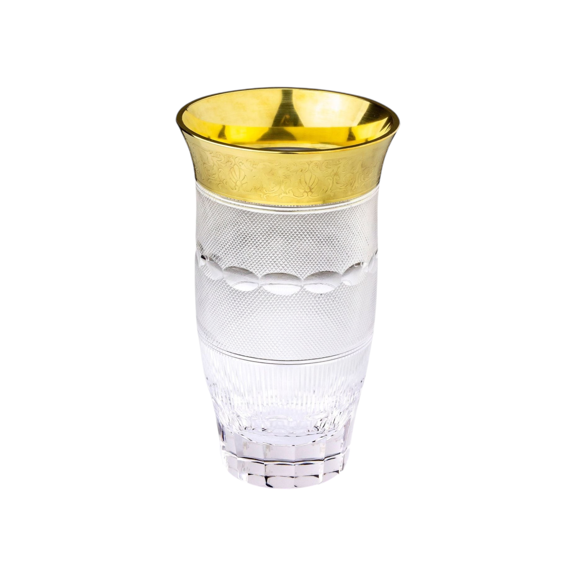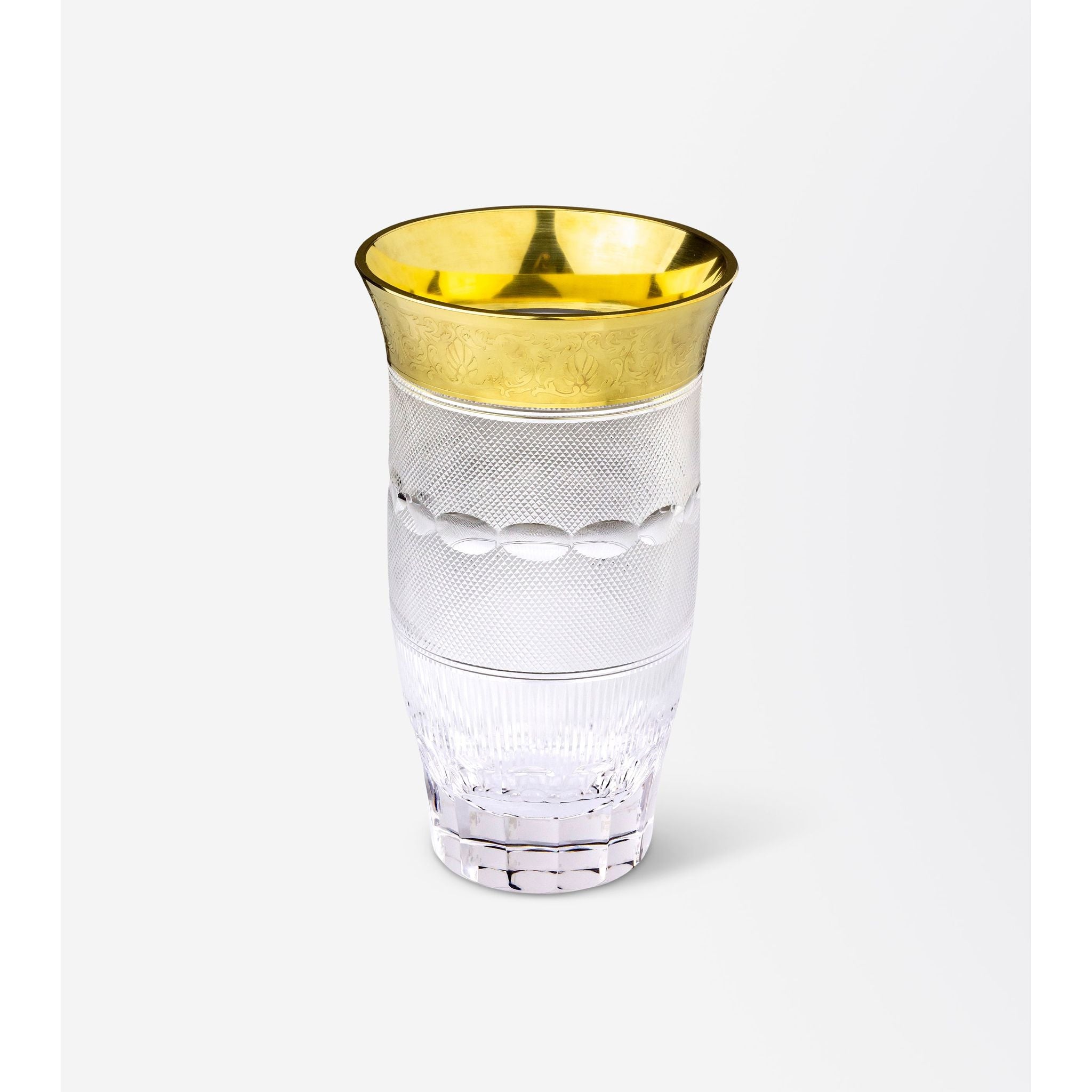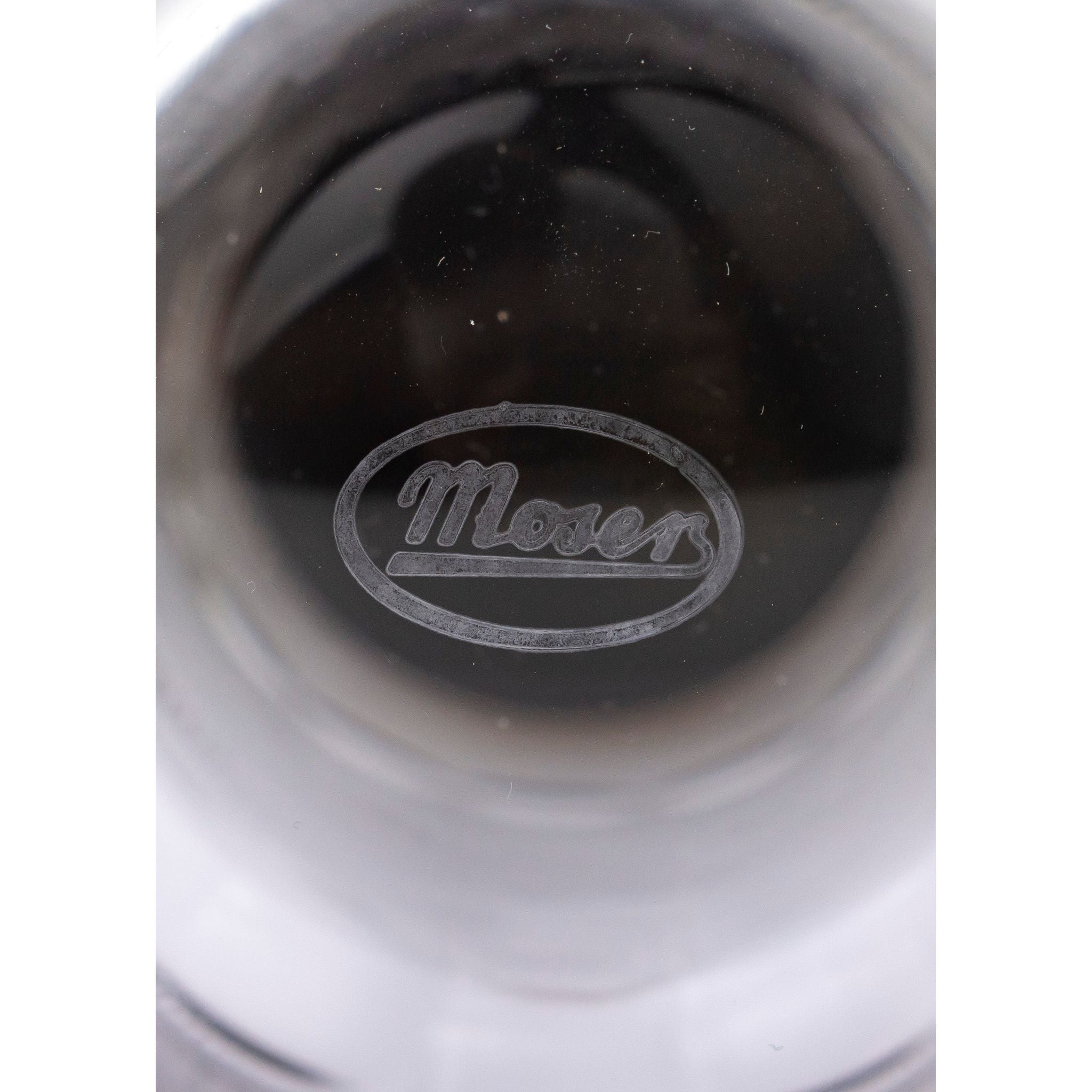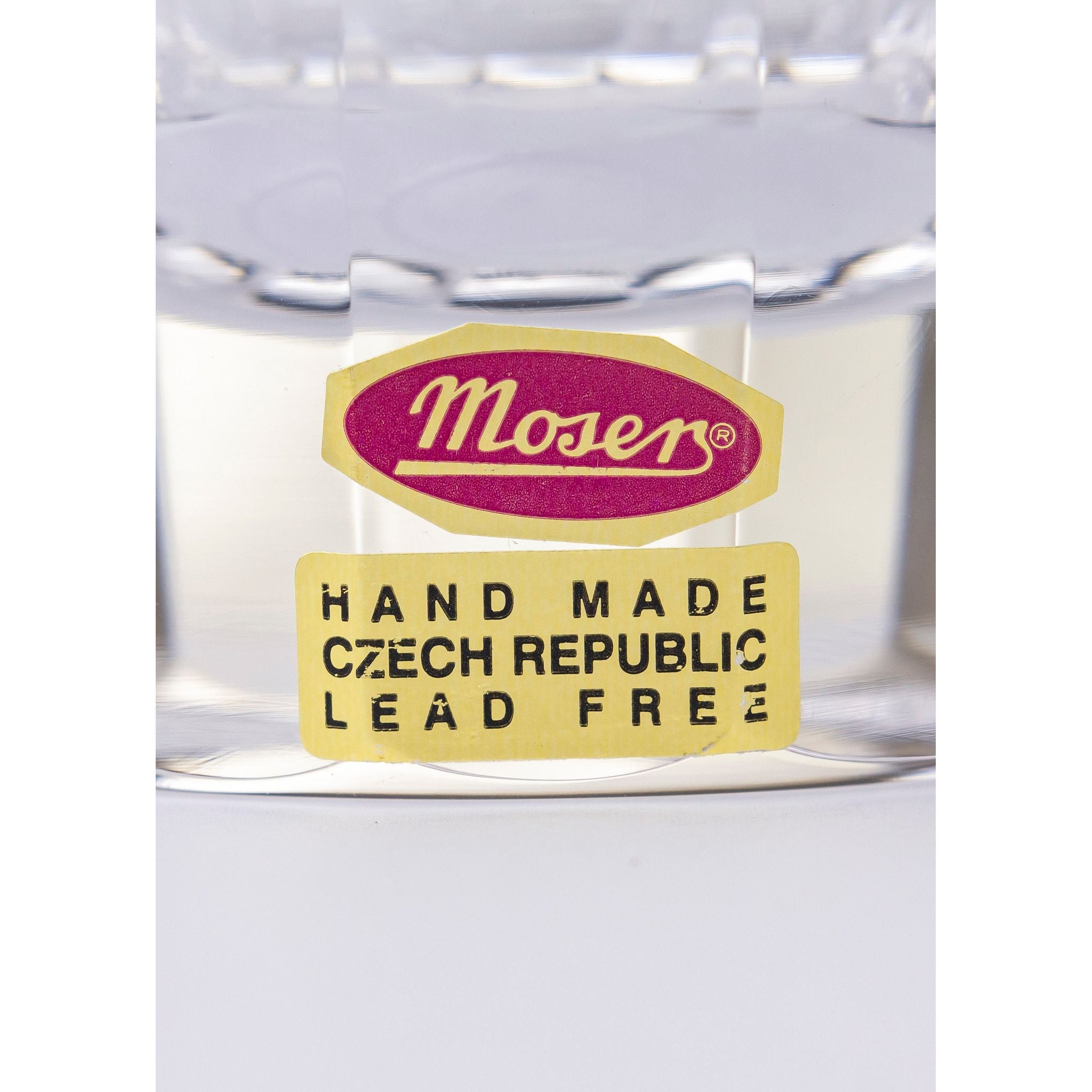 This very practical vase was made in the Czech Republic by famed glassmaker, Moser. The vase which is made from lead free crystal is in the 'Splendid' pattern which was first introduced by Leo Moser in 1911. The pattern features an ornate 24 karat gilt rim which sits atop of a very intricate cut crystal body and has been made in a variety of shapes and sizes throughout its history. The Splendid pattern has been a staple among some of the world's finest dining rooms for decades with the Czechoslovak president gifting the late Queen Elizabeth II a selection of Spendid crystal for her wedding in 1947. This particular vase retains its original retailing label and has an acid etched signature to the underside which have helped us date its manufacture to post 1992, when Czechoslovakia became the Czech Republic. In immaculate condition, the vase has very few signs of wear, with no chips or cracks to the crystal, and even minimal wear to the underside. A gorgeous piece of Moser crystal which would hold a dozen roses very beautifully. Marked - 'Moser' acid etched to underside and original retailing label Measures - 24.5cm H x 14cm D (at widest)
