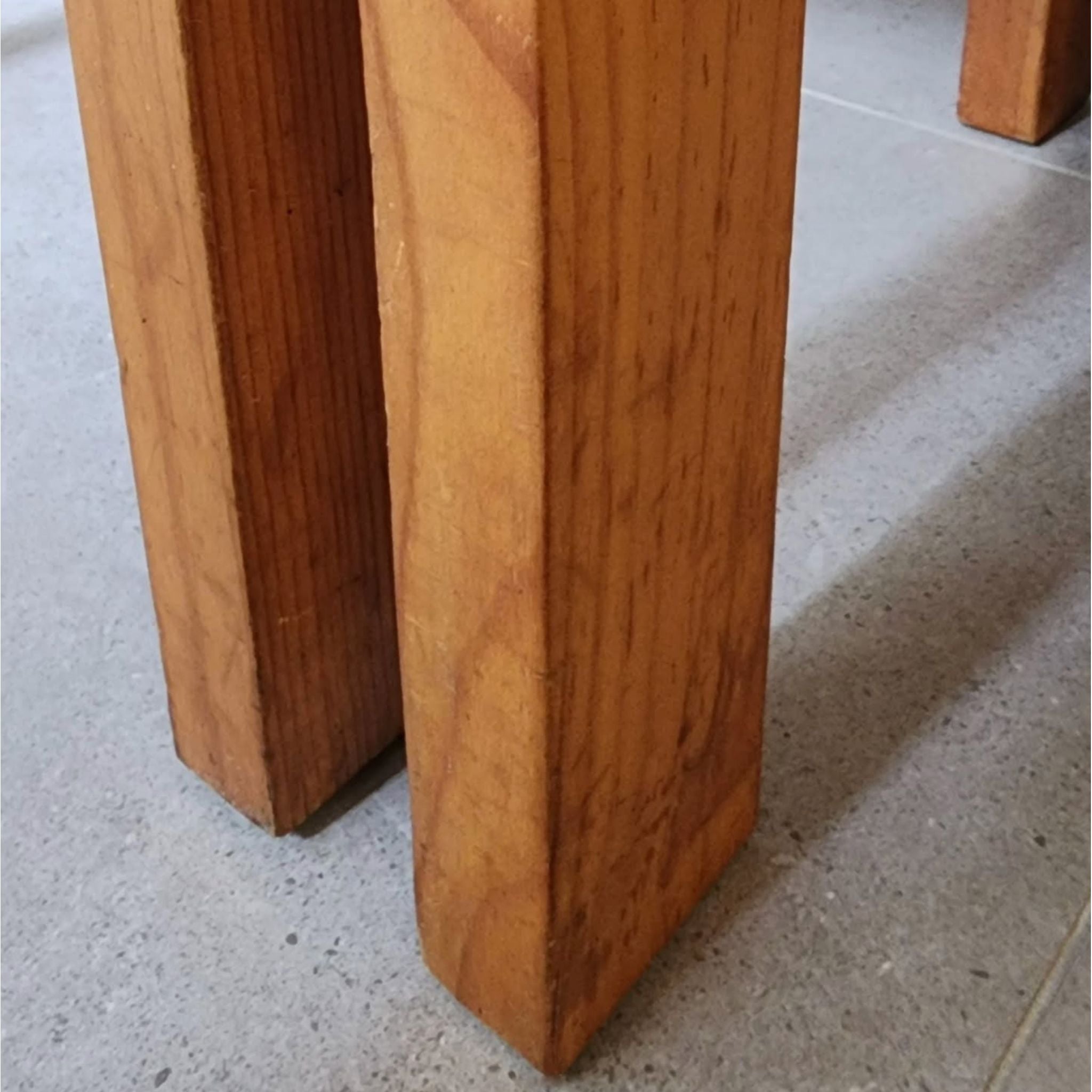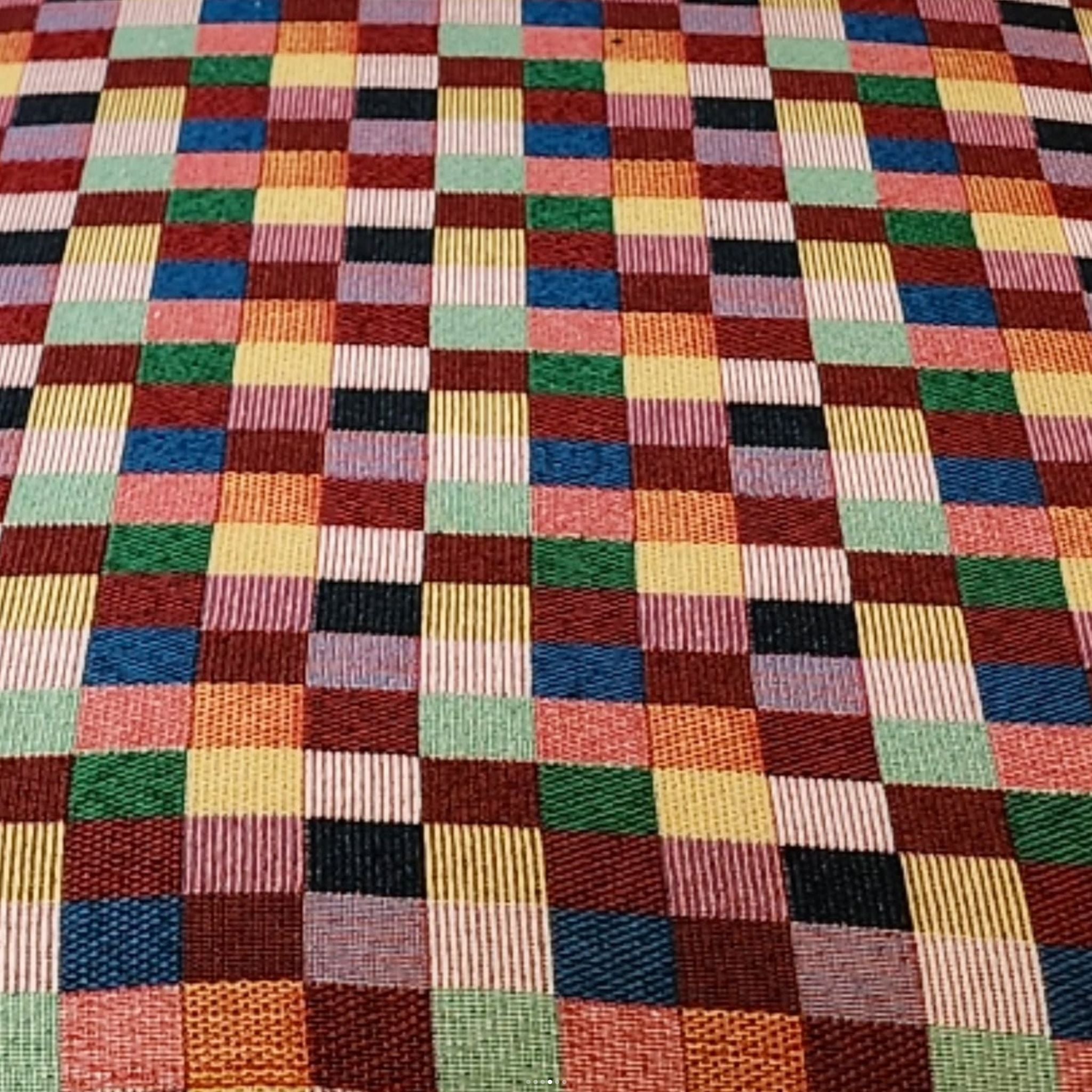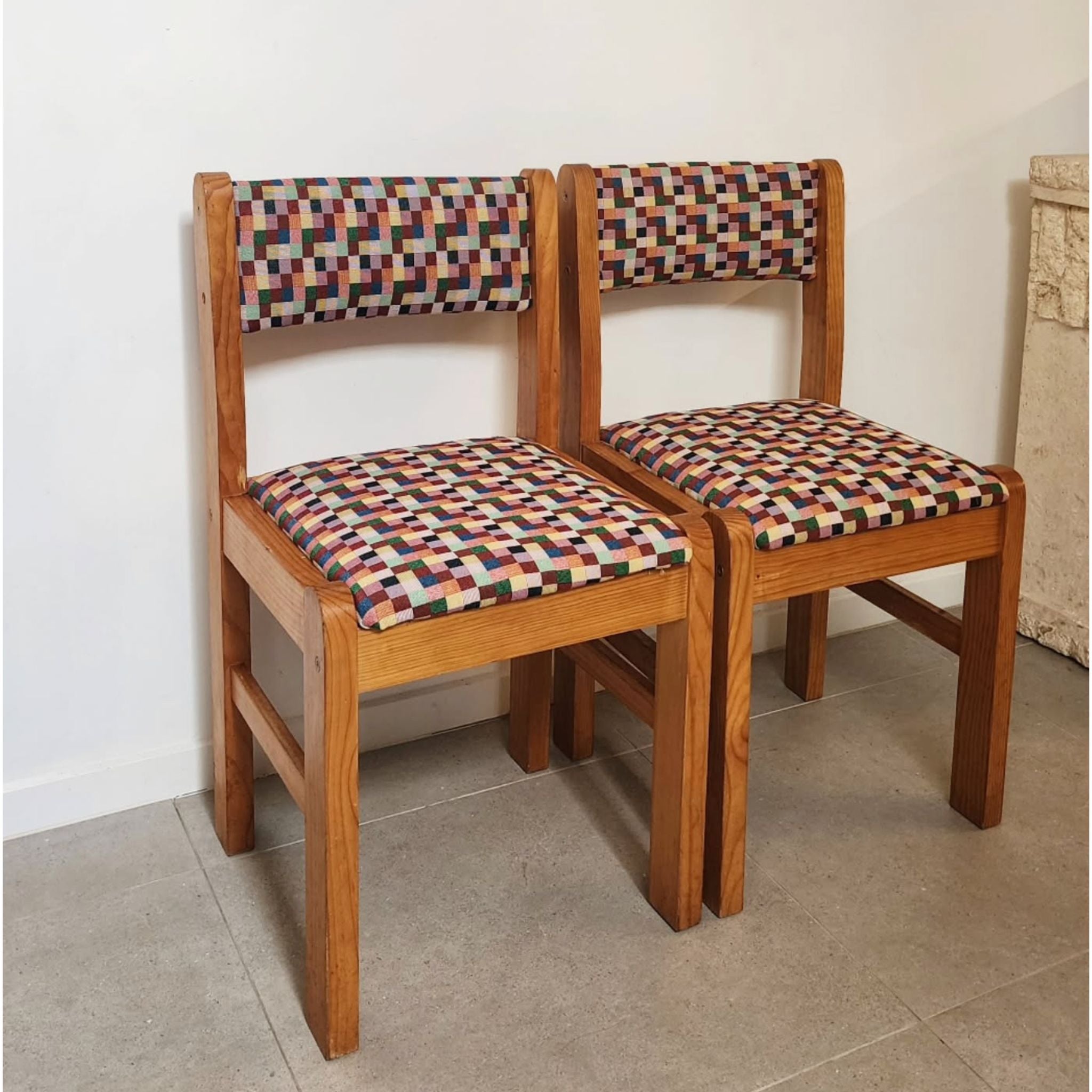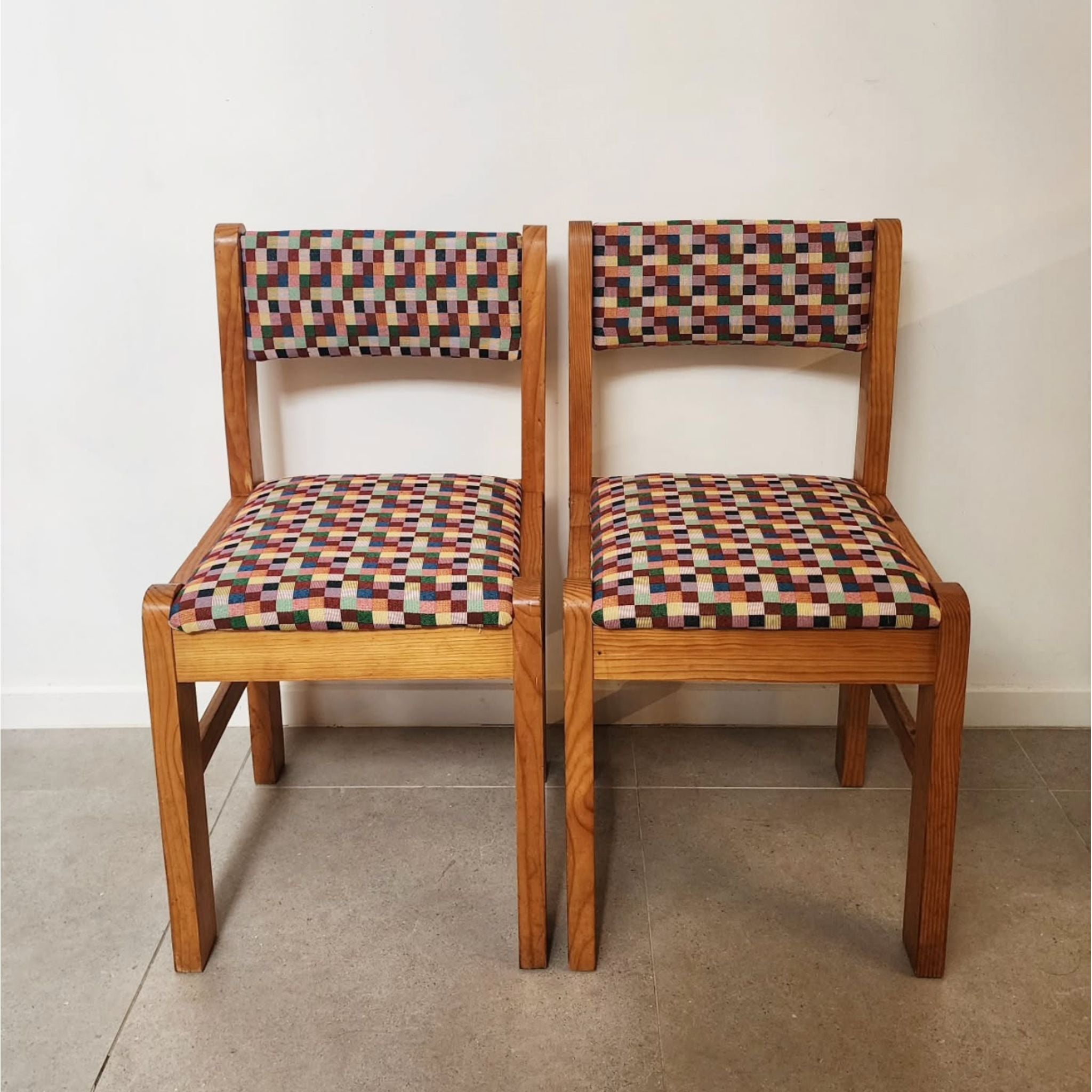 Upcycled vintage pine chairs reimagined with a bold multicolour checkered fabric. Solid, simple lines softened by a playful, graphic textile—fun, functional, and full of character.