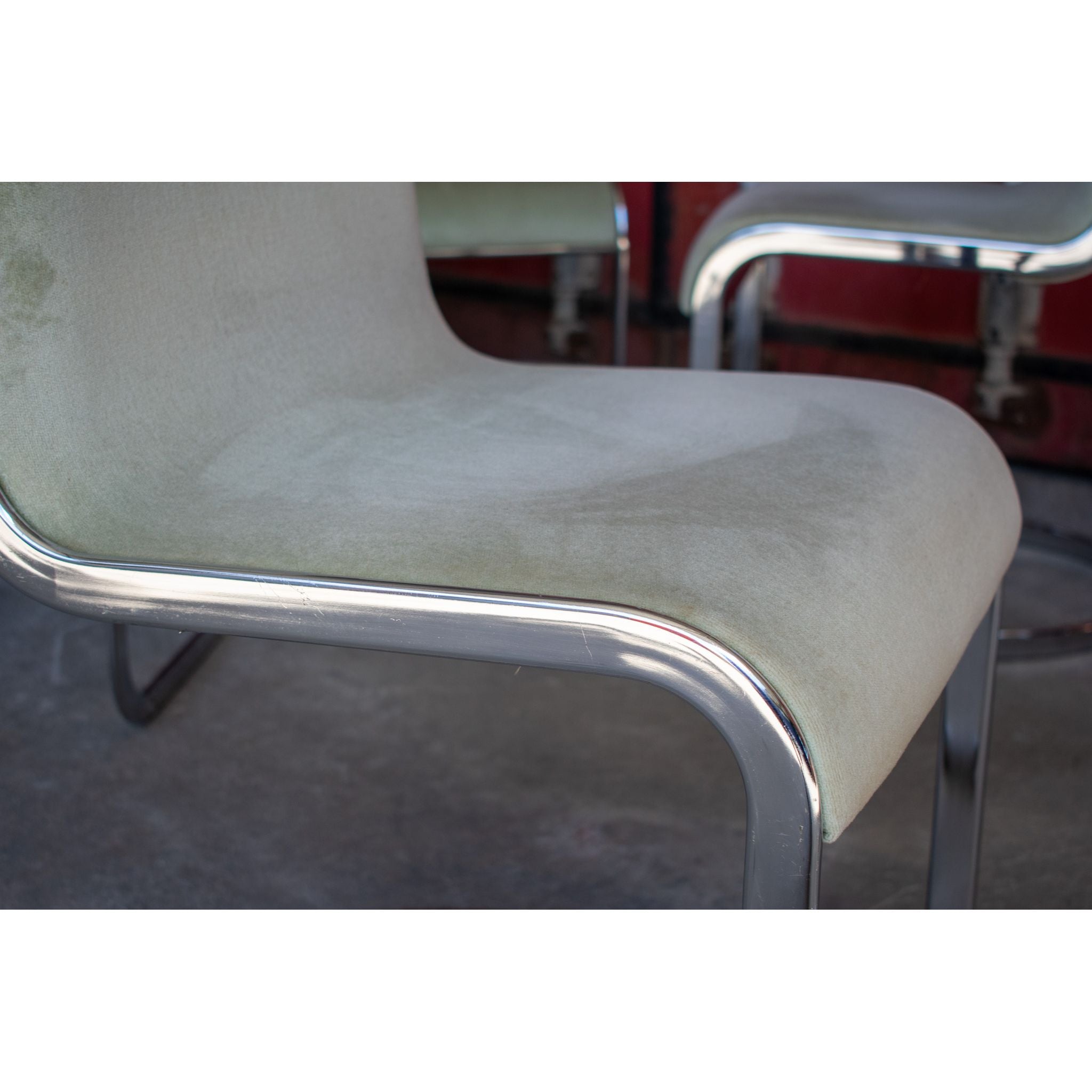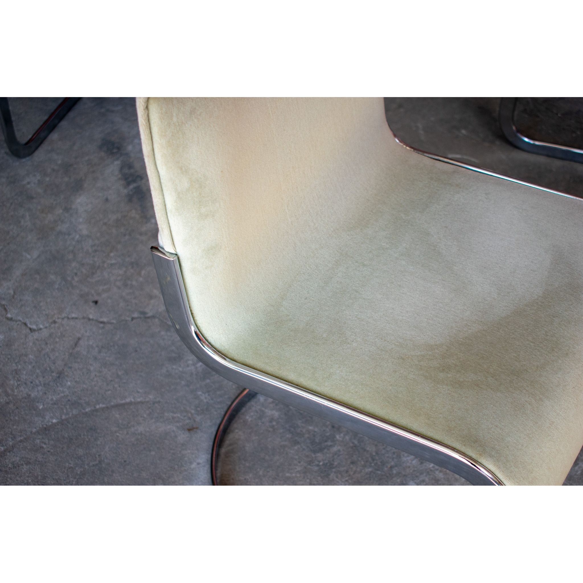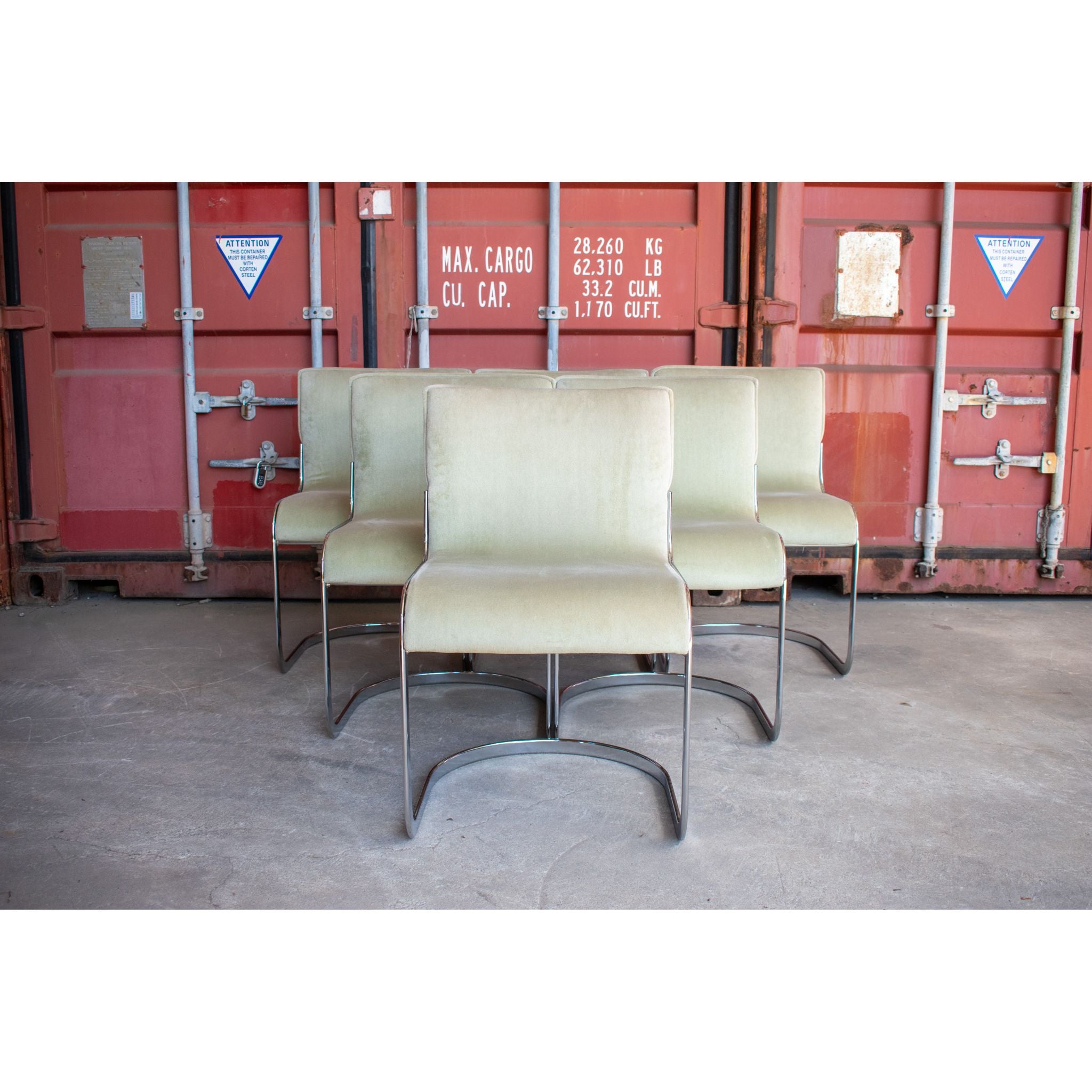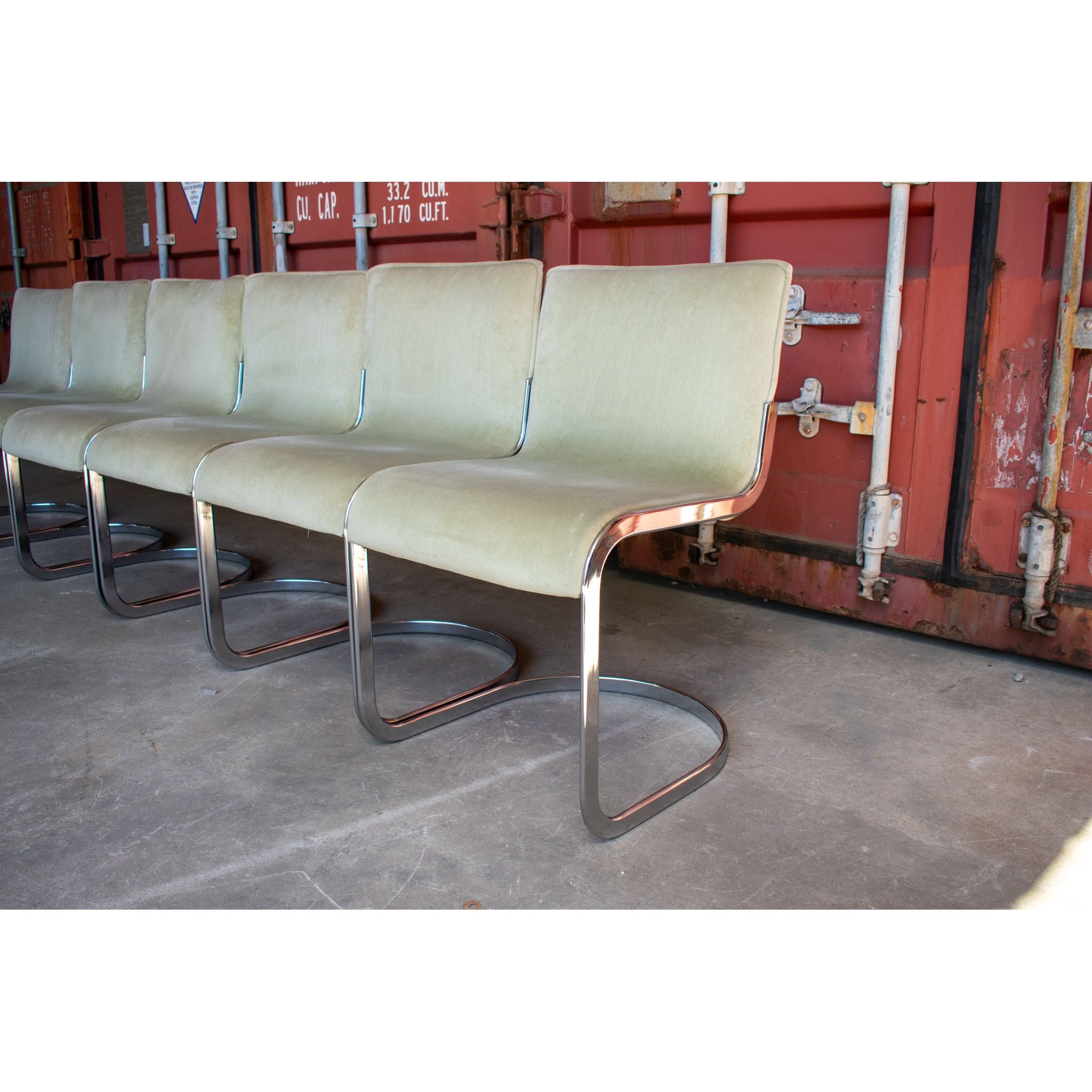 Set of six vintage cantilever dining chairs with polished chrome tubular frames and light sage velour upholstery. The design offers a sleek modernist silhouette with gentle bounce and ergonomic comfort, reflecting the influence of Bauhaus and postmodern European production. Frames and upholstery have been professionally cleaned; some marks remain consistent with age and use. Overall presentation is clean, stable, and in good vintage condition.