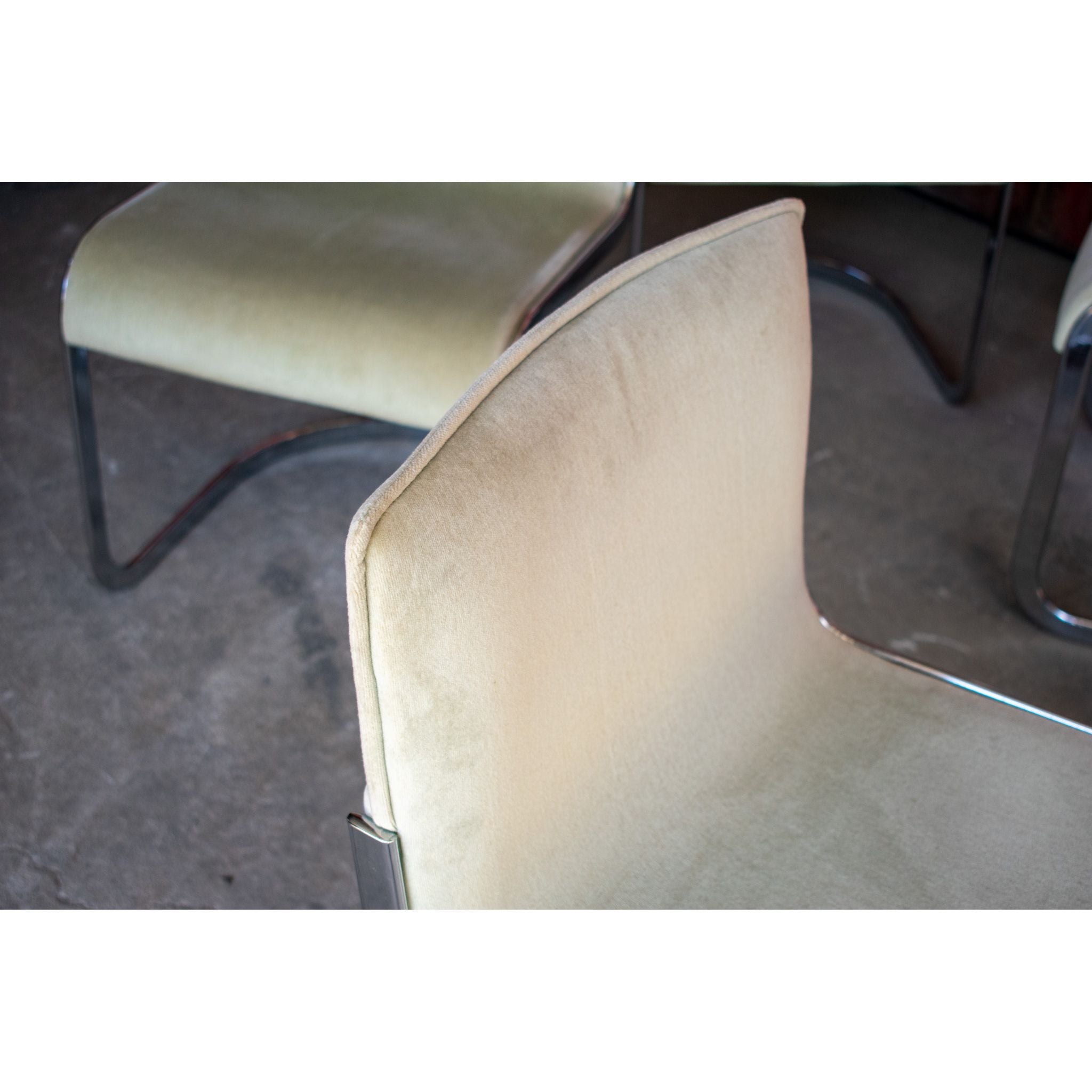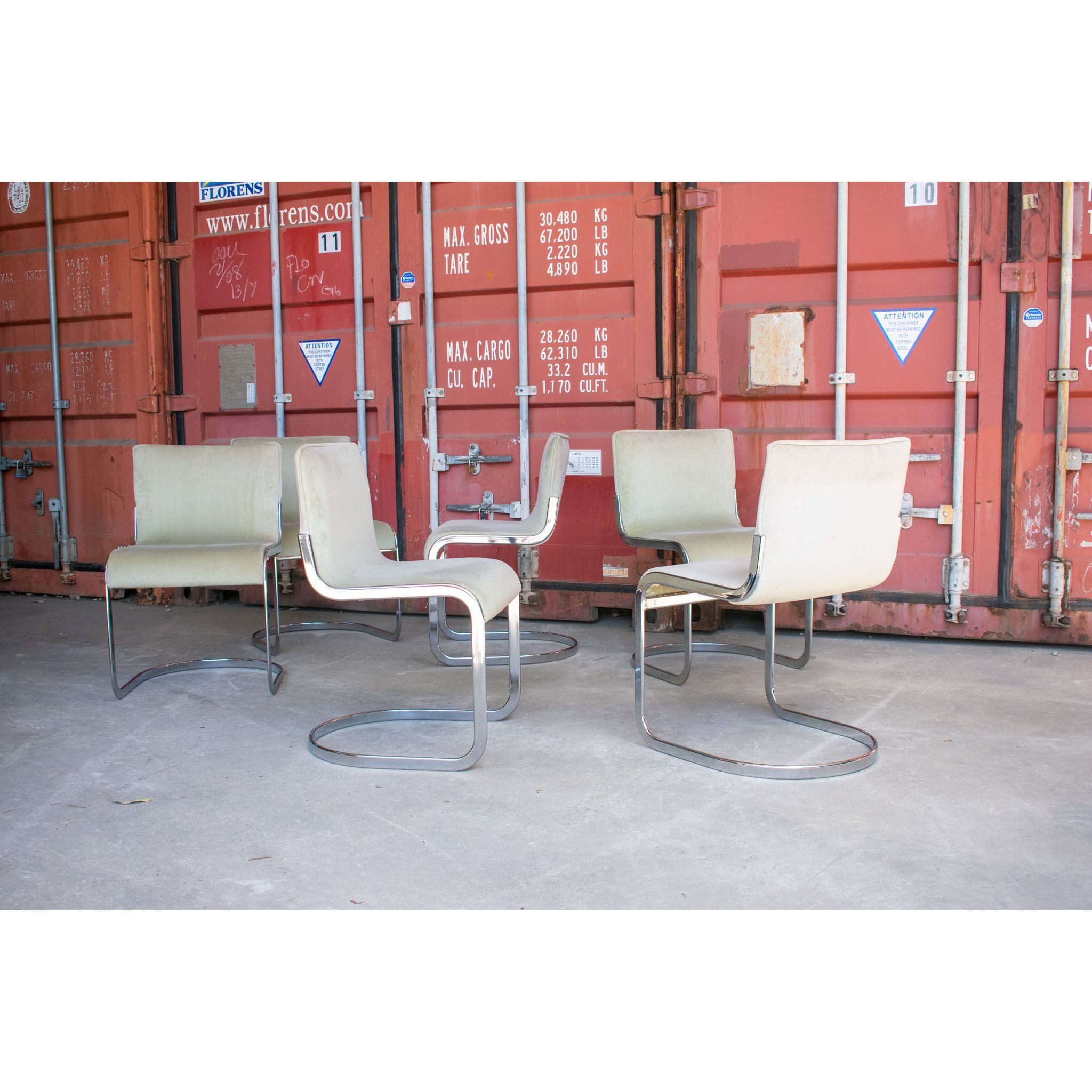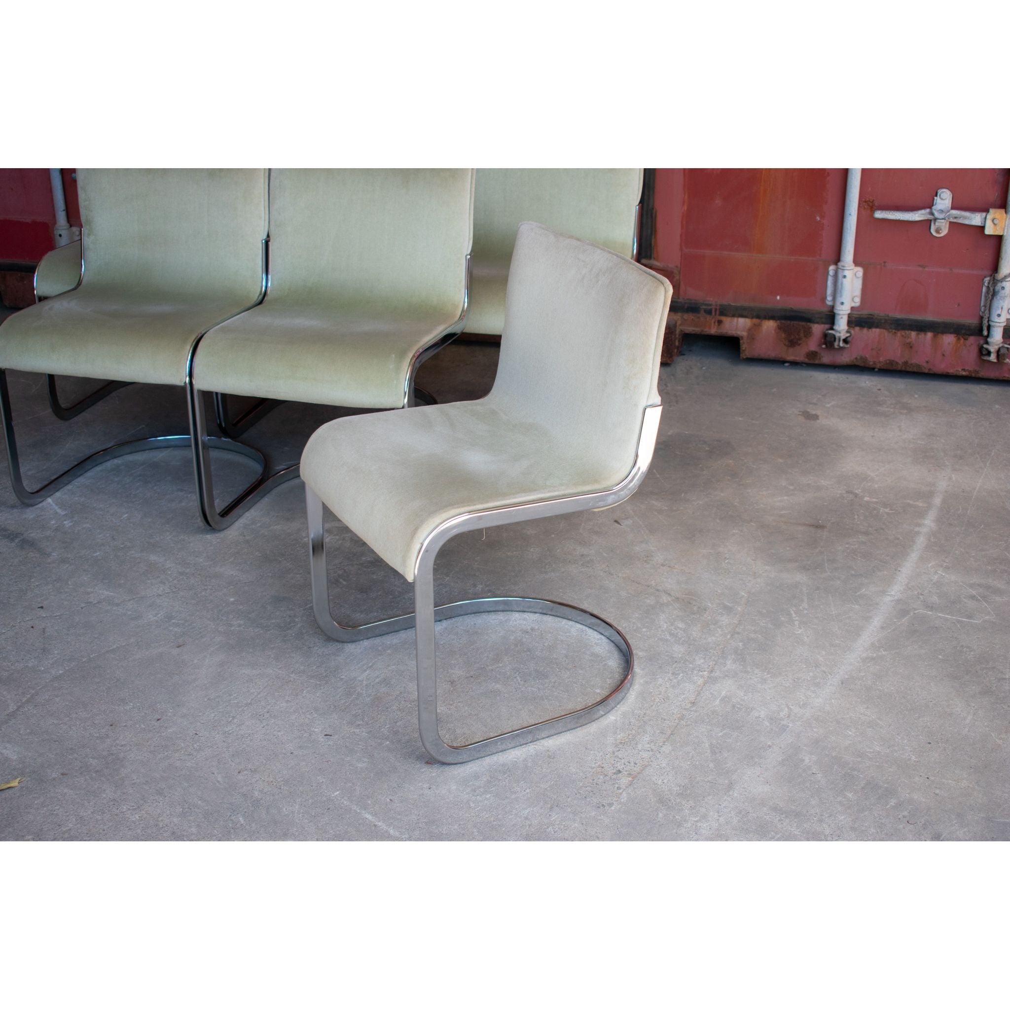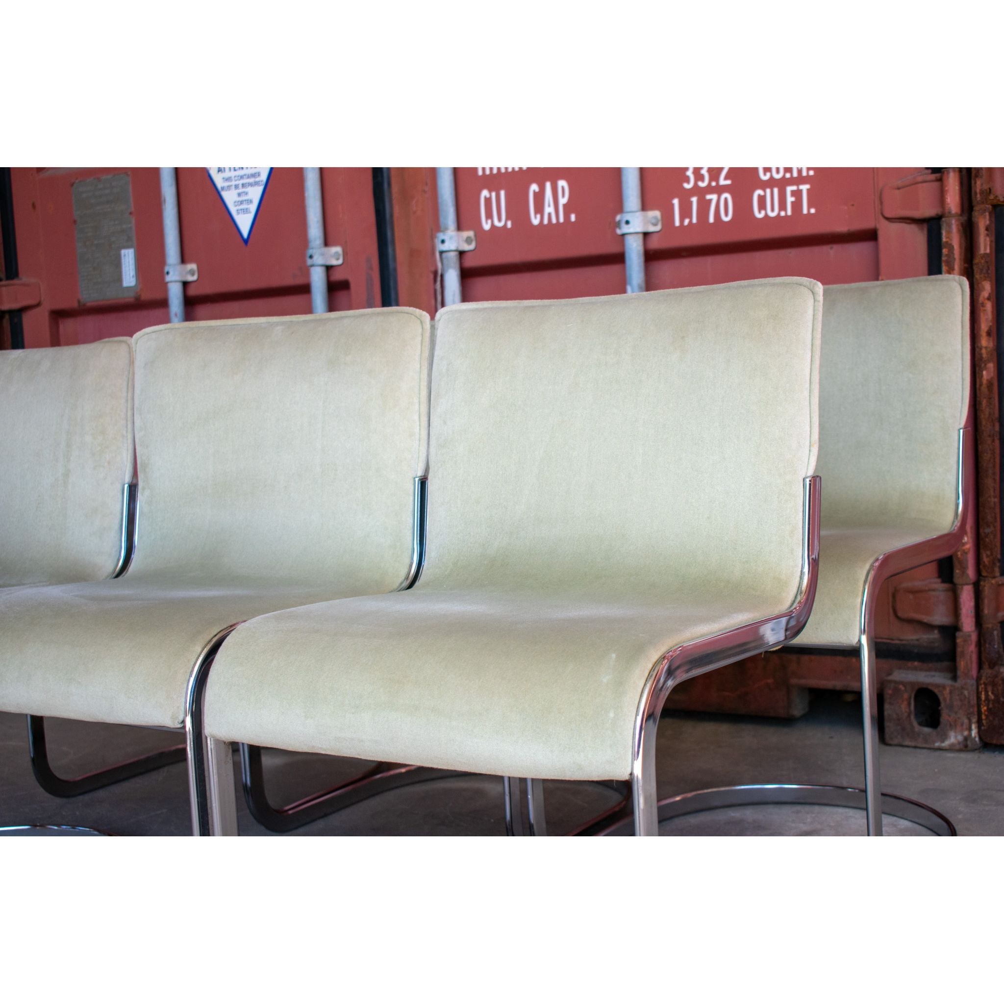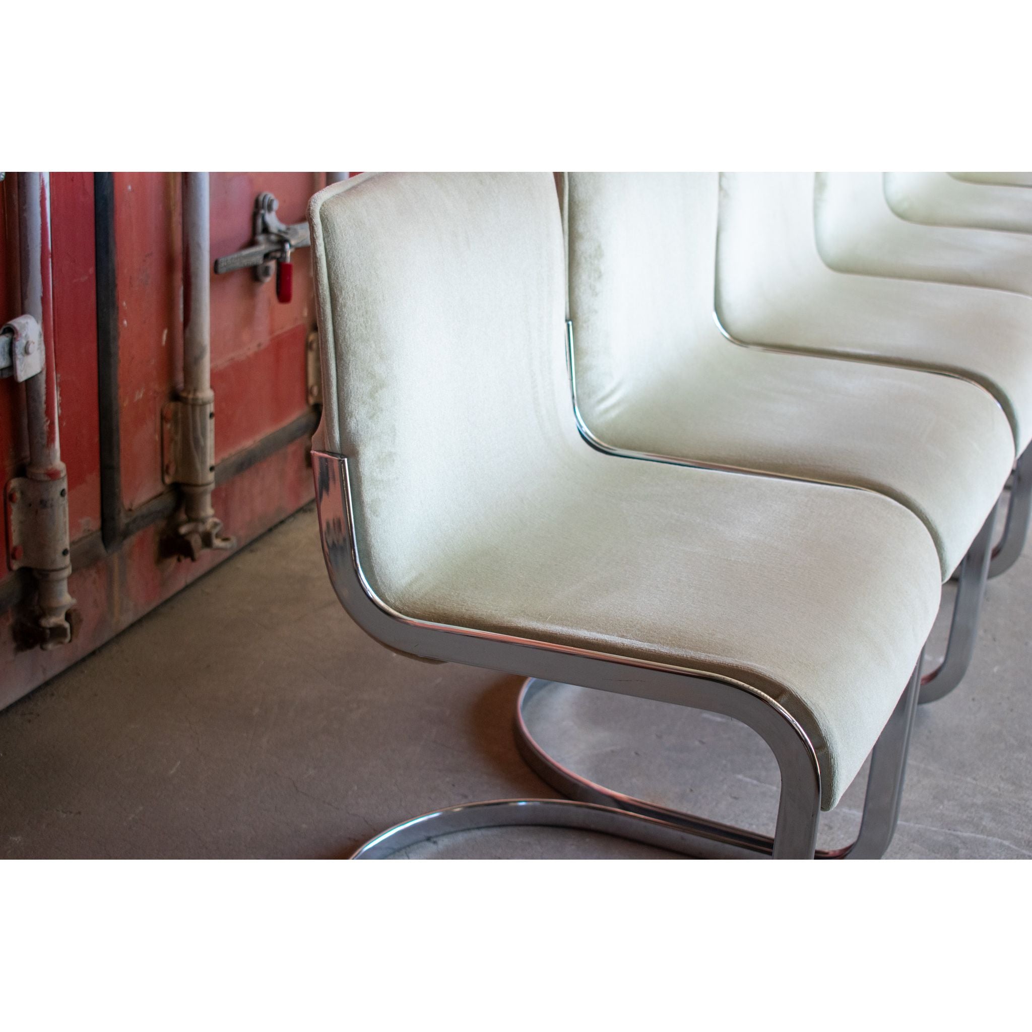 Set of six vintage cantilever dining chairs with polished chrome tubular frames and light sage velour upholstery. The design offers a sleek modernist silhouette with gentle bounce and ergonomic comfort, reflecting the influence of Bauhaus and postmodern European production. Frames and upholstery have been professionally cleaned; some marks remain consistent with age and use. Overall presentation is clean, stable, and in good vintage condition.