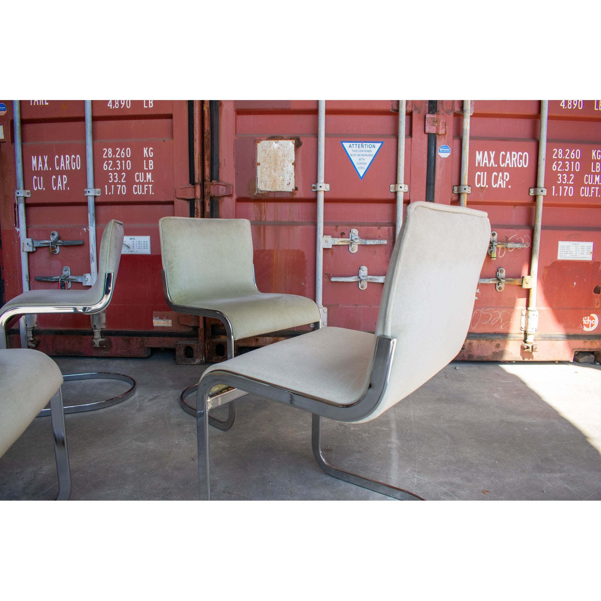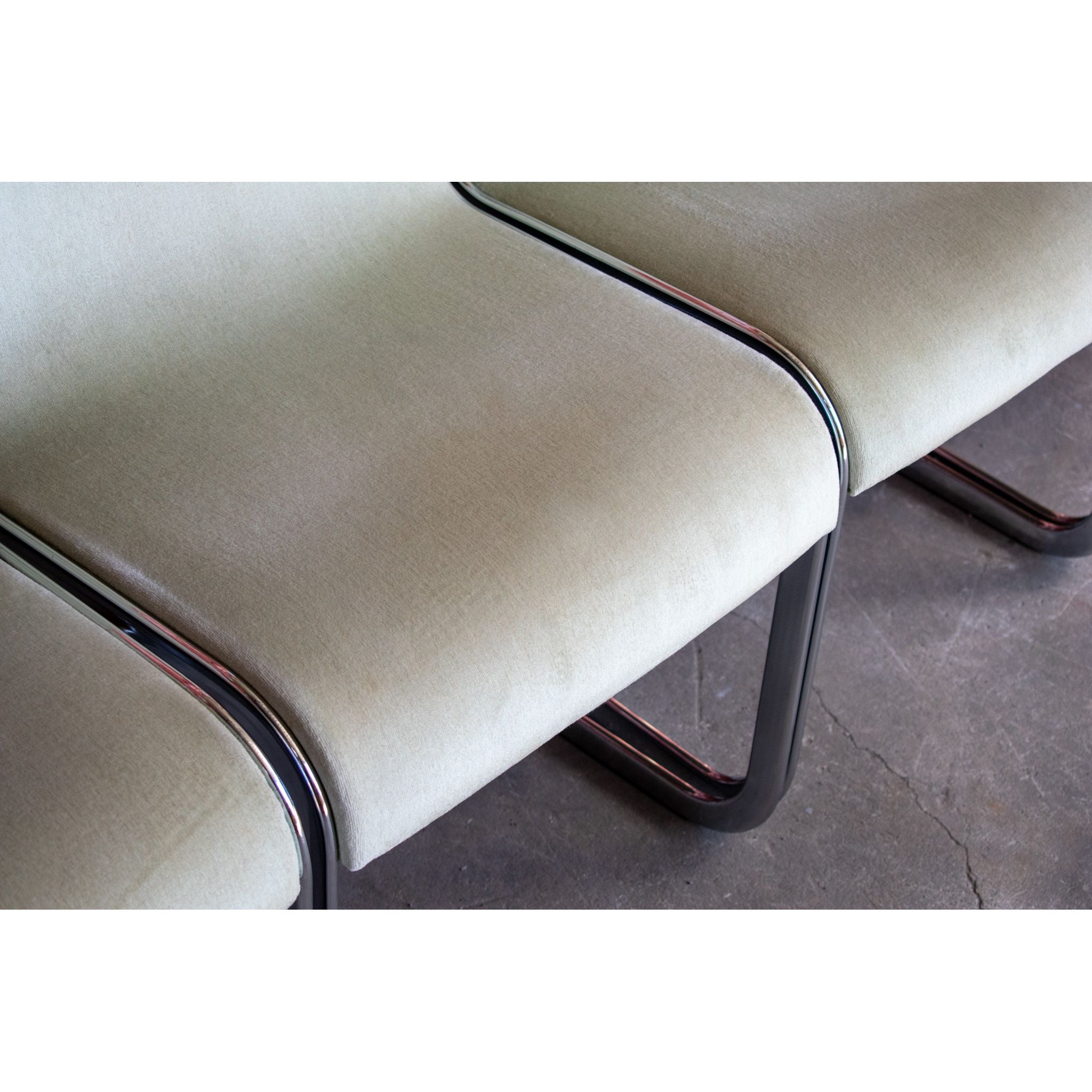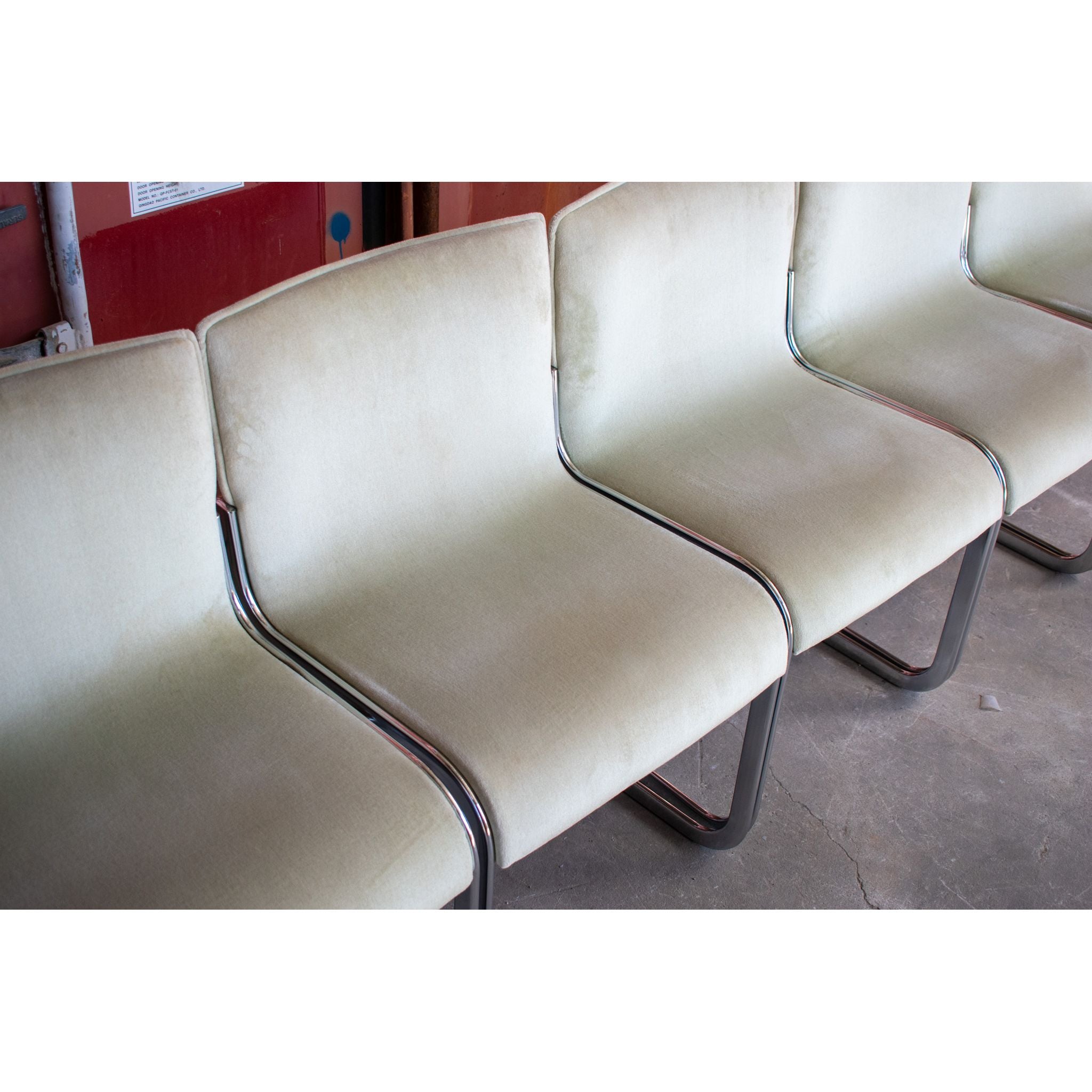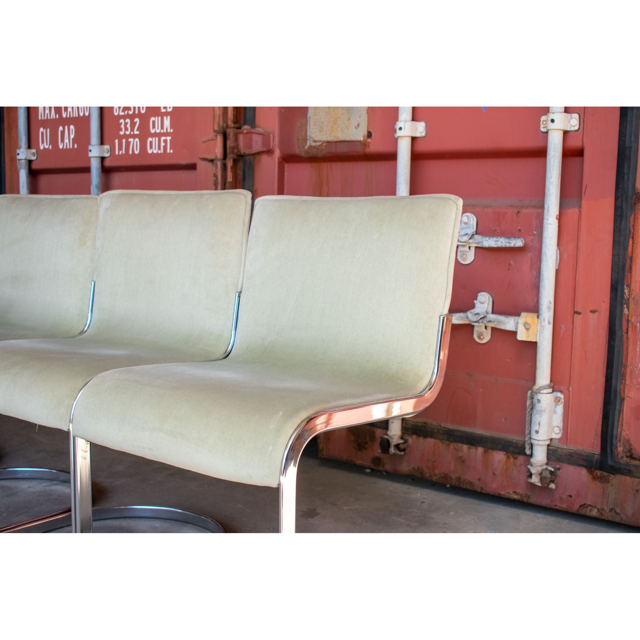 Set of six vintage cantilever dining chairs with polished chrome tubular frames and light sage velour upholstery. The design offers a sleek modernist silhouette with gentle bounce and ergonomic comfort, reflecting the influence of Bauhaus and postmodern European production. Frames and upholstery have been professionally cleaned; some marks remain consistent with age and use. Overall presentation is clean, stable, and in good vintage condition.