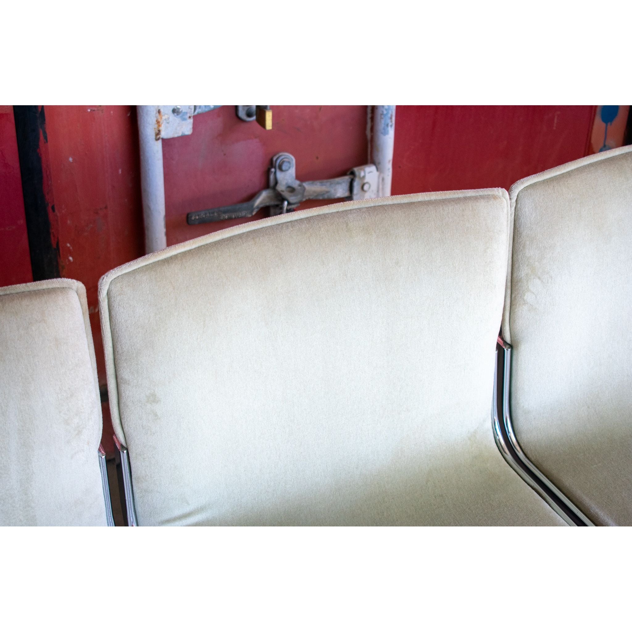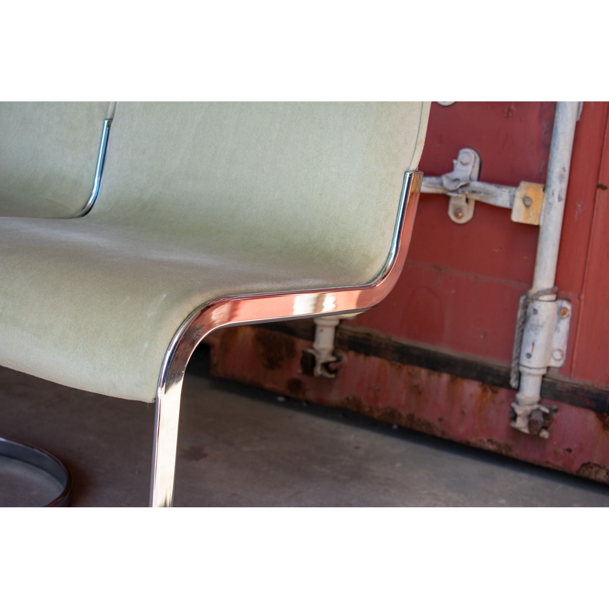 • Condition: Good vintage condition; chrome frames cleaned and polished with minor marks, light sage velour upholstery cleaned with some residual wear