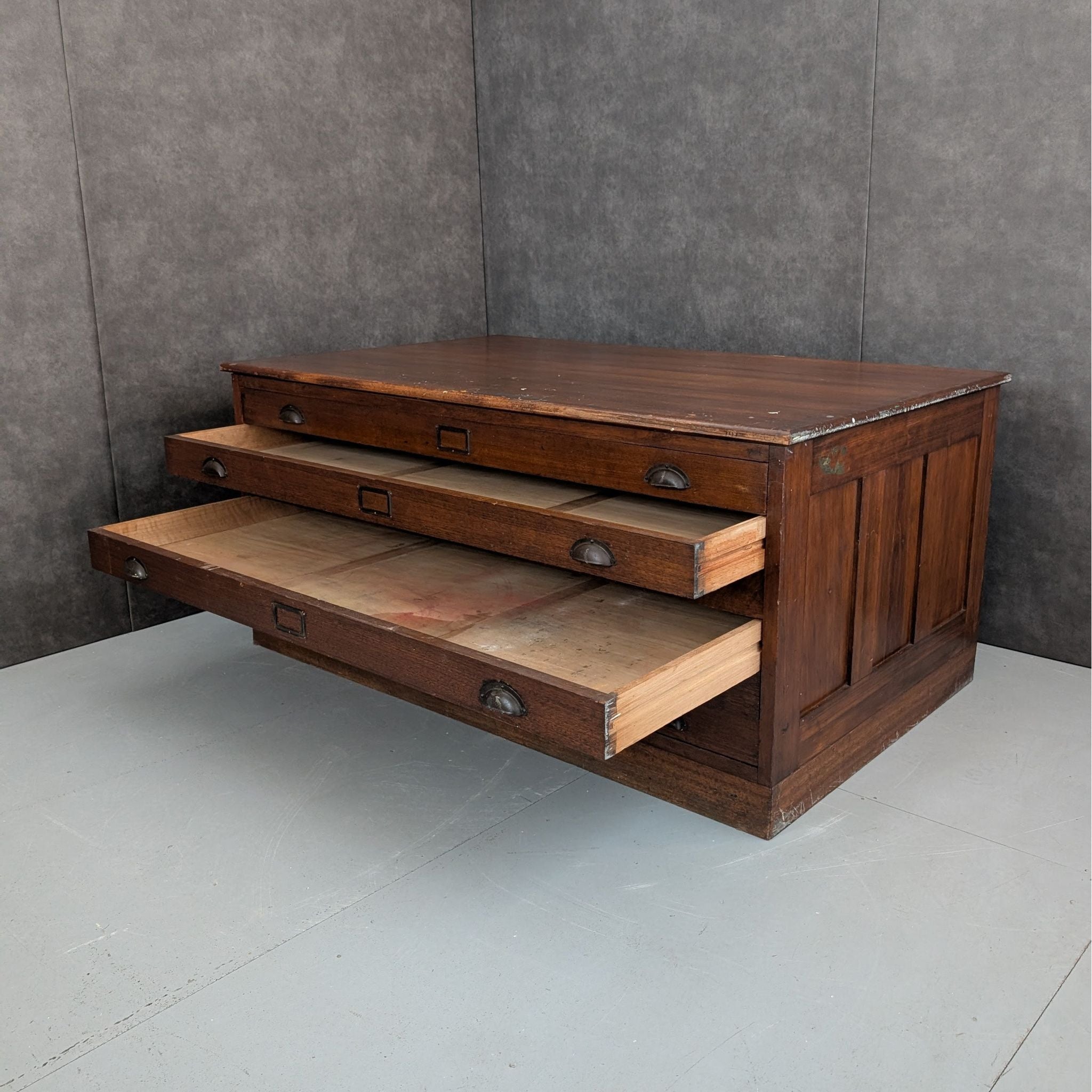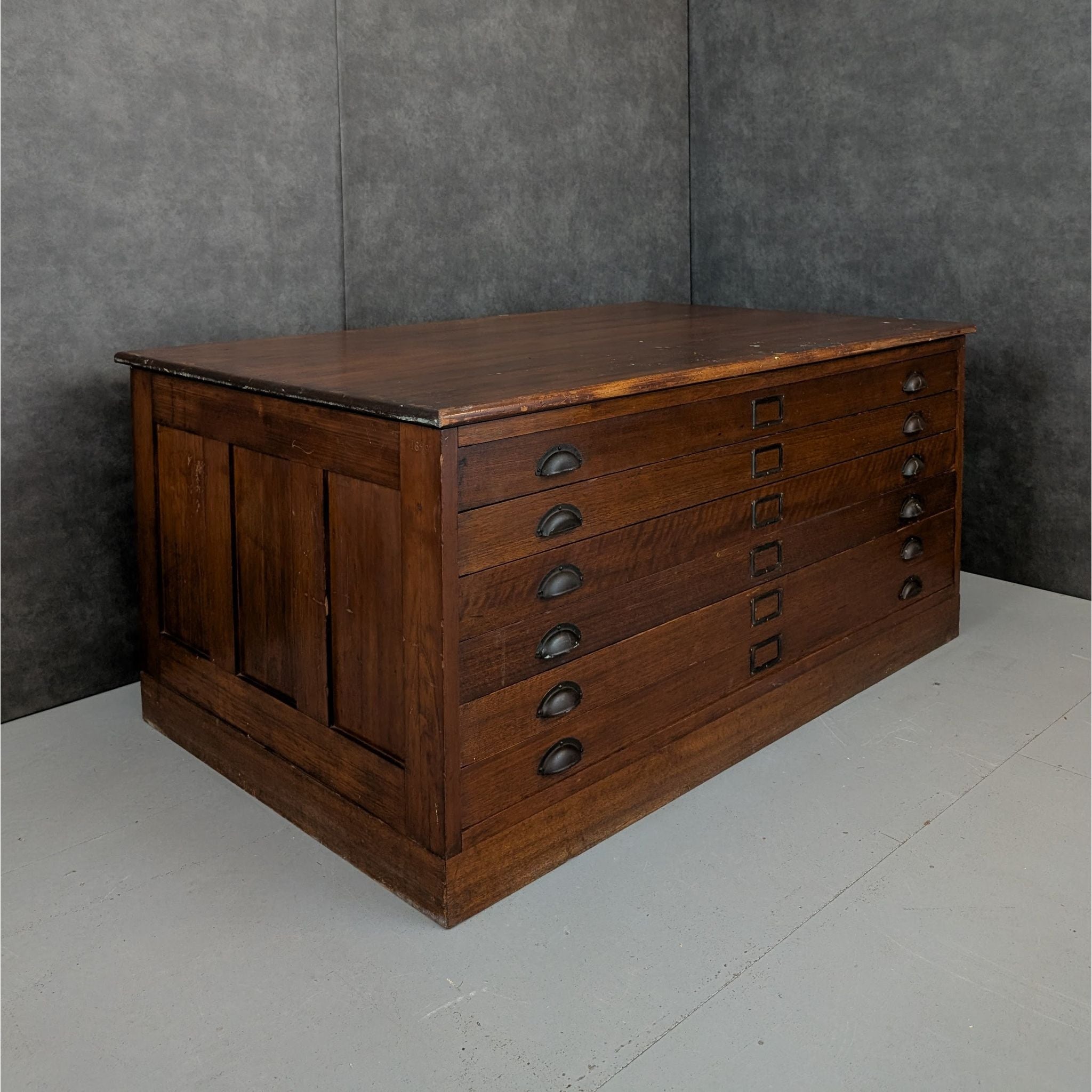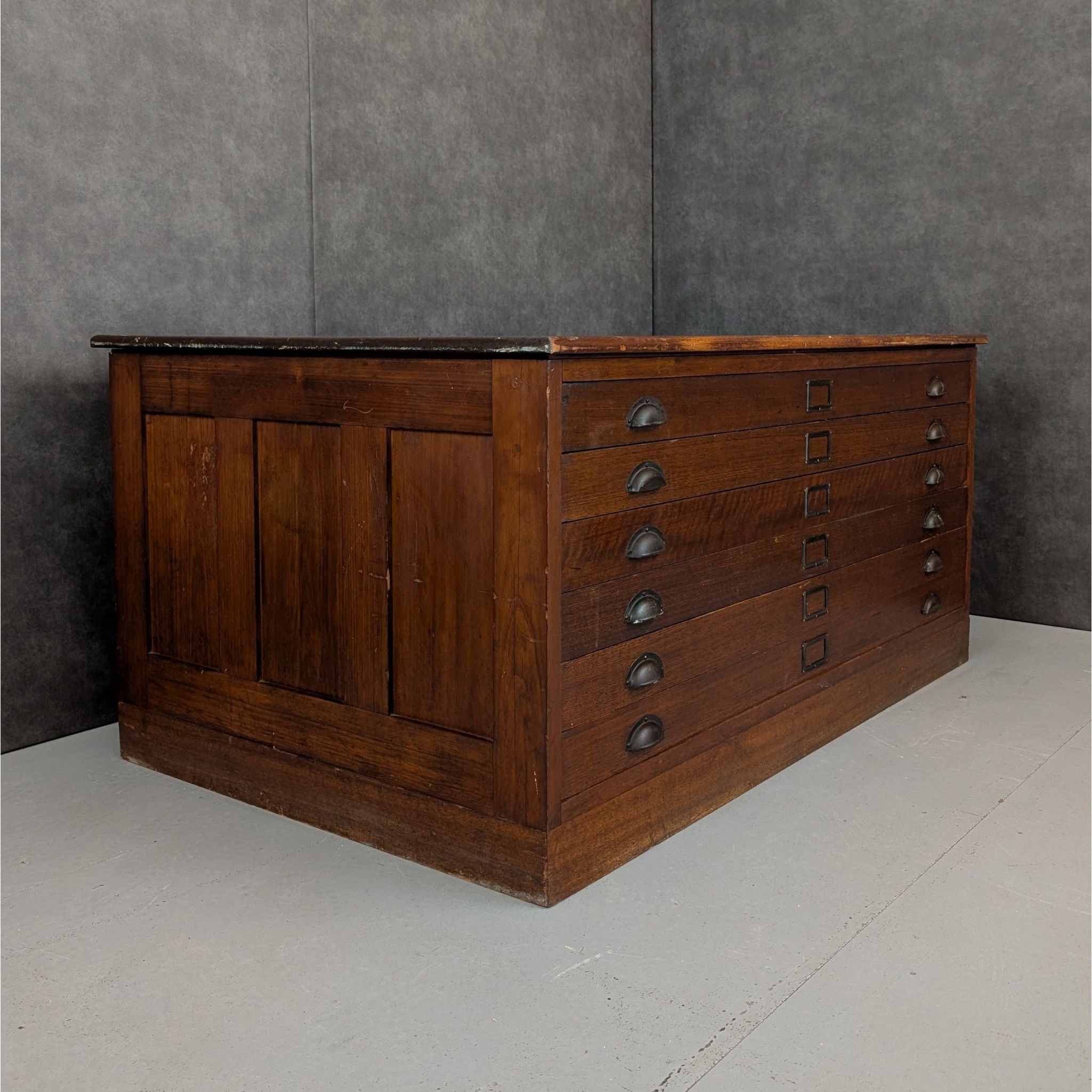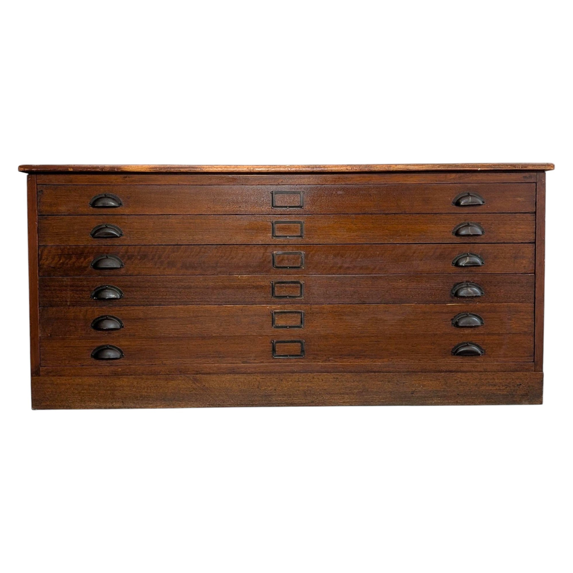 Built with the quiet authority of early twentieth century utility furniture, this substantial plan cabinet brings depth, weight and intention to a room without ornament. Made circa 1920, this solid timber plan cabinet was designed for architectural drawings, maps or technical documents, reflected in its low profile proportions and six broad drawers fitted with original metal cup pulls and label holders. The construction is robust and purposeful, with thick timber boards, framed panel sides and a heavy top bearing the marks of long professional use. Once a working object of precision and order, it now carries that same grounded presence into studios, galleries and considered interiors, offering storage as structure rather than decoration.