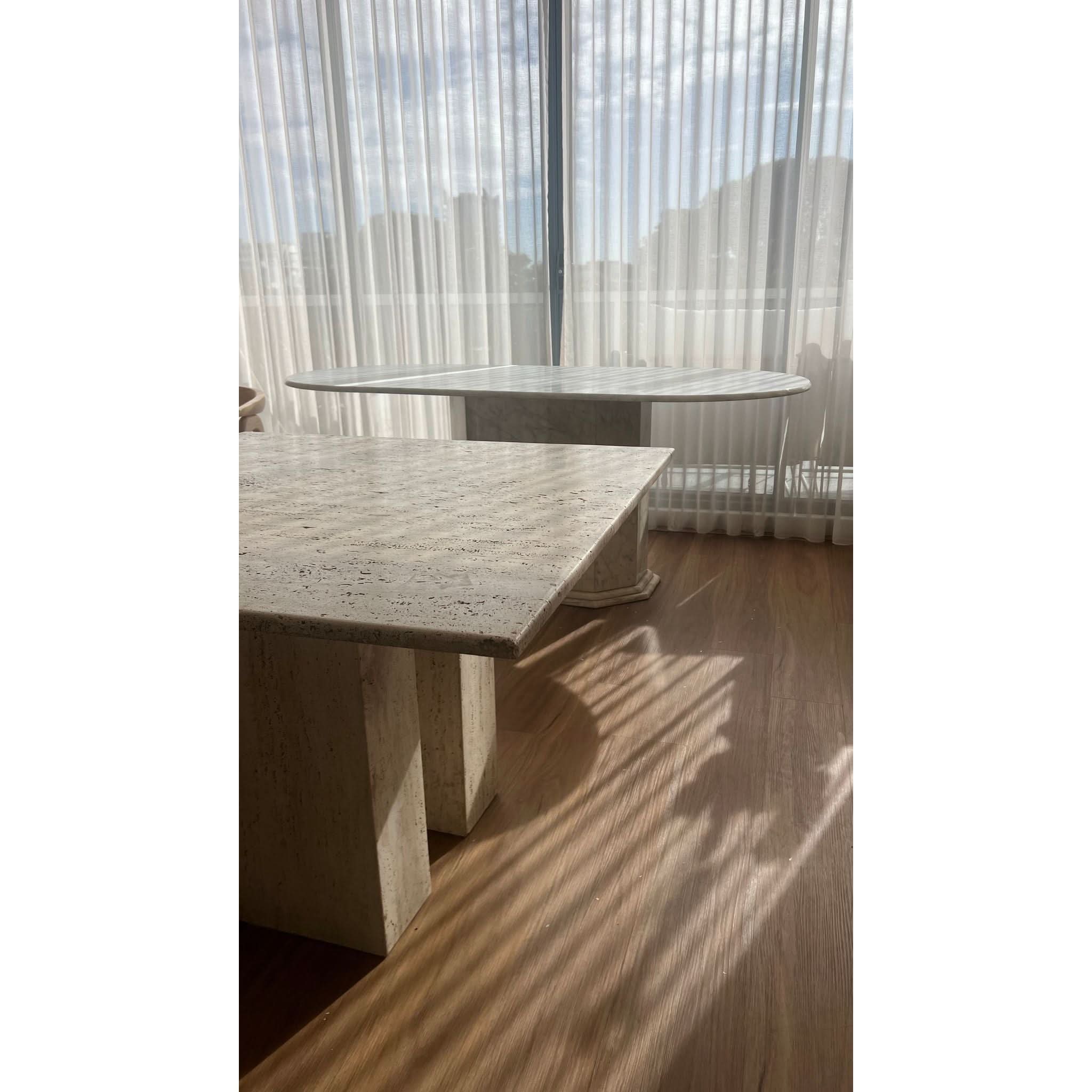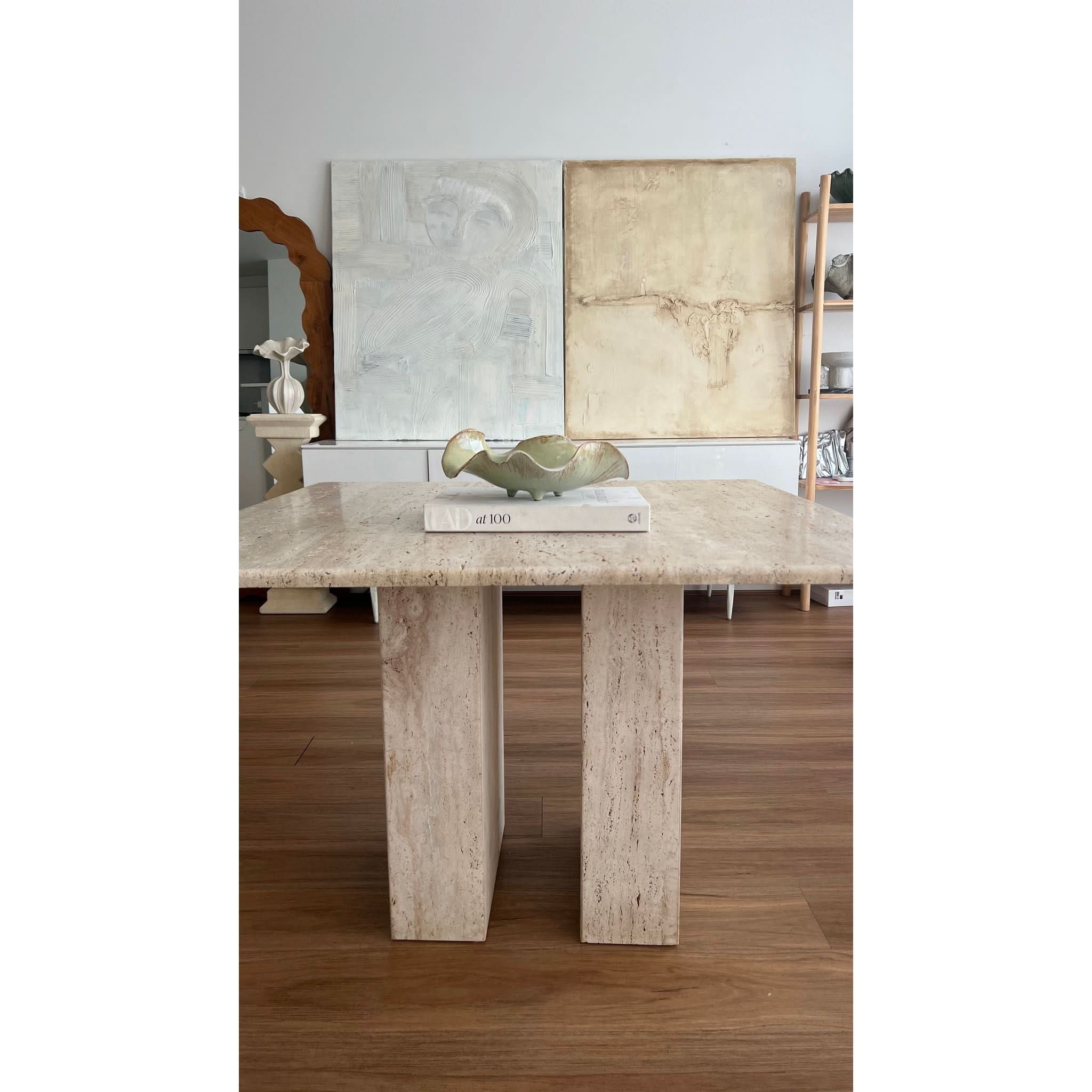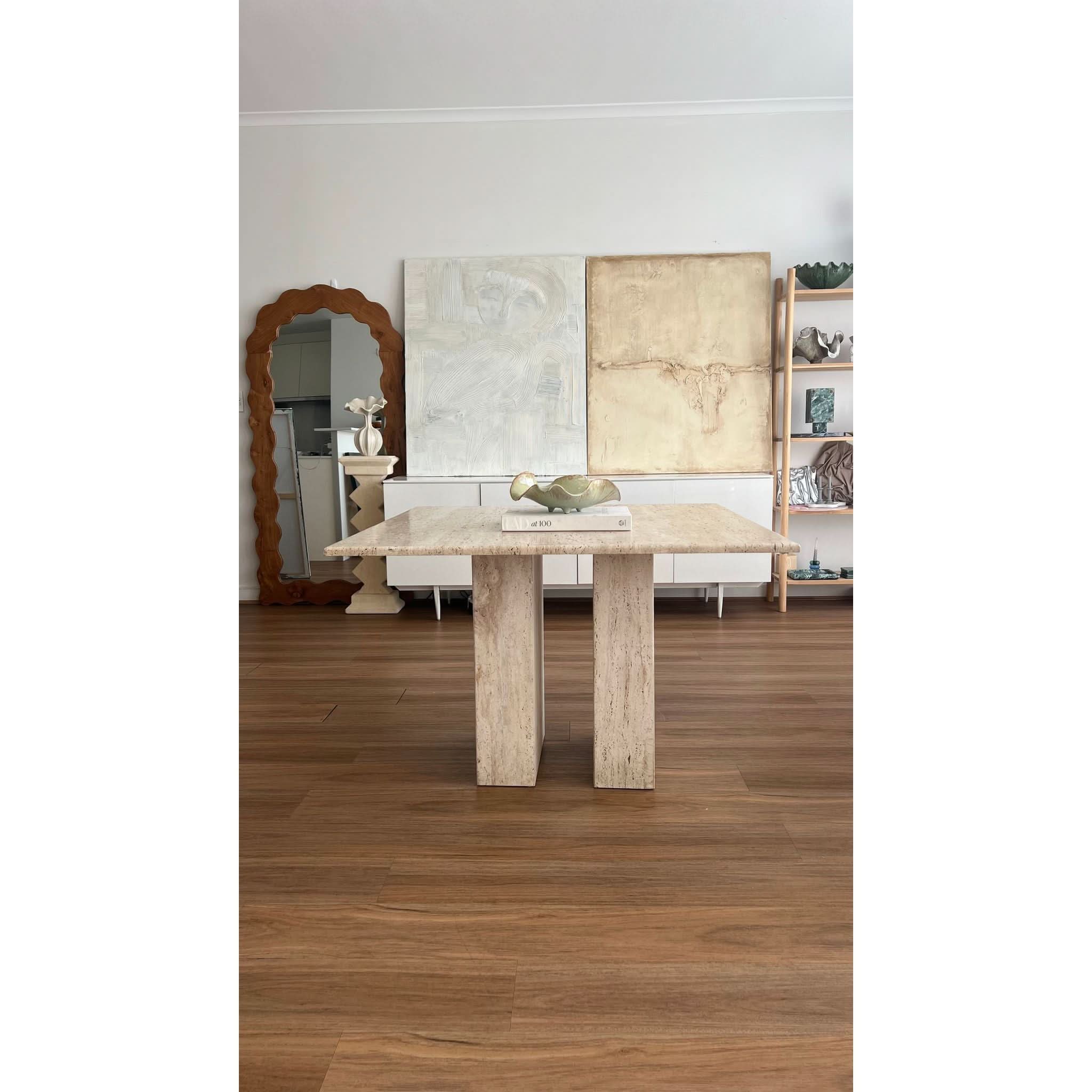 A beautiful and very rare table made from vintage unfilled travertine. Beautiful plinth like legs give it arch digest vibes, a very rare and striking statement piece.