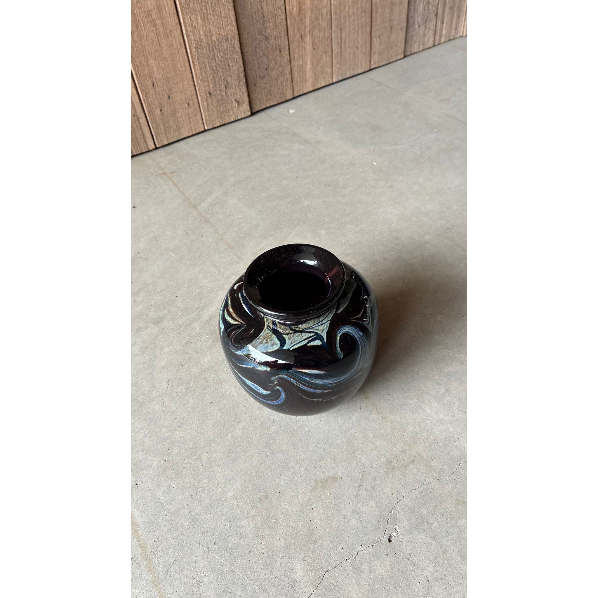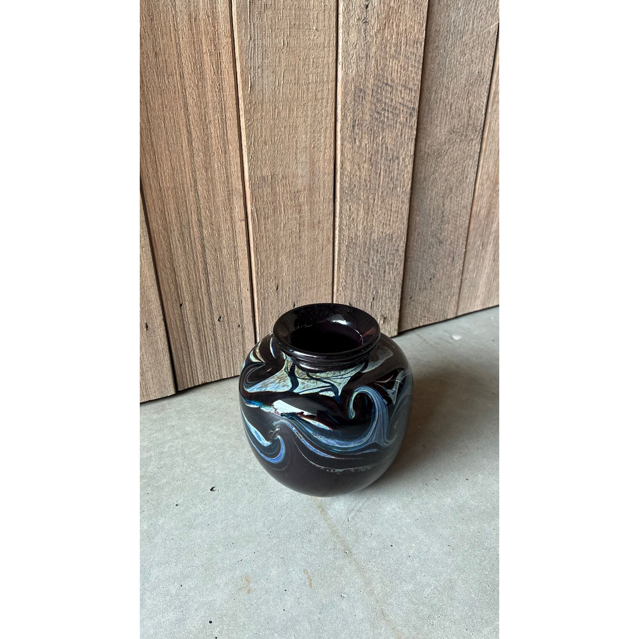 A sculptural studio-made glass vase with a deep inky base and soft hand pulled blue swirls. The feathered wave pattern is created by manipulating molten glass, giving the piece an expressive, fluid movement unique to handmade studio work.