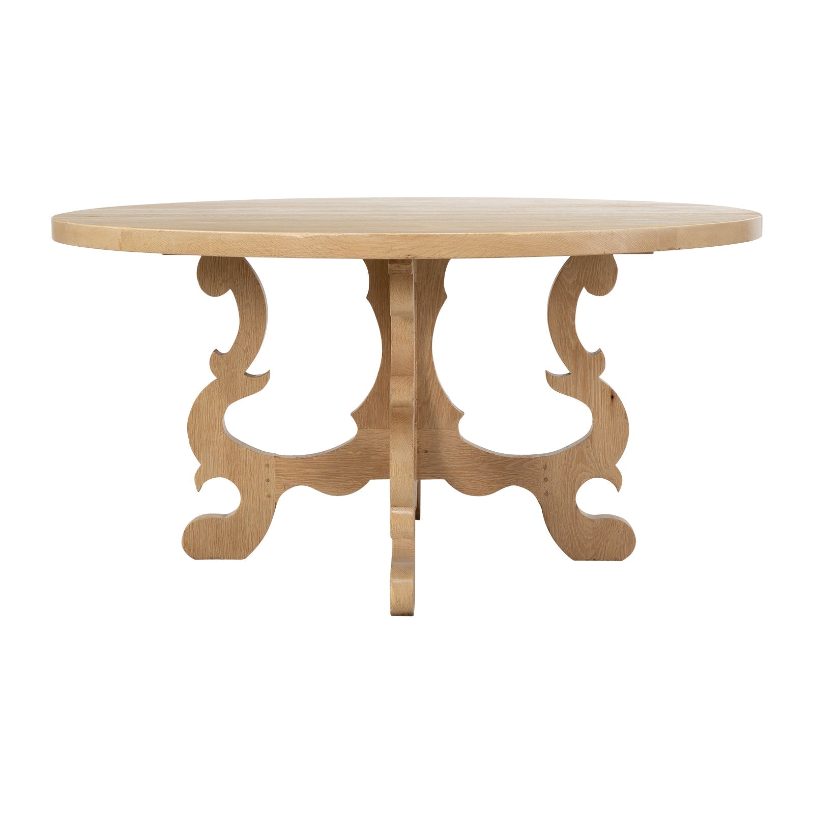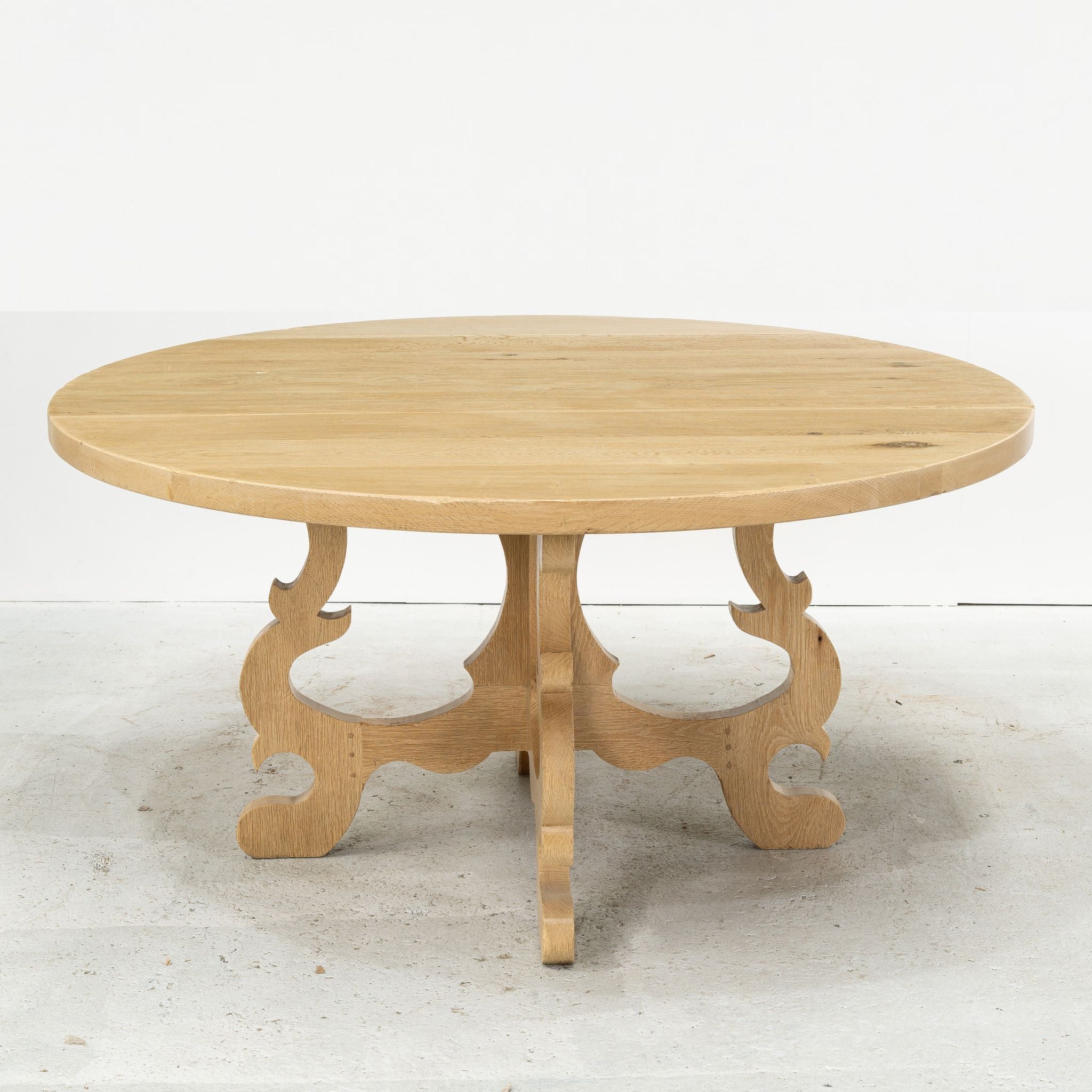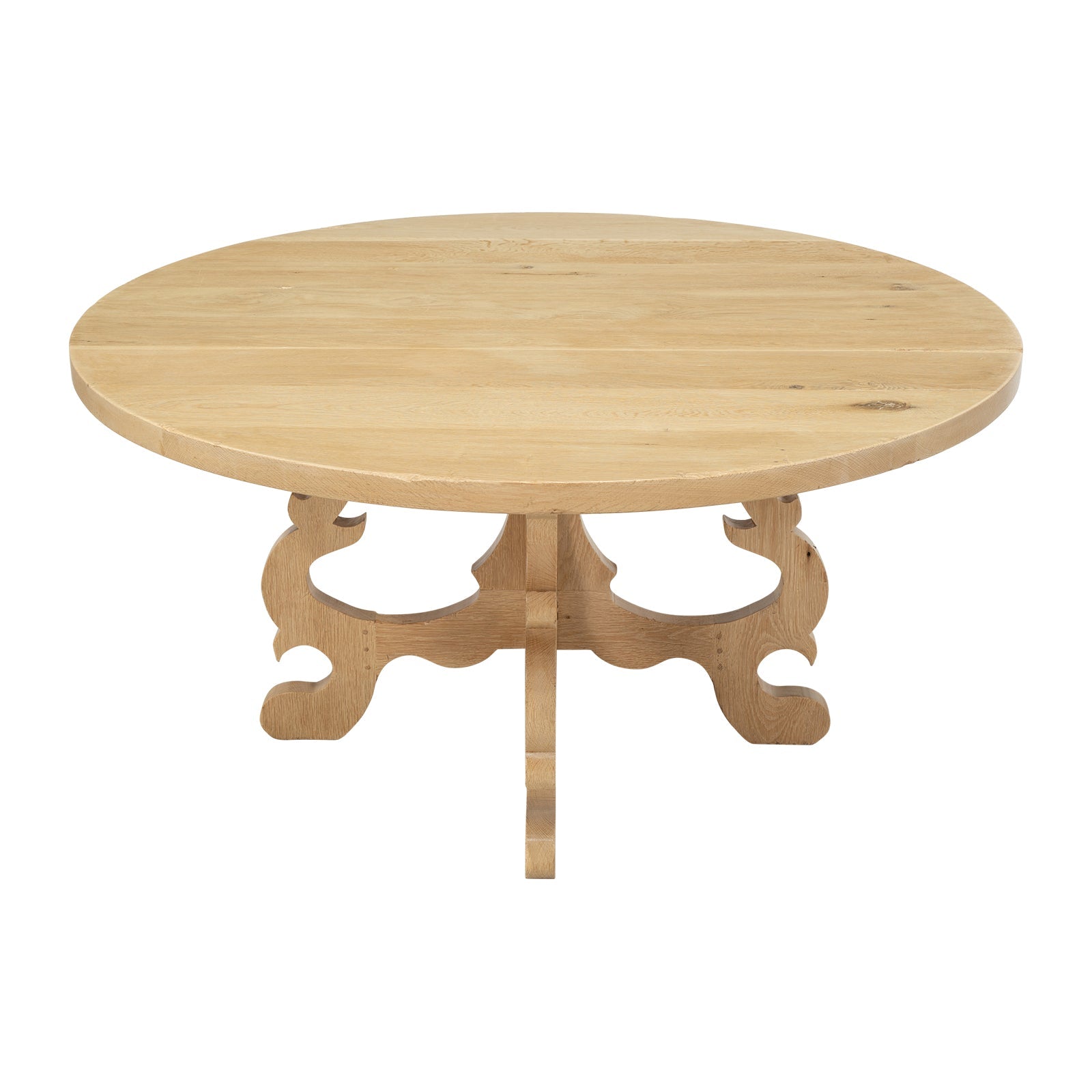 The generously proportioned circular top features solid wood planking finished in warm bleached oak, creating an inviting surface that showcases natural grain patterns and subtle colour variations characteristic of quality timber.