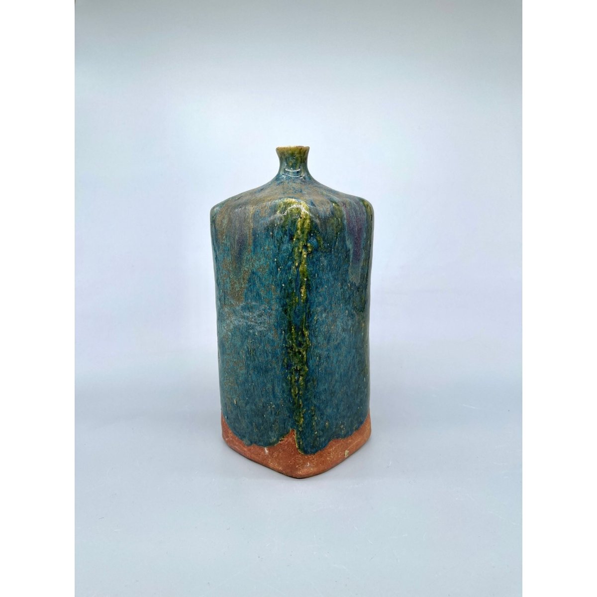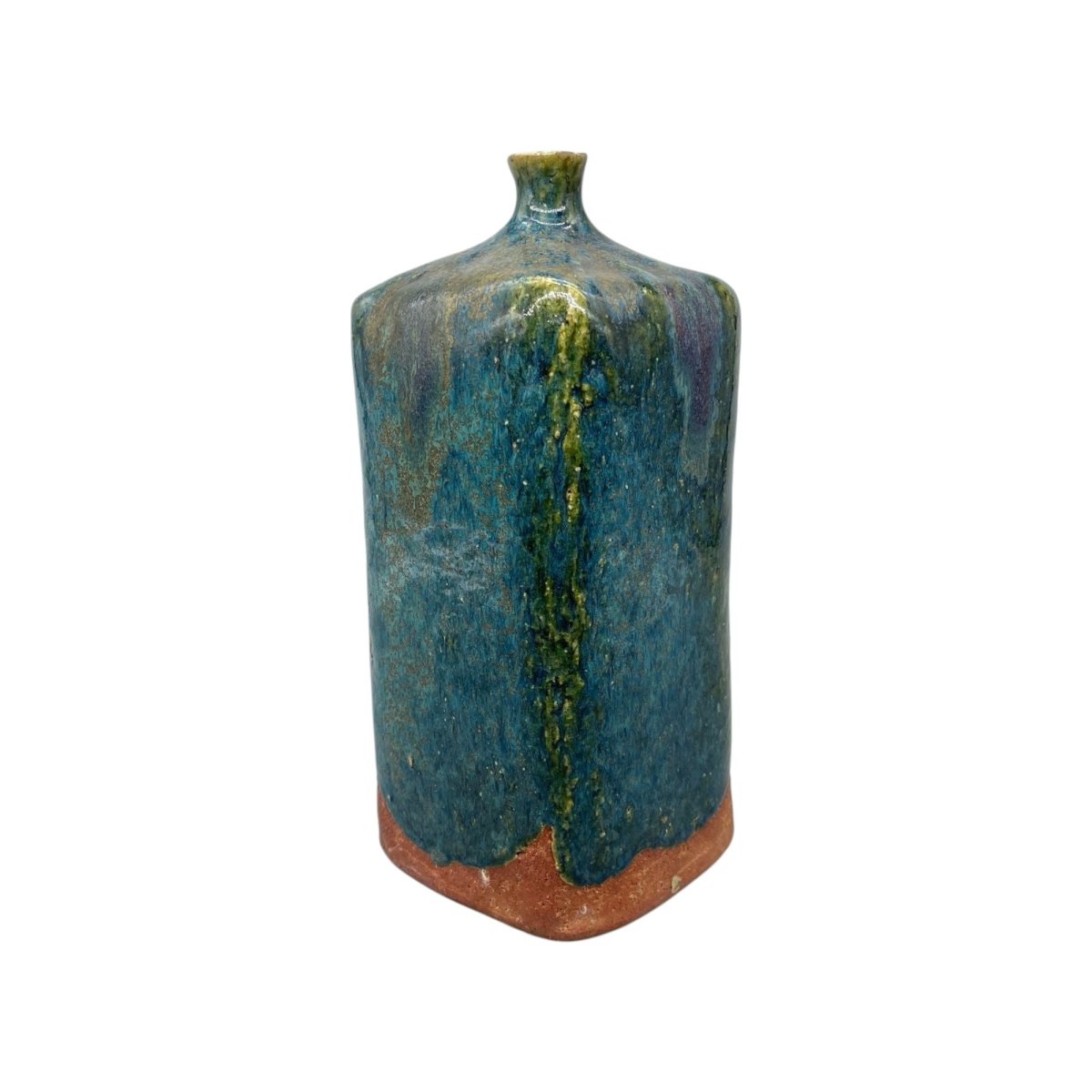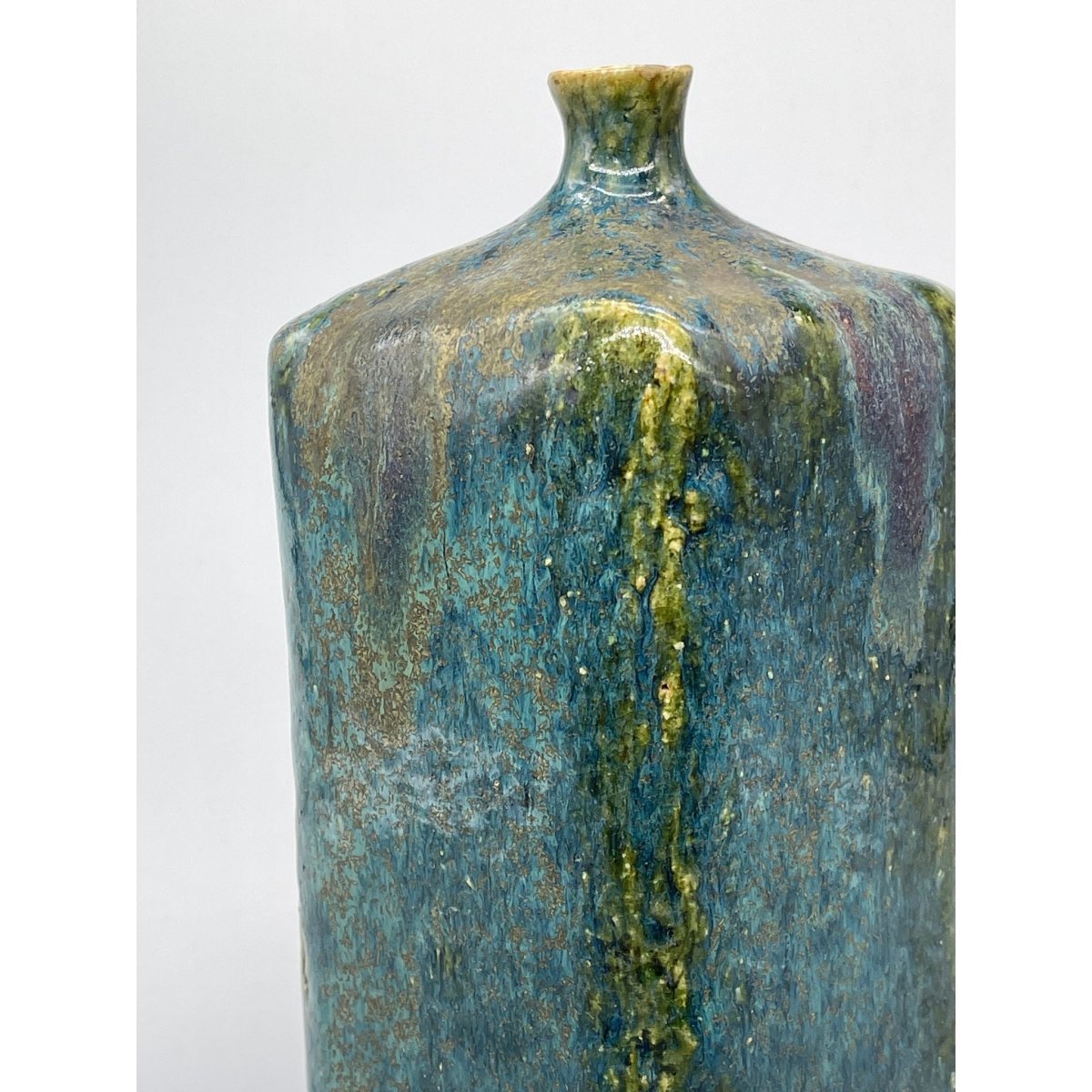 This piece features a drip glaze of greens, blues, and browns, a narrow opening, and an artists signature.