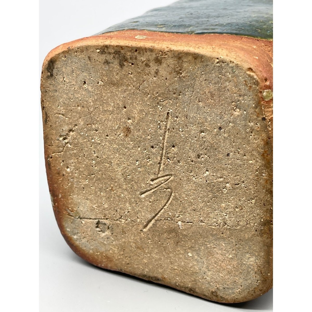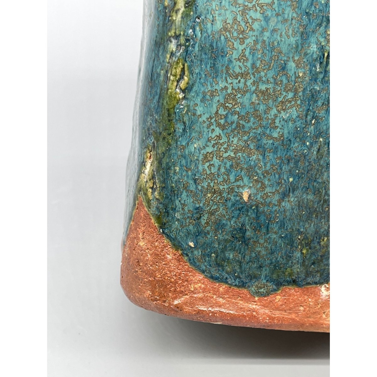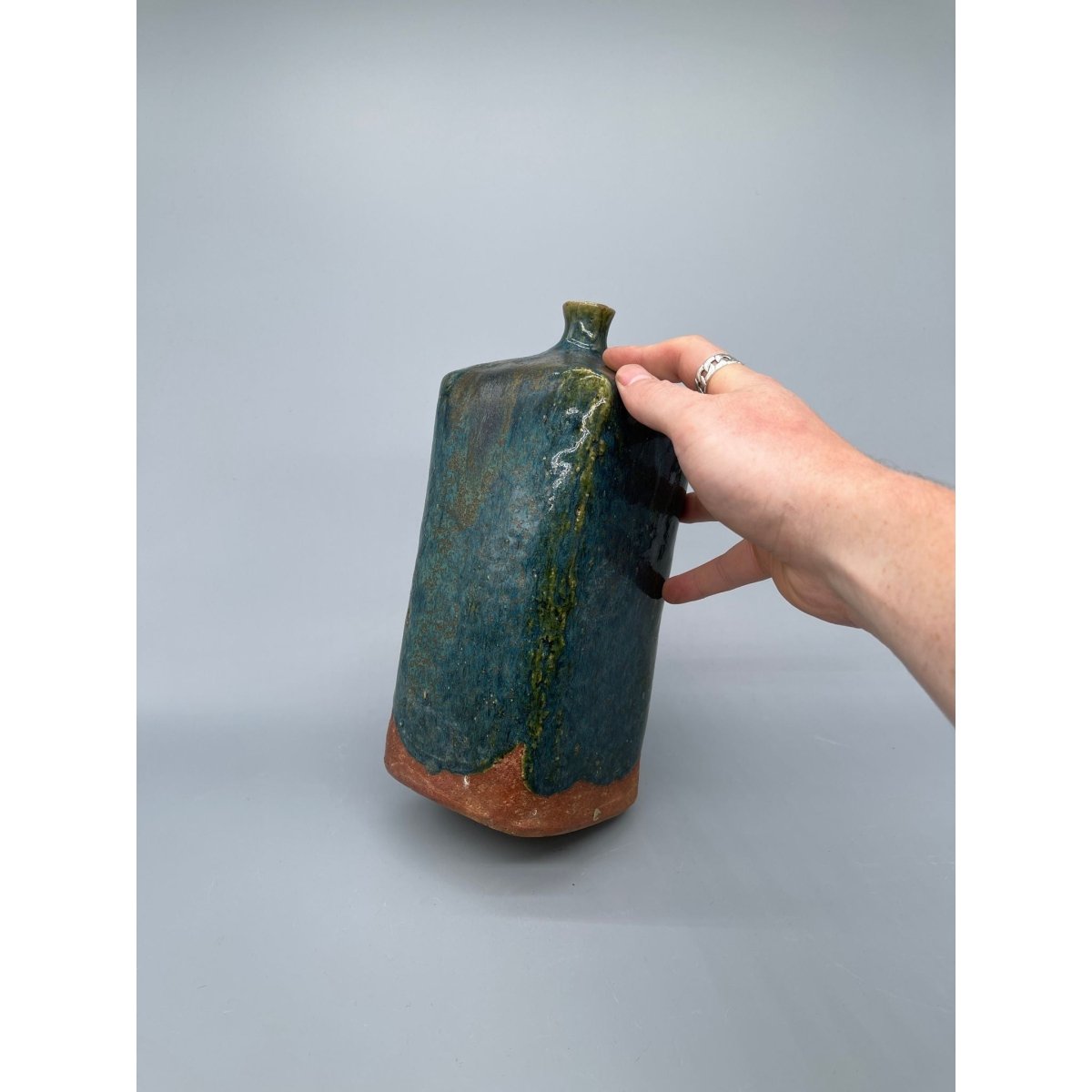 This piece features a drip glaze of greens, blues, and browns, a narrow opening, and an artists signature.