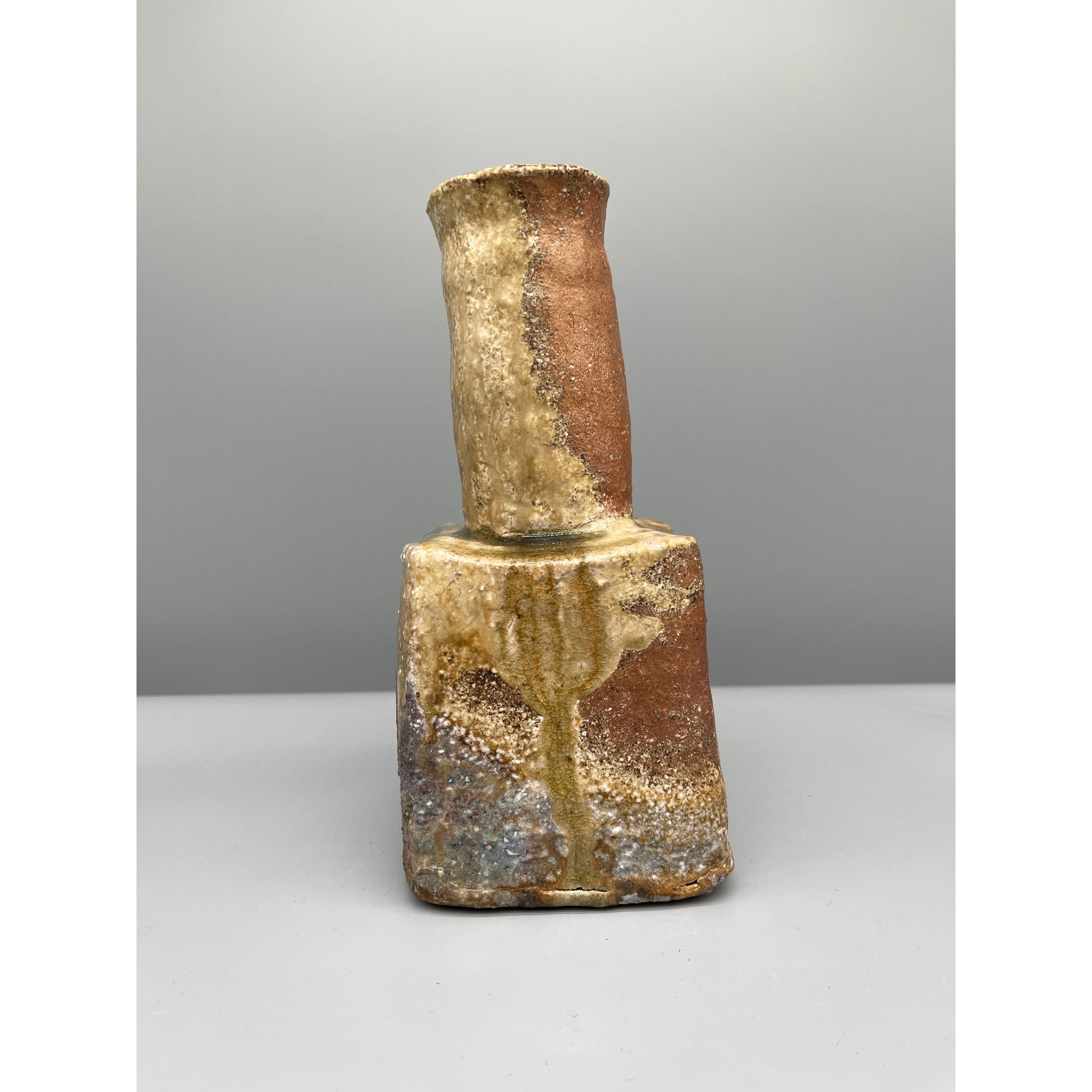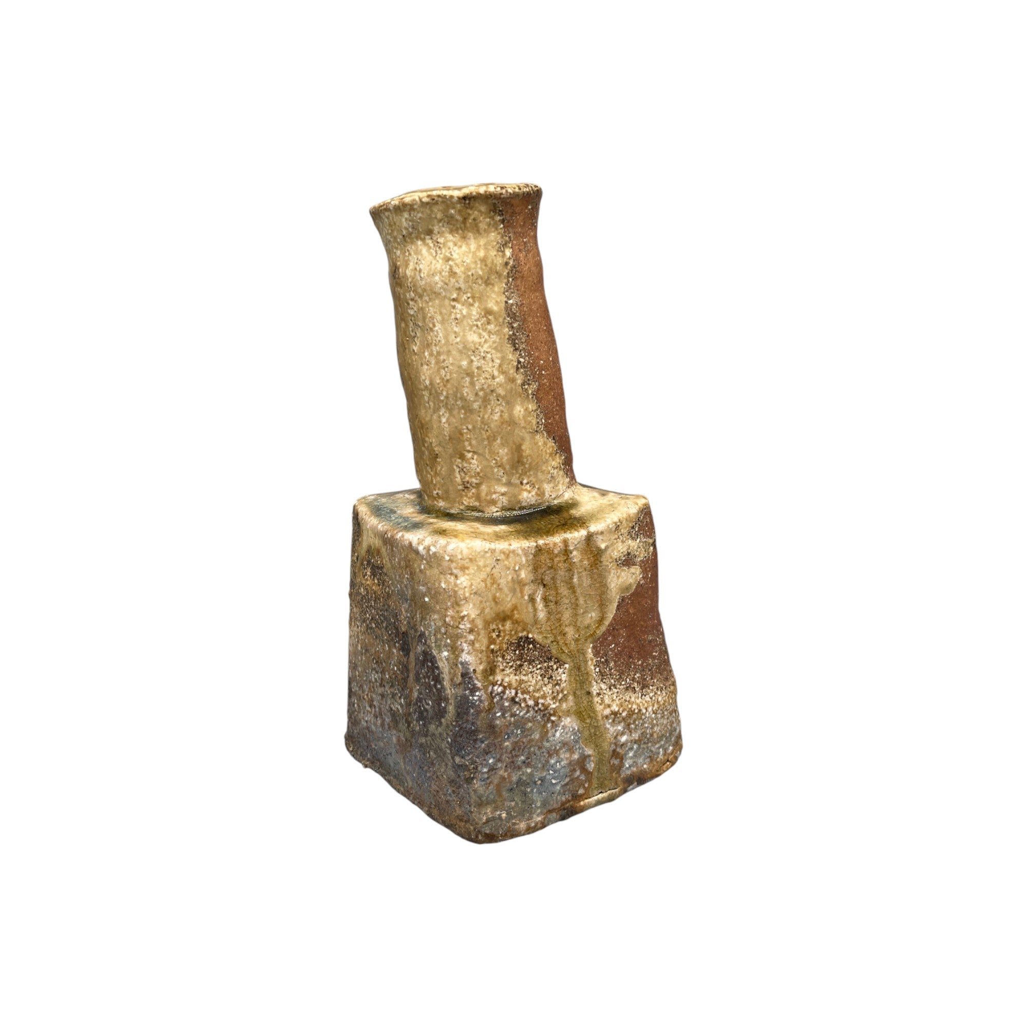 A vintage Japanese hand-crafted pottery vase with a unique, sculptural shape and a natural earthy glaze.